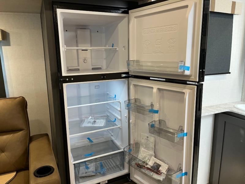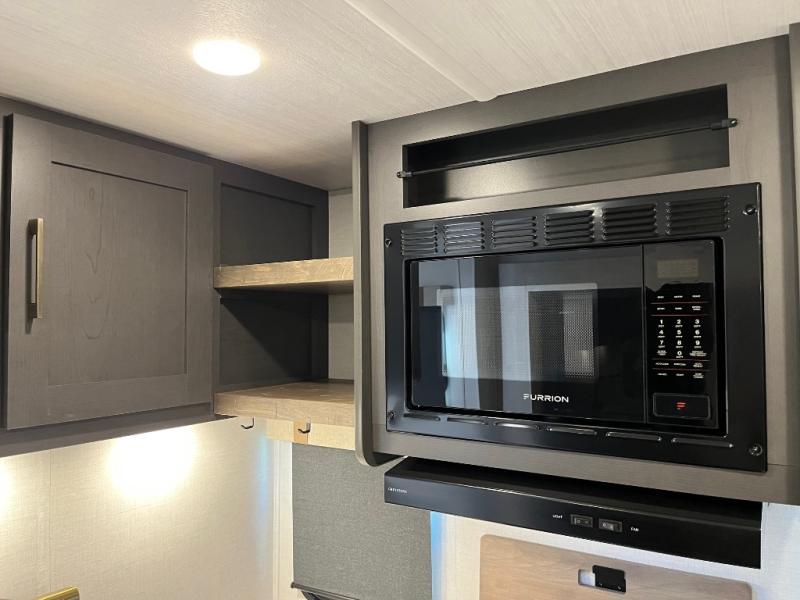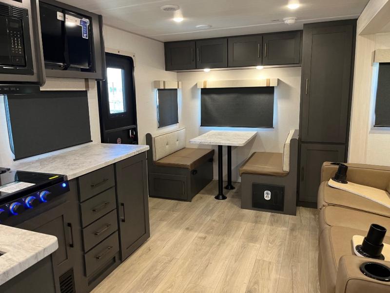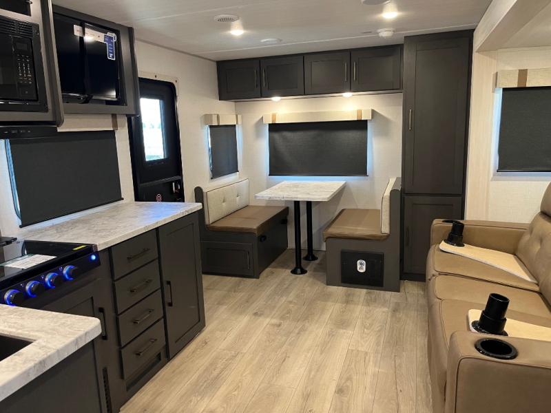 Camping trips to the lake just got sweeter in this single slide out travel trailer! There is a front master bedroom with a queen bed and dual wardrobes to keep your clothes organized, and the walk-thru bath is easily accessible. You can make meals each day with the microwave air fryer, and keep your food stocked up in the refrigerator and large pantry. After dinner, you can play a game at the rear booth dinette or relax on the sofa slide out if it's not a campfire night!
