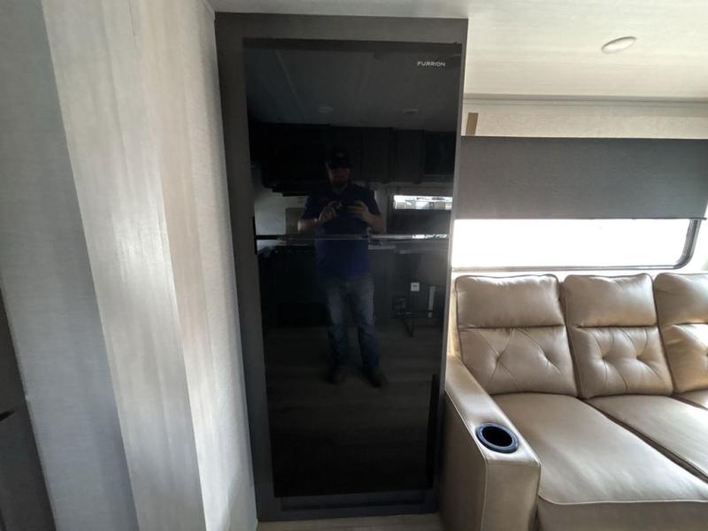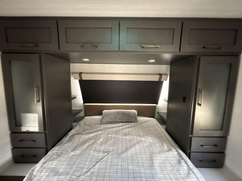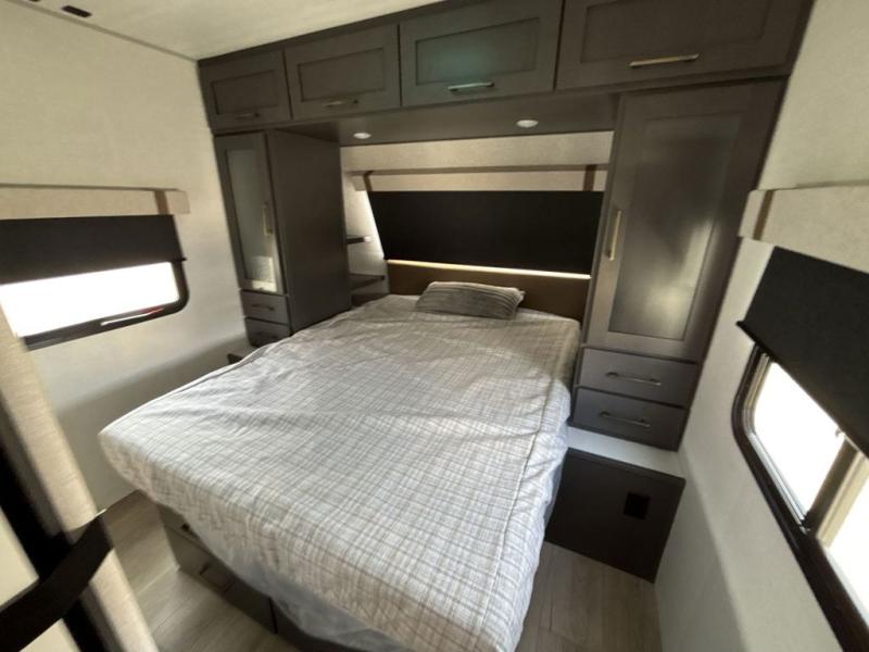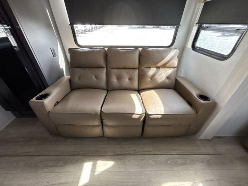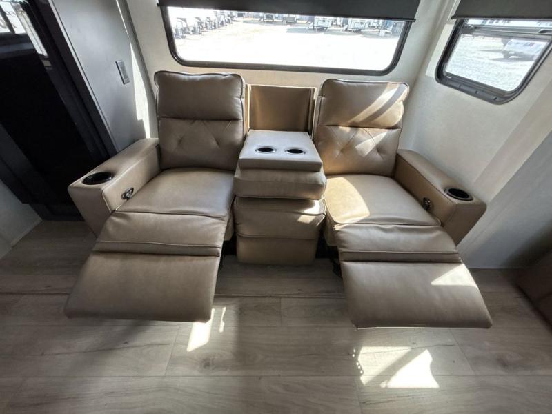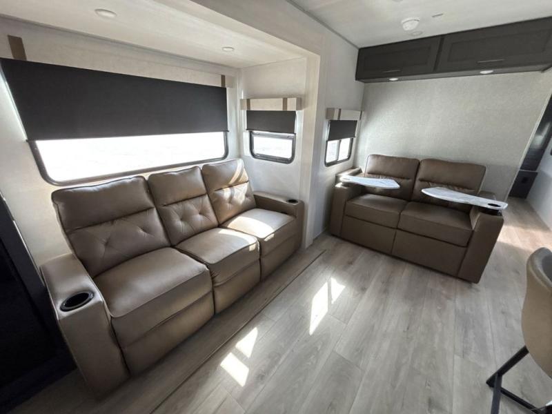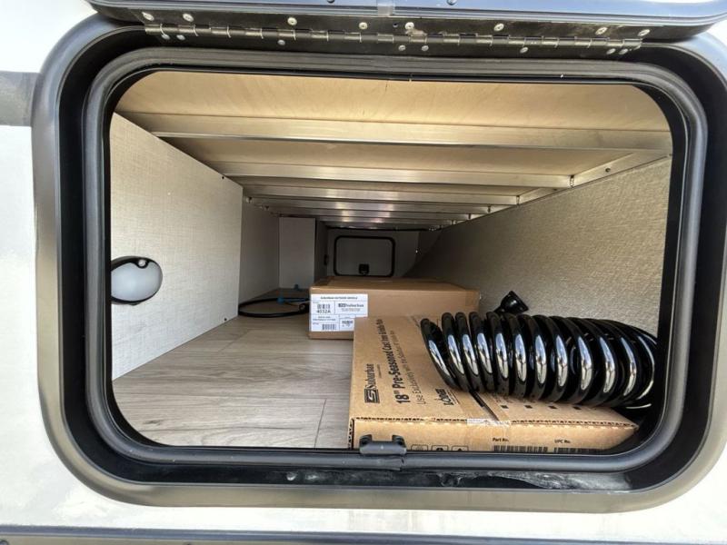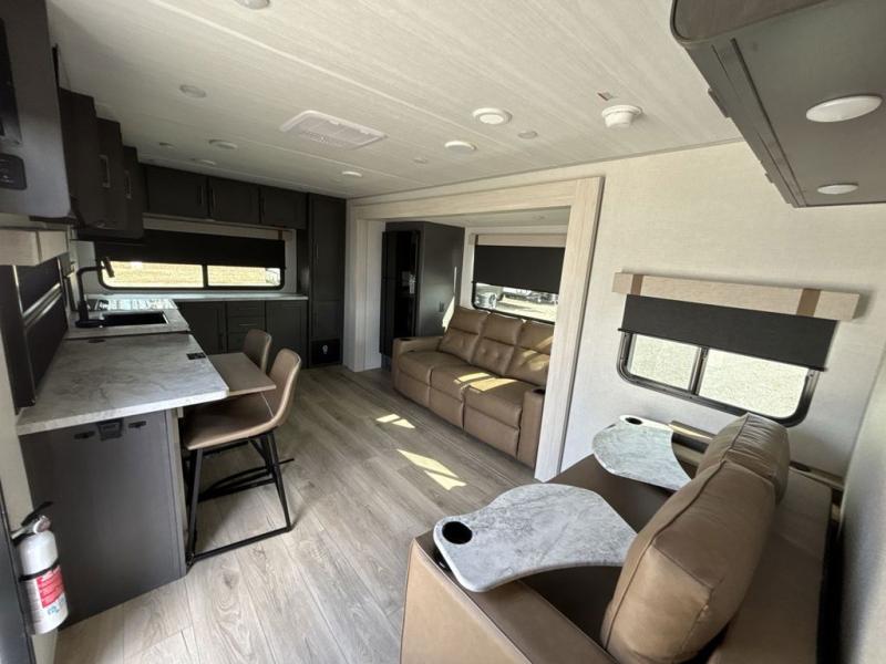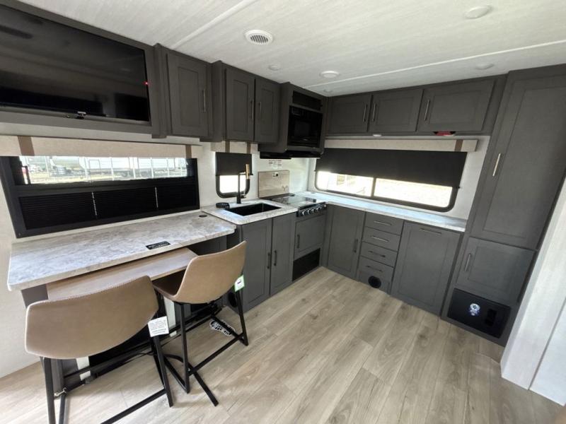 Pack your bags and head for the lake in this spacious travel trailer! Once you've set up camp, you can unload the slam latch cargo doors with pass-thru lighting, then start lunch on the outside kitchen. If you don't want to eat outdoors, there is a Bar 2 Table pull-out dinette table, theater seating, and a tri-fold sofa for ample seating spaces. The flip-up window in front of the dinette will give you a great view as you enjoy your coffee each morning, and the full bath onboard will let you freshen up after a day of hiking. This unit also includes a rear kitchen with ample counter space, plus a front private bedroom, complete with a queen bed, dual wardrobes, and washer/dryer prep! When the optional Black Canyon Beast Mode Package is chosen on this model, you'll find an independent suspension, an additional 200-watt solar panel, totaling 400 watts of solar, a 2000-watt inverter and more!
