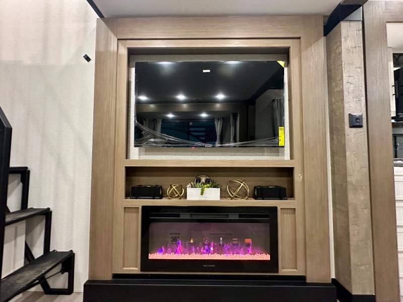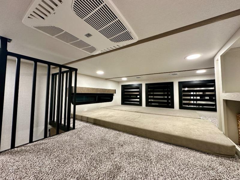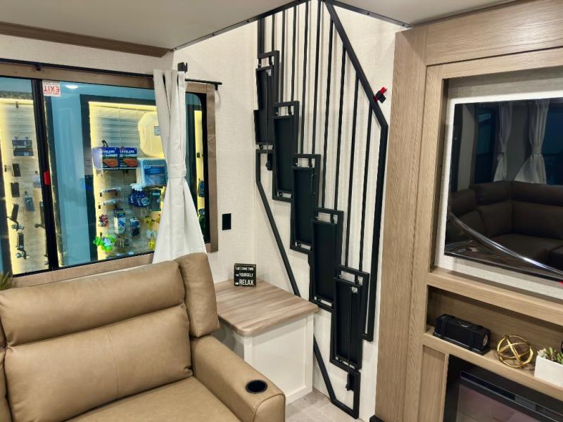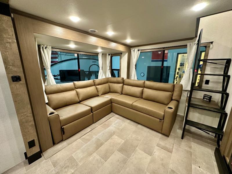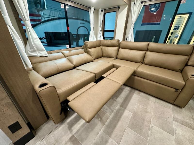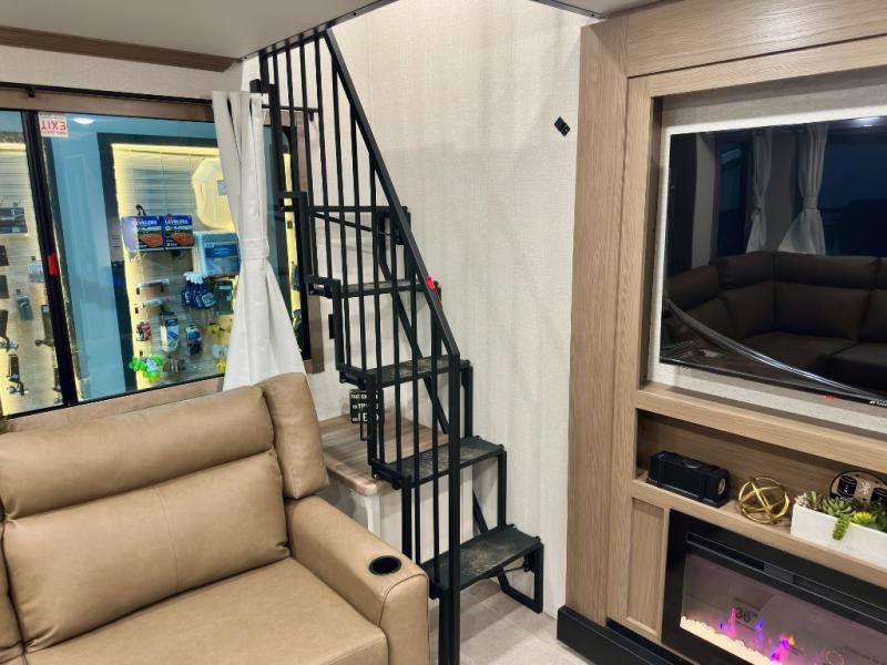 Stay in comfort with this four slide out fifth wheel! There is a triple-slide patio door that opens into the kitchen, complete with a kitchen island, floor to ceiling pantry and 16 cu. ft. 12V refrigerator, and a convenient half bath with storage. There are reclining seats with a chaise lounge across from an entertainment center and fireplace. The fold-up steps lead up to the loft that includes two bunk mats, a wardrobe, cubby storage, plus windows, which will make this space bright and open. The full bath towards the front includes washer/dryer prep, a walk-in shower with a skylight, and a linen closet to keep towels close by. And you'll love having your own bedroom up front with a king bed with Versa Tilt, a dresser with a bench, and a front wardrobe to keep your clothes wrinkle-free!