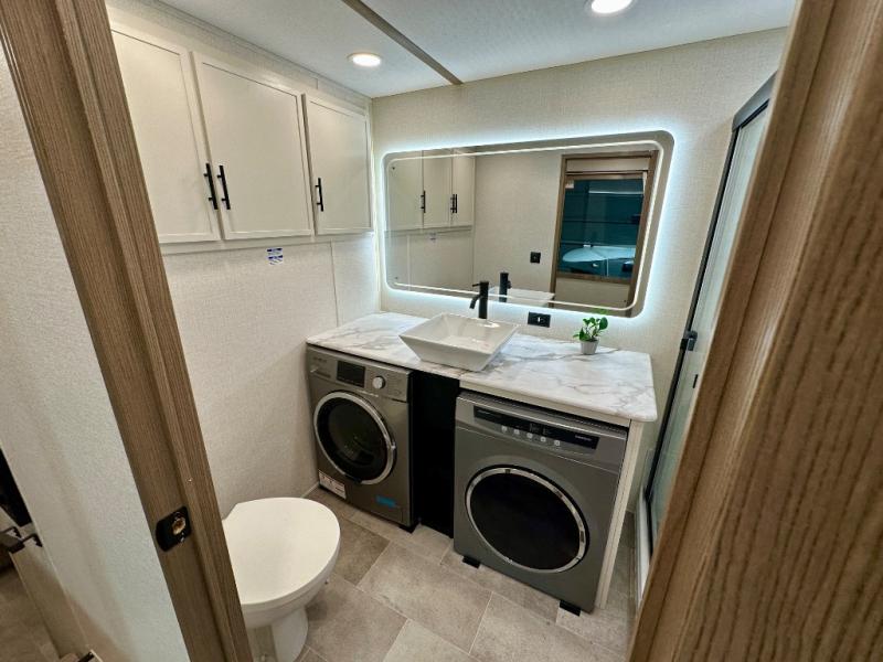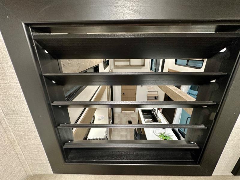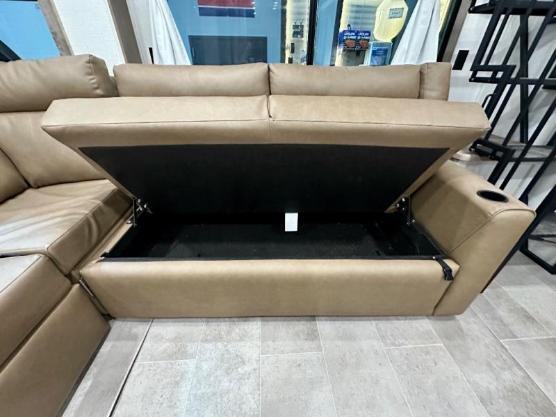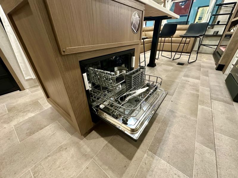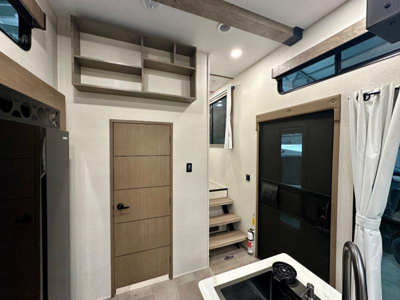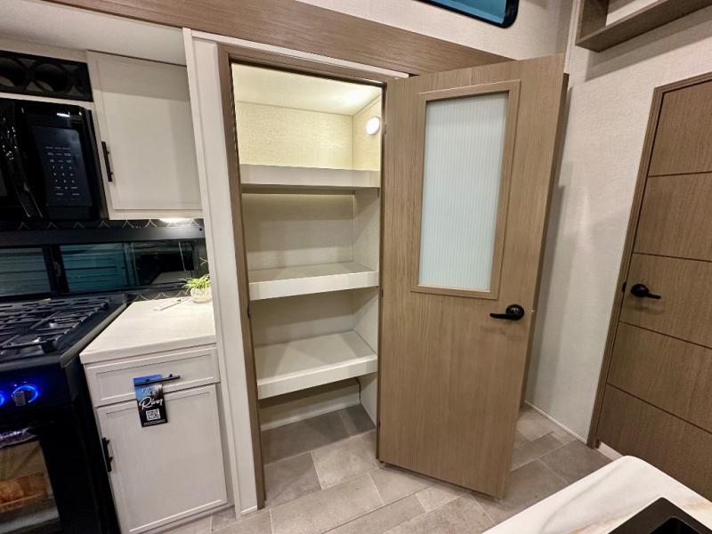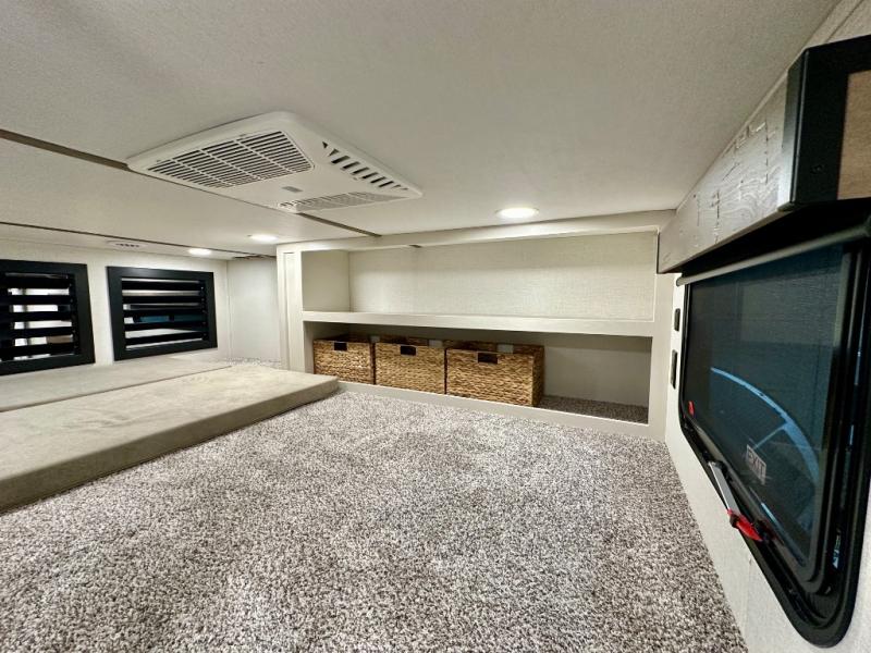 Stay in comfort with this four slide out fifth wheel! There is a triple-slide patio door that opens into the kitchen, complete with a kitchen island, floor to ceiling pantry and 16 cu. ft. 12V refrigerator, and a convenient half bath with storage. There are reclining seats with a chaise lounge across from an entertainment center and fireplace. The fold-up steps lead up to the loft that includes two bunk mats, a wardrobe, cubby storage, plus windows, which will make this space bright and open. The full bath towards the front includes washer/dryer prep, a walk-in shower with a skylight, and a linen closet to keep towels close by. And you'll love having your own bedroom up front with a king bed with Versa Tilt, a dresser with a bench, and a front wardrobe to keep your clothes wrinkle-free!