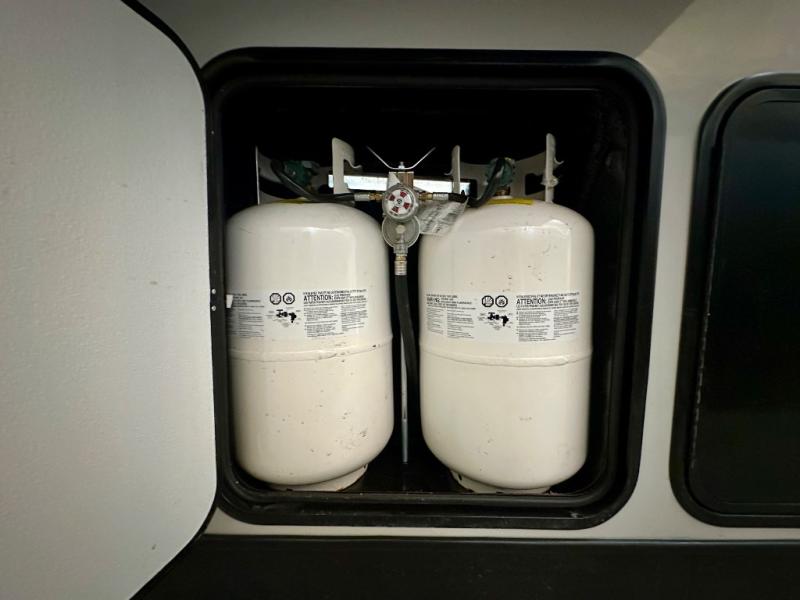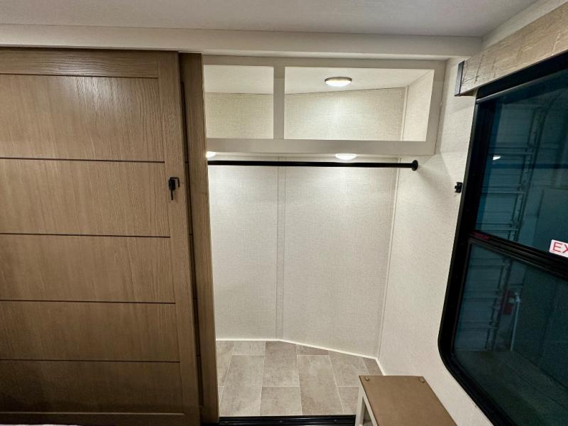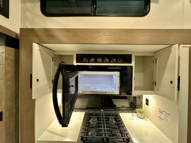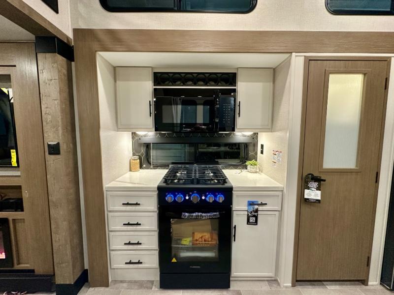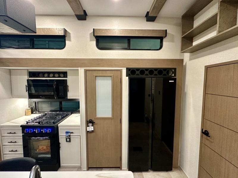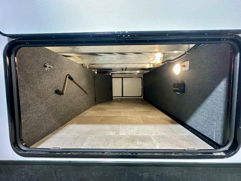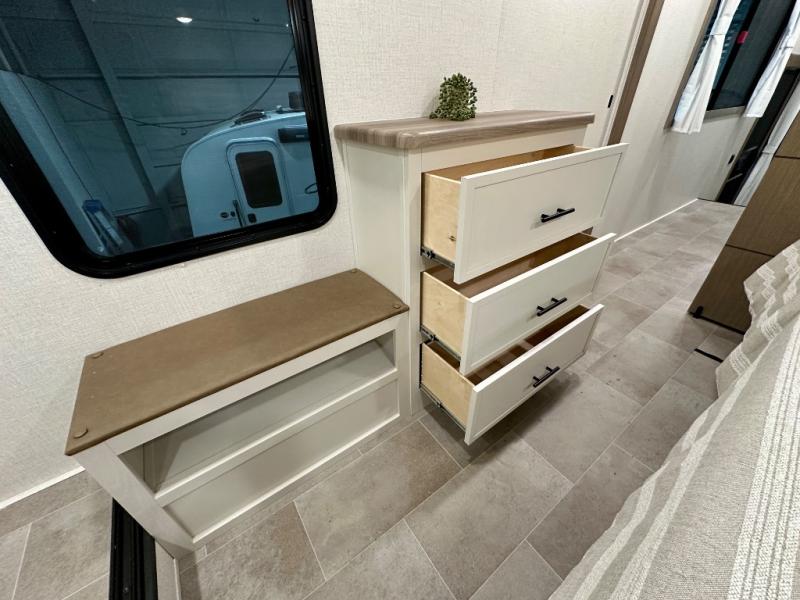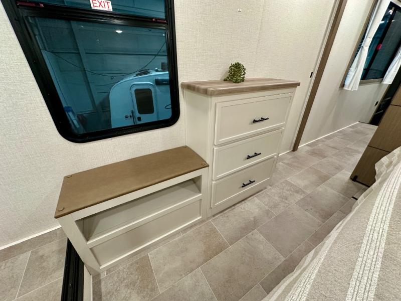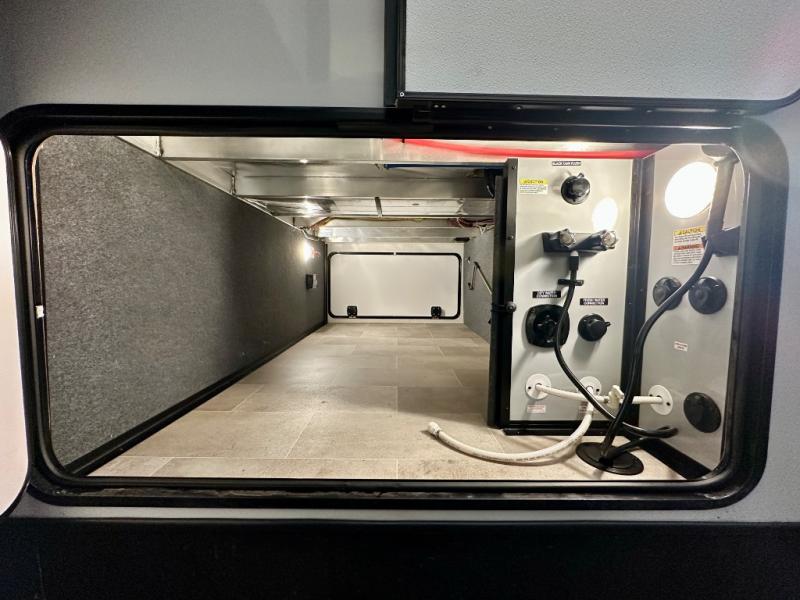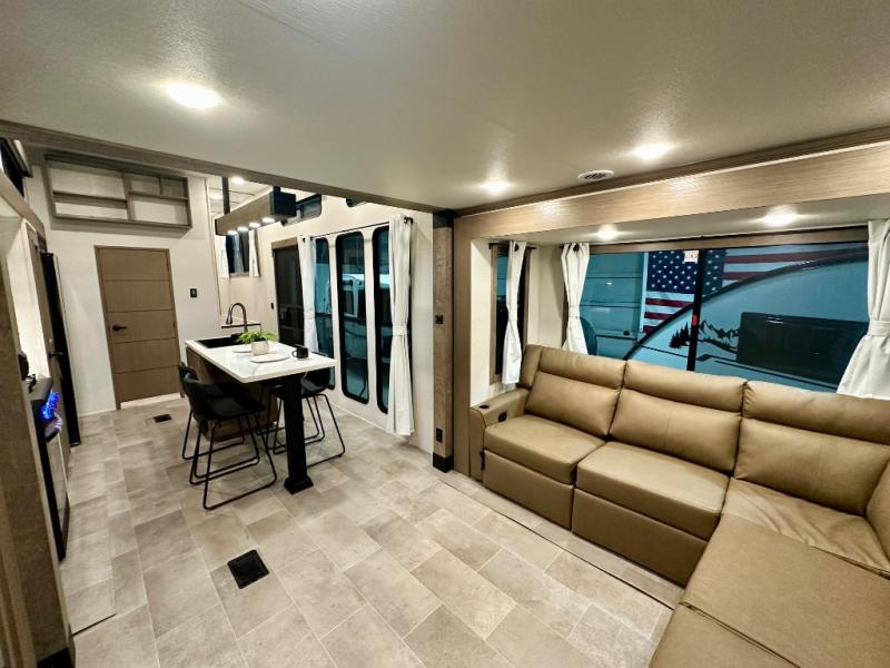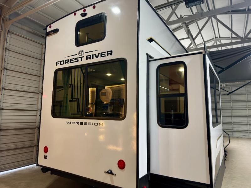 With any Impression fifth wheel by Forest River, the focus of the design is comfort and value, built with quality craftsmanship and attention to customer's desires in each Impression! The exterior includes upgraded E-rated tires, custom exterior graphics package, and insulated slam latch baggage doors. There is also an enclosed docking station, an outside shower, and a 100W roof panel for off-grid capabilities. The fully heated and enclosed AccessiBelly has removable underbelly panels along with enclosed tank valves. There is an industry leading 15K A/C plus 35K BTU furnace to keep you comfortable. The interior has lumbercore cabinetry, residential linoleum, residential backsplash in the kitchen, and oversized opening windows in the living area for more natural lighting and good air flow.