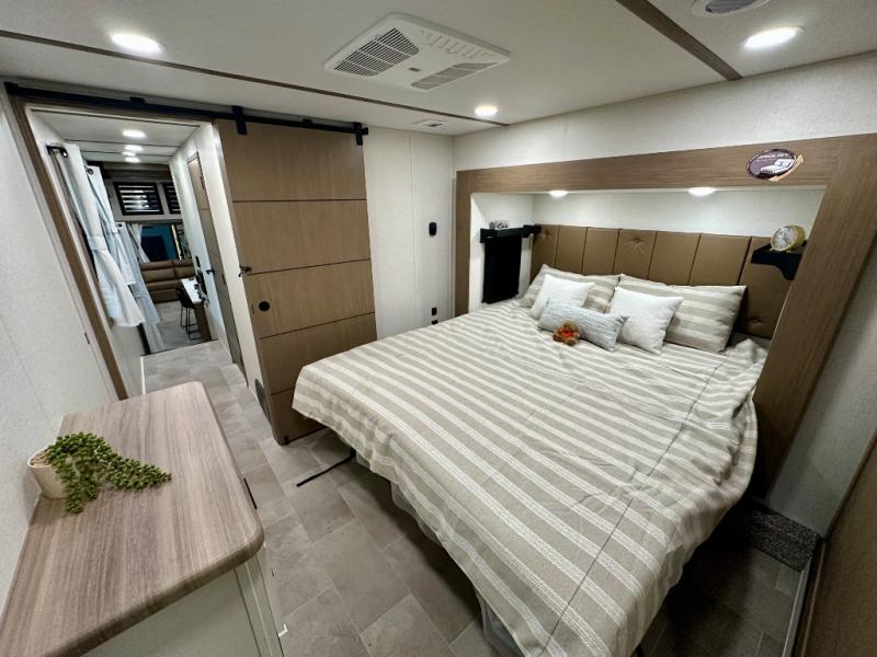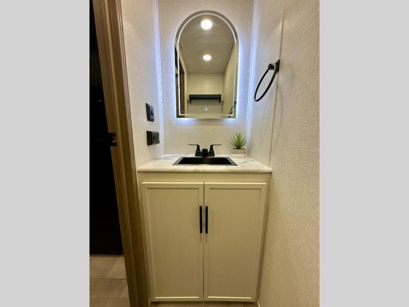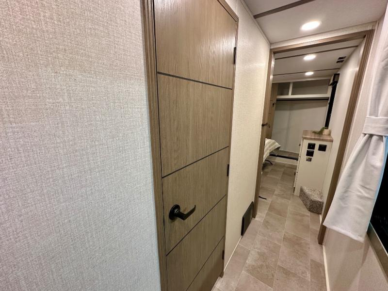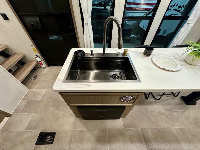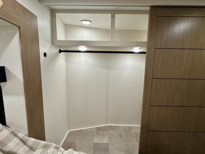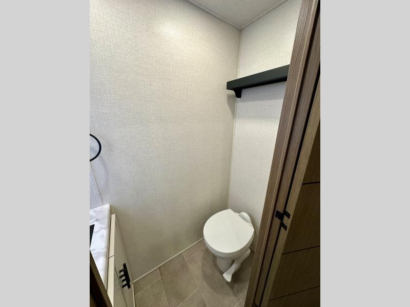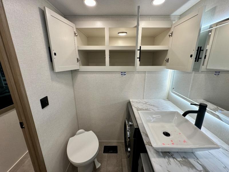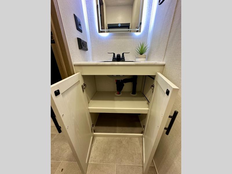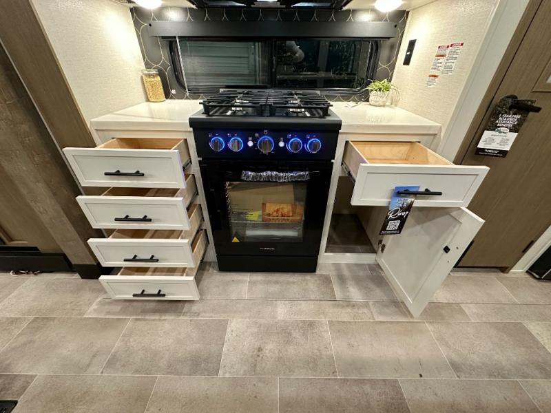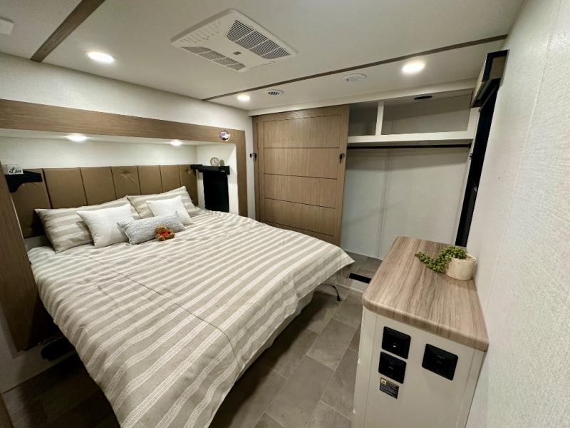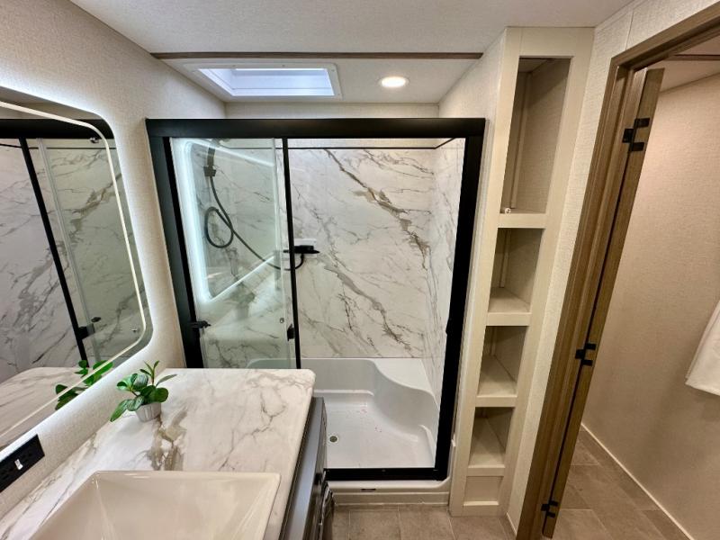 With any Impression fifth wheel by Forest River, the focus of the design is comfort and value, built with quality craftsmanship and attention to customer's desires in each Impression! The exterior includes upgraded E-rated tires, custom exterior graphics package, and insulated slam latch baggage doors. There is also an enclosed docking station, an outside shower, and a 100W roof panel for off-grid capabilities. The fully heated and enclosed AccessiBelly has removable underbelly panels along with enclosed tank valves. There is an industry leading 15K A/C plus 35K BTU furnace to keep you comfortable. The interior has lumbercore cabinetry, residential linoleum, residential backsplash in the kitchen, and oversized opening windows in the living area for more natural lighting and good air flow.