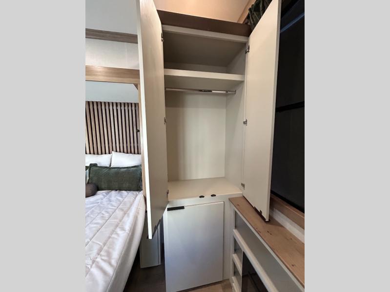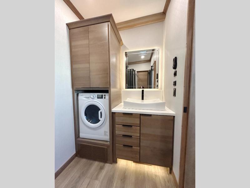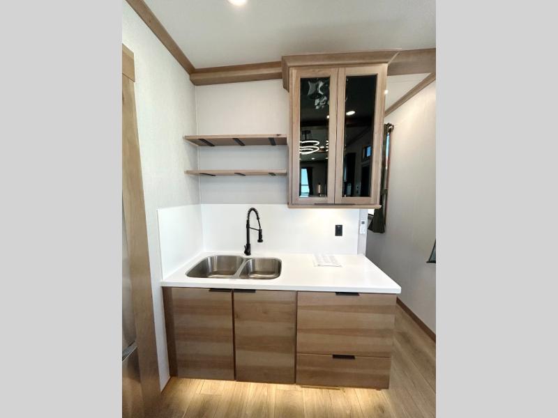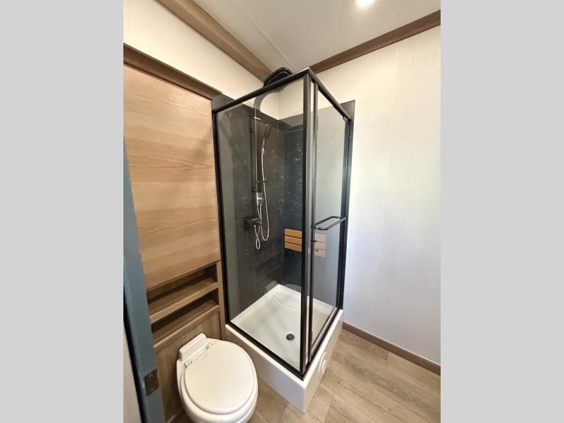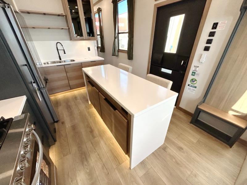 Luxury abounds in the Lost Pines destination trailer by Forest River. Each model features 3" hung wall construction, a rolled fiberglass roof, a thermofoil lined underbelly, and an Azdel gel coat fiberglass exterior wall for added durability. The full-body paint with 4x Clear Coat is sure to turn heads as you travel to your destination, and the LCI Road Armor suspension system will provide a smooth tow. You'll also find dual 40 lb. LP tanks outside, along with a heated full docking station, and MORryde entry steps and Safe-T-Rail. The interior of the Lost Pines is outfitted with luxury vinyl flooring, residential appliances, LED lighting throughout, plus upgraded solid surface countertops and backsplash!