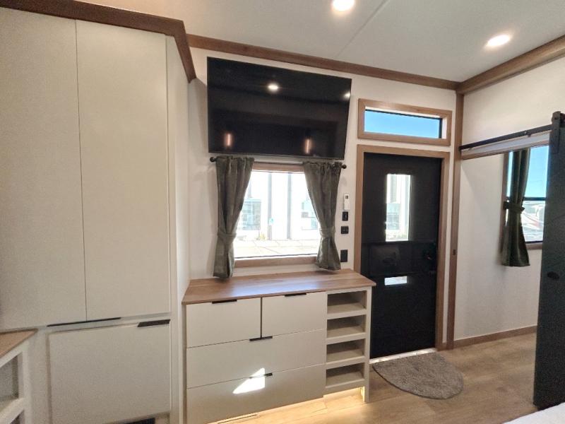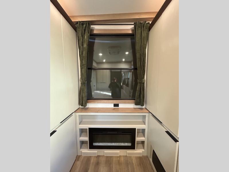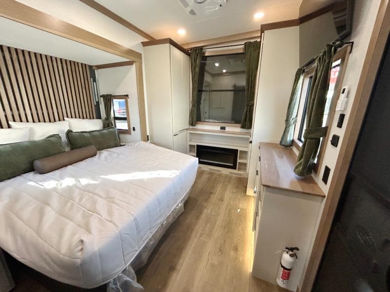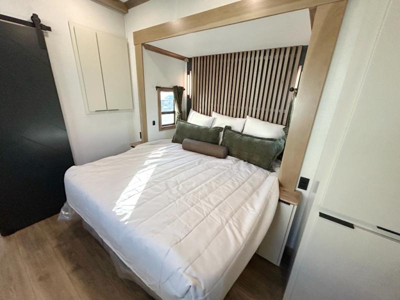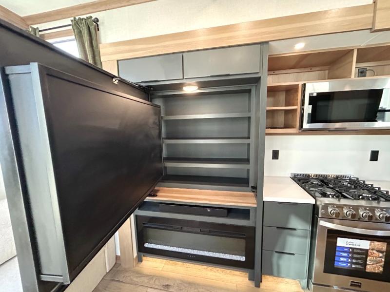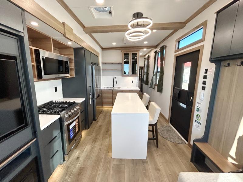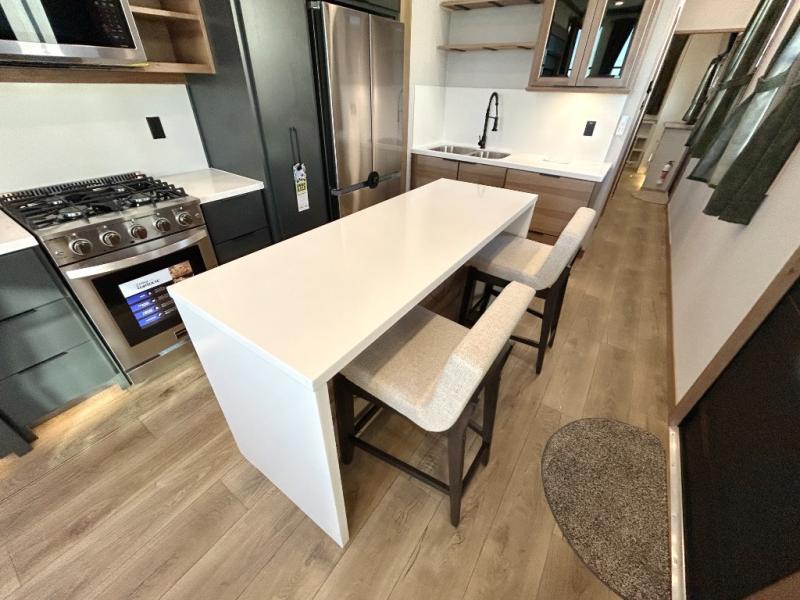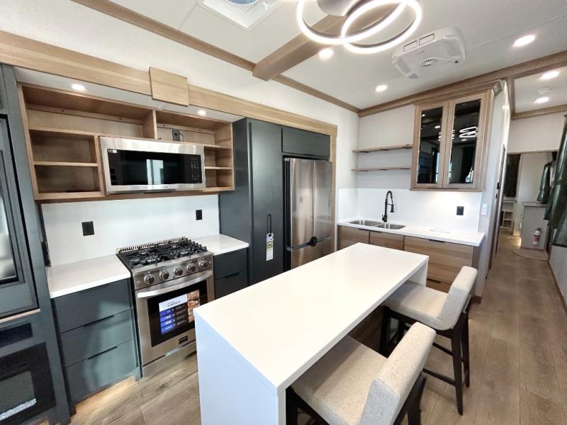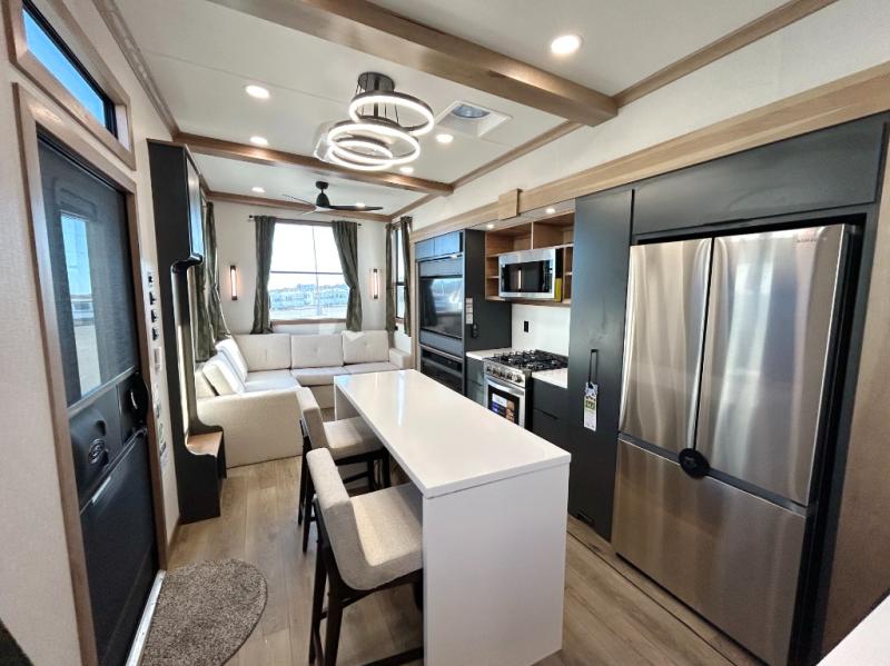 It won't be hard to find comfort in this dual slide, dual entry destination trailer! One of the entry doors conveniently opens to the front private bedroom where you'll find a queen bed slide out with a king bed option, dual closets with shelves in between, plus a dresser to keep everything tidy. If you have guests staying over, they can sleep on the L-shaped sleeper sofa in the rear living area, which is also directly across from the entertainment center for easy viewing. The chef of your group will love the spacious kitchen, complete with all the kitchen appliances to create their best meals and a large kitchen island with four chairs.
