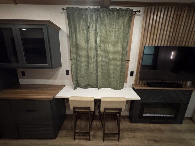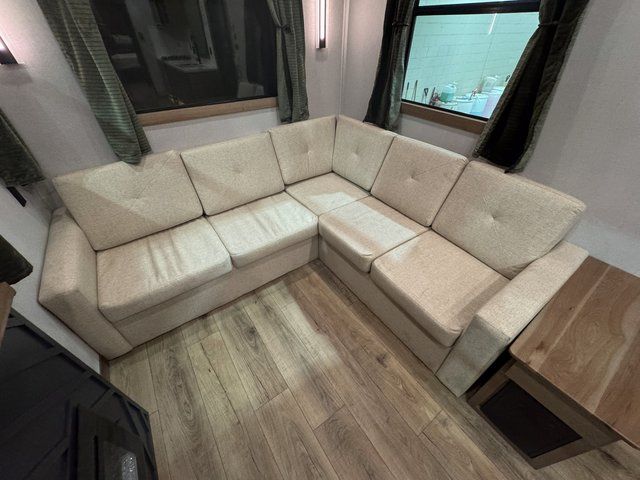 Relax in the bright front living space featuring an L-shaped sleeper sofa positioned across from the entertainment center. Large windows allow natural light and scenic views, while the countertop with chairs provides a cozy place for coffee, meals, or catching up on work.