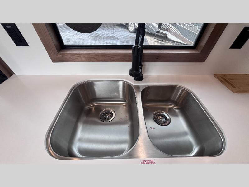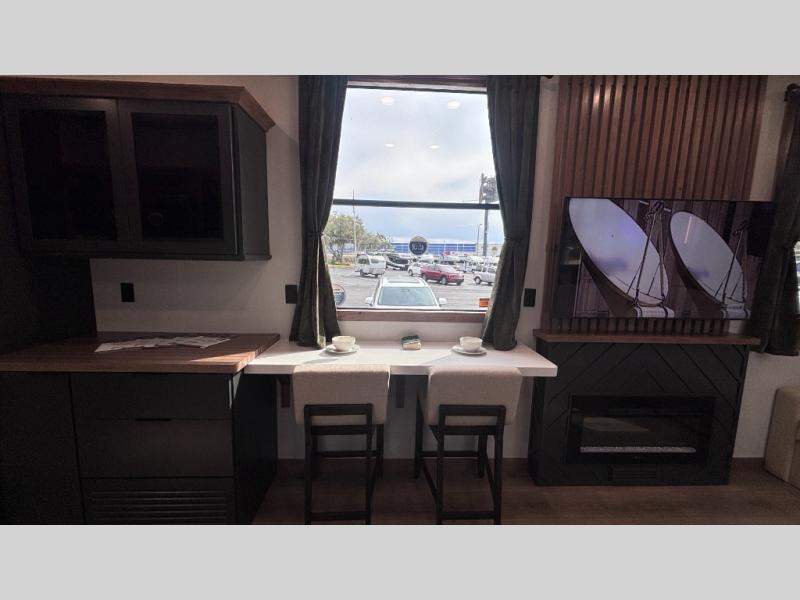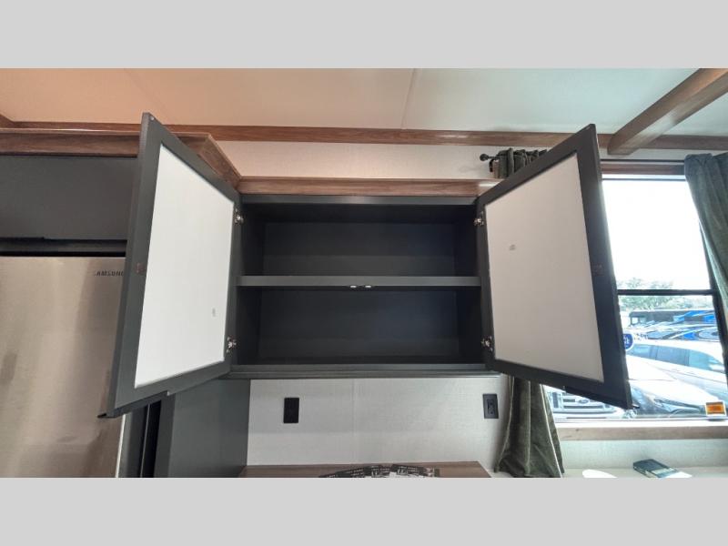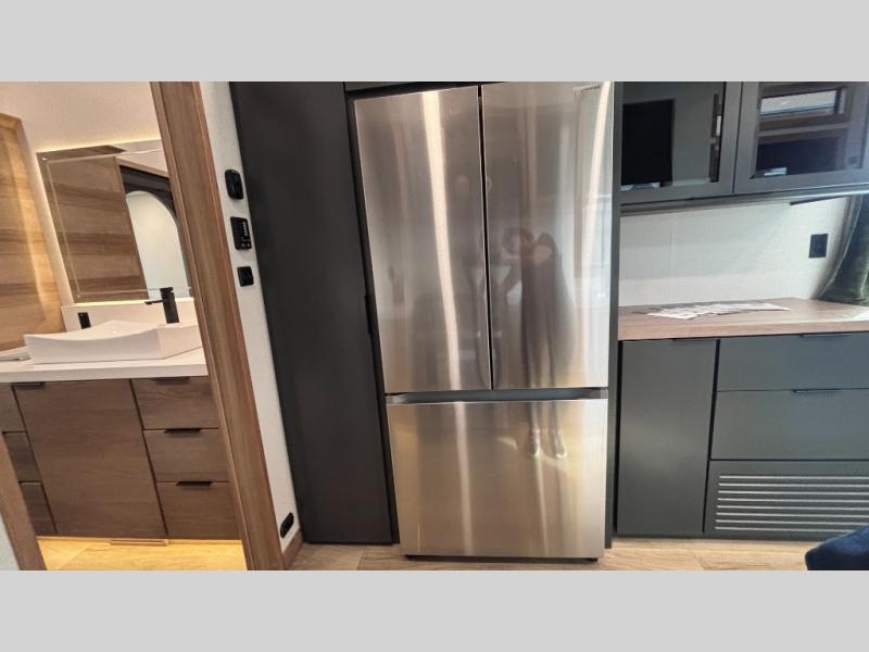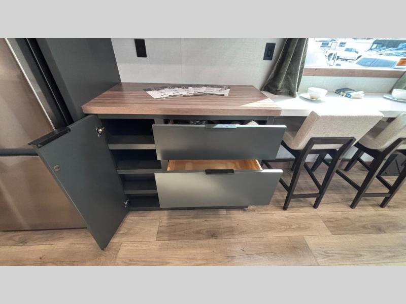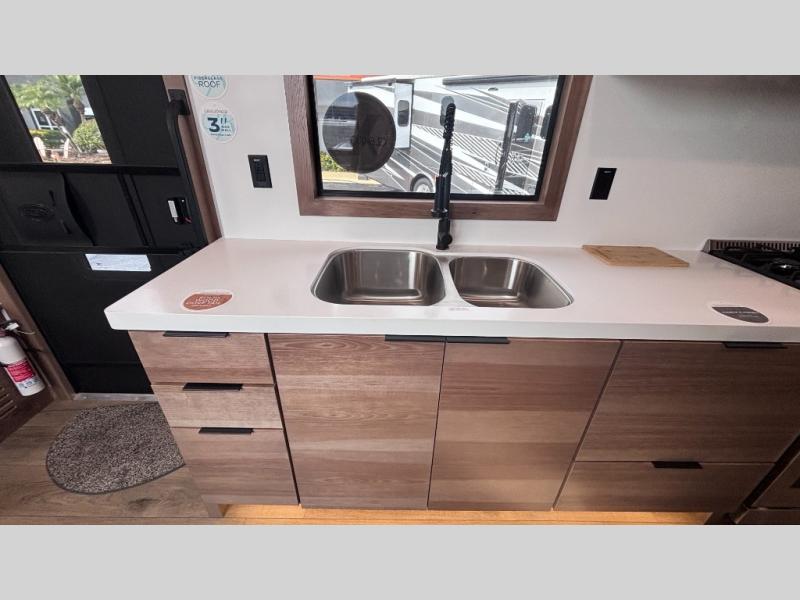 For those who appreciate a destination trailer easier to maintain, this slide-less unit will be perfect for you! Your crew can relax comfortably in the front living area that includes an L-shaped sleeper sofa across from an entertainment center or enjoy the views out the window in front of the countertop with chairs. The full kitchen will allow you to make your best home-cooked meals, and the spacious walk-through bath is easily accessible. You're sure to love the rear bedroom that includes a queen bed with a king bed option, along with dual bedroom closets to keep everything organized!