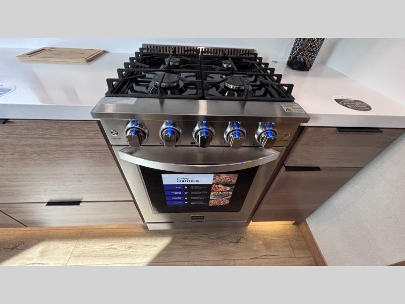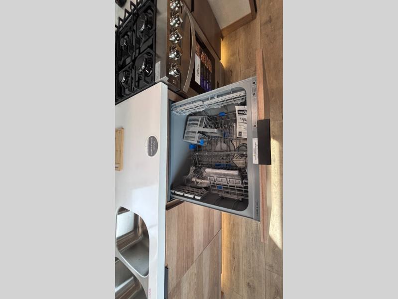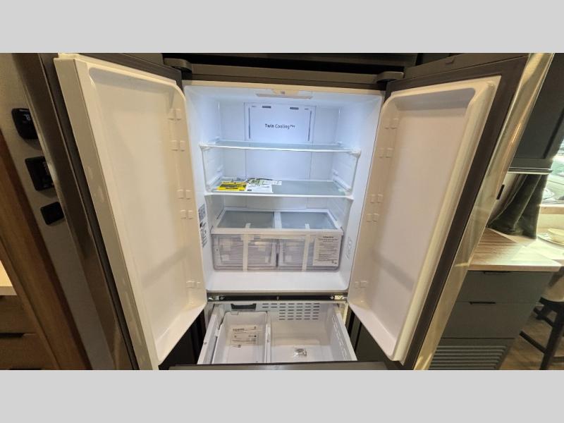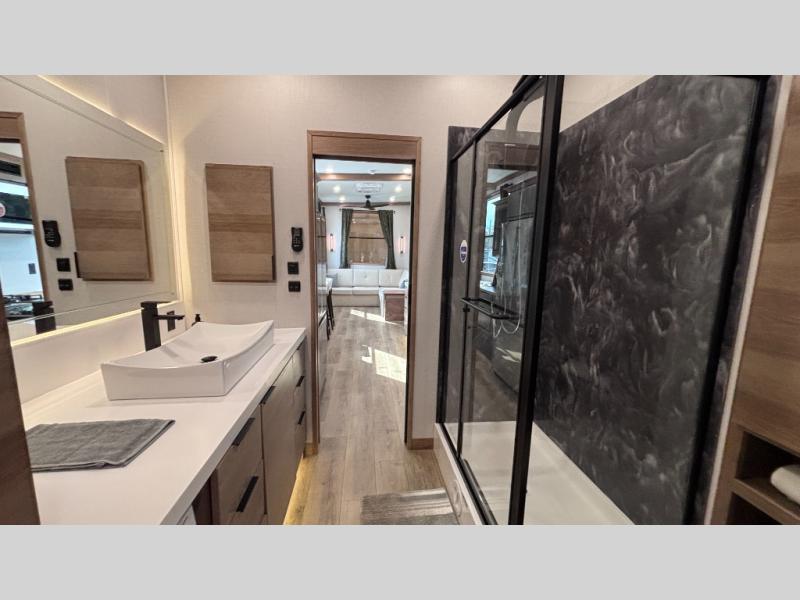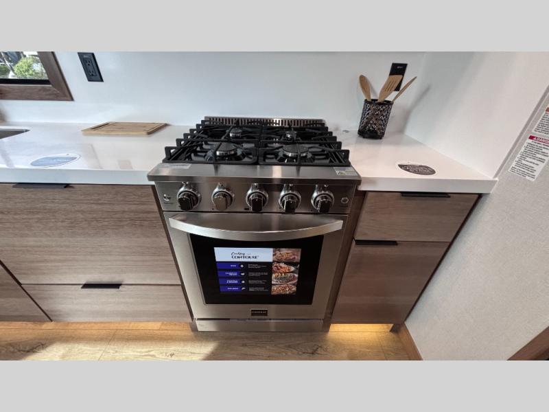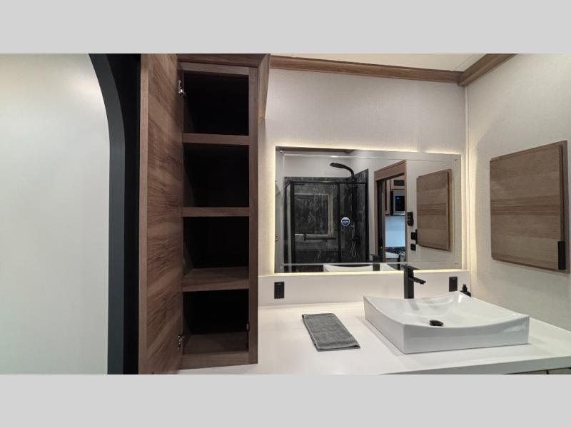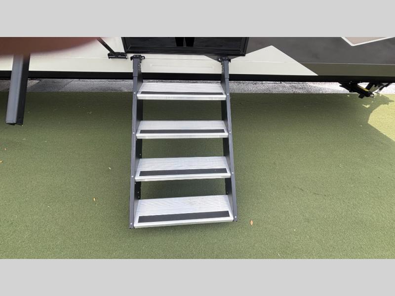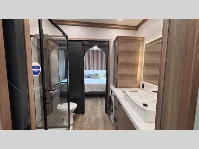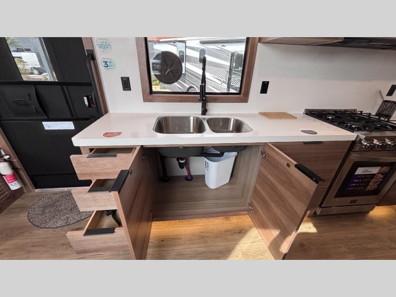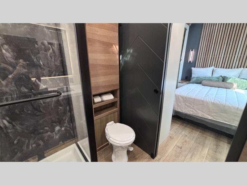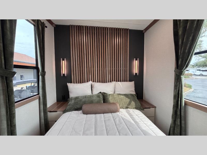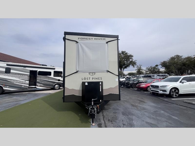 Luxury abounds in the Lost Pines destination trailer by Forest River. Each model features 3" hung wall construction, a rolled fiberglass roof, a thermofoil lined underbelly, and an Azdel gel coat fiberglass exterior wall for added durability. The full-body paint with 4x Clear Coat is sure to turn heads as you travel to your destination, and the LCI Road Armor suspension system will provide a smooth tow. You'll also find dual 40 lb. LP tanks outside, along with a heated full docking station, and MORryde entry steps and Safe-T-Rail. The interior of the Lost Pines is outfitted with luxury vinyl flooring, residential appliances, LED lighting throughout, plus upgraded solid surface countertops and backsplash!