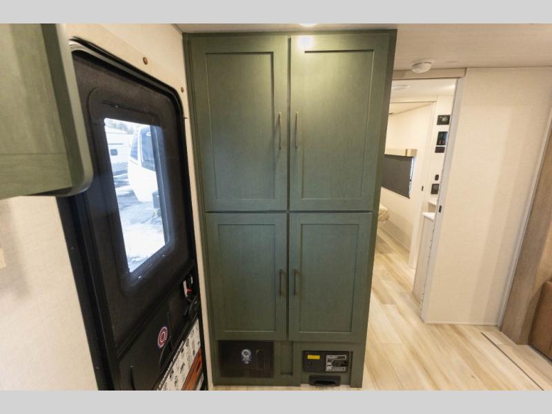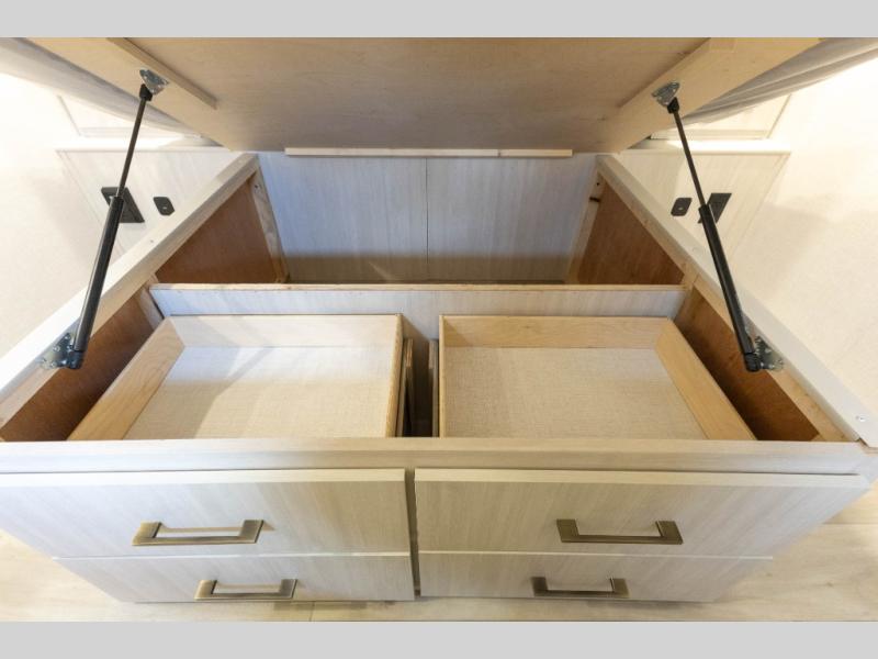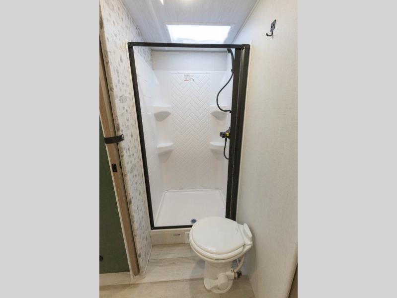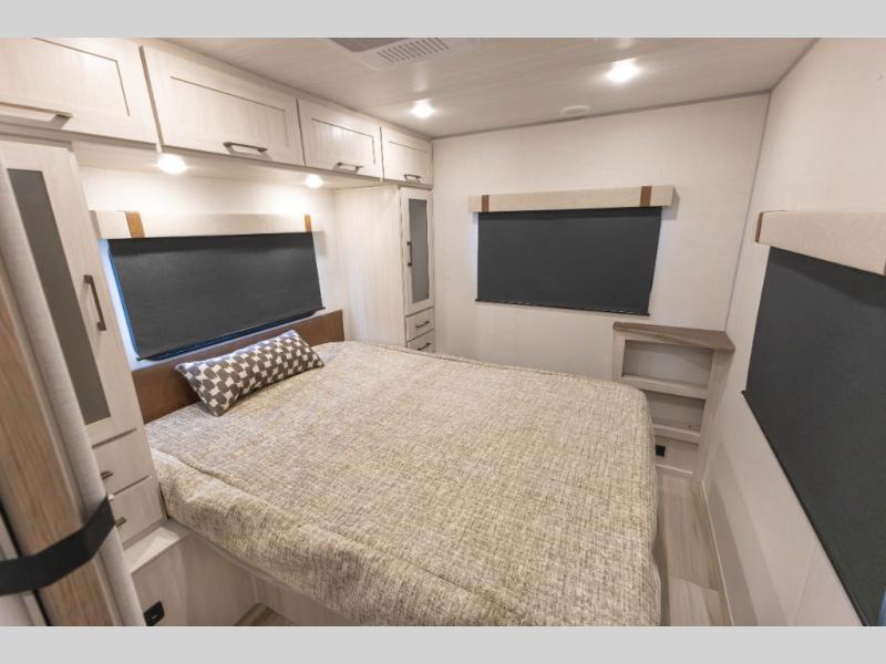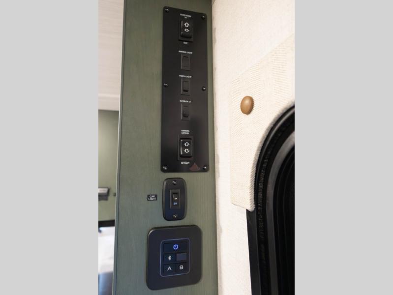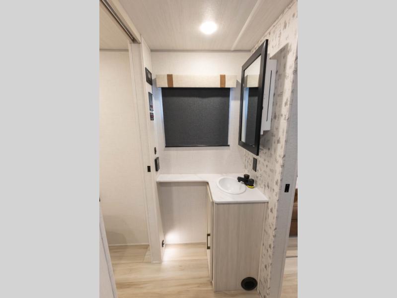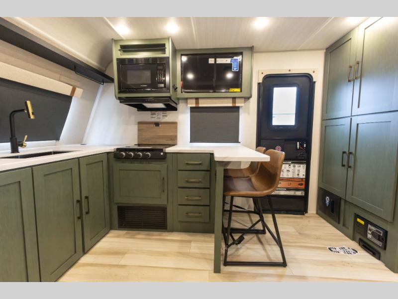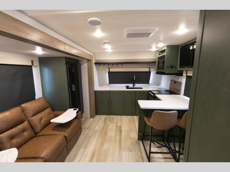 This couple's trailer is perfect for weekend trips or extended stays at the campground. A front kitchen includes generous counter space, along with a bar top and two seats. You can relax on the tri-fold sofa slide after breakfast, or head outdoors to sit under the patio awning. The walk-thru bath will lead to the rear master bedroom where you'll find a queen bed and dual wardrobes for your clothes.