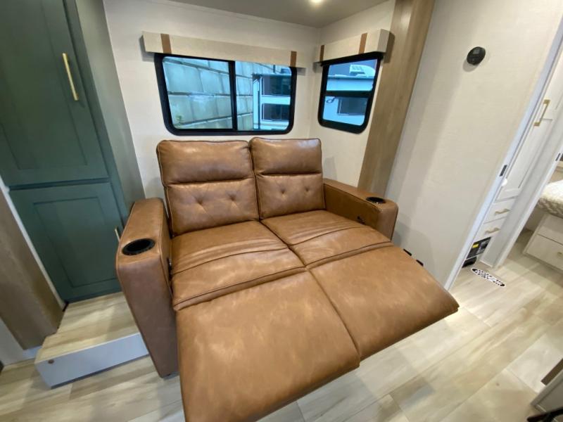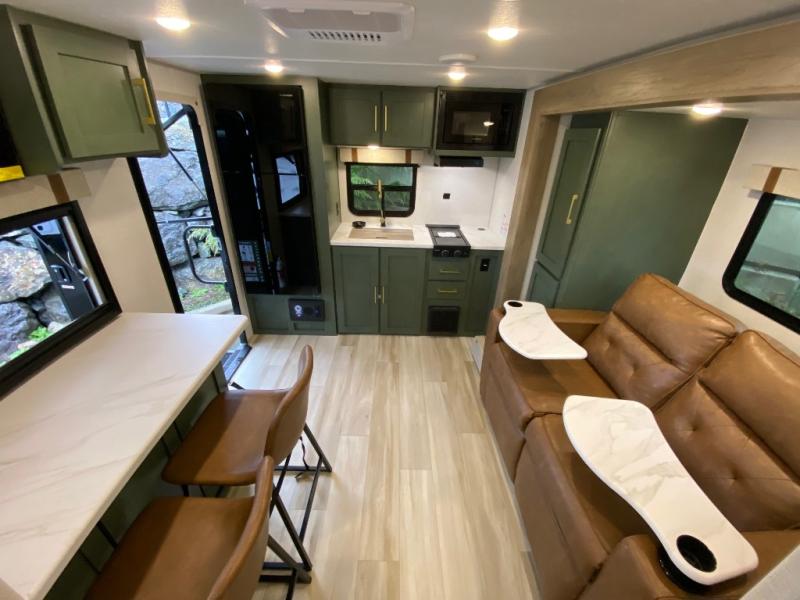 This travel trailer has everything you need for a fun camping trip at your favorite camping spots! The chef will have an easy time preparing meals in the full equipped front kitchen and will enjoy the company sitting at the breakfast bar on one of the two bar stools. You can read the newspaper on the tri-fold sofa or replace it for the optional theater seating. The walk-through bathroom has everything you need to freshen up, and it leads directly into the rear private bedroom which has a queen bed, a wardrobe, and a large window to let in some natural lighting. You also have an outside kitchen, a 19' awning, and an enclosed underbelly with forced heat. When the optional Beast Mode Package on this model is chosen, you'll enjoy a 400-watt solar package, a fresh water filter, a Maxxair roof vent cover, plus a Beast Mode independent suspension for better handling.
