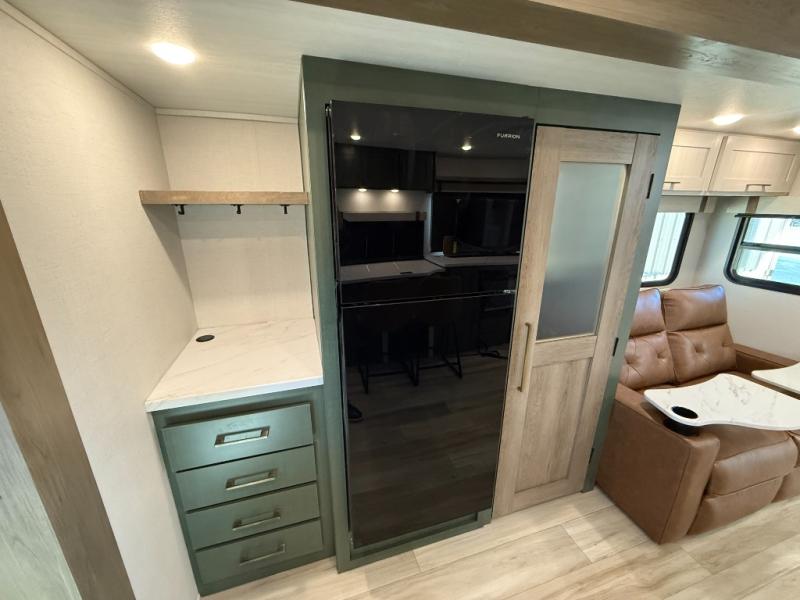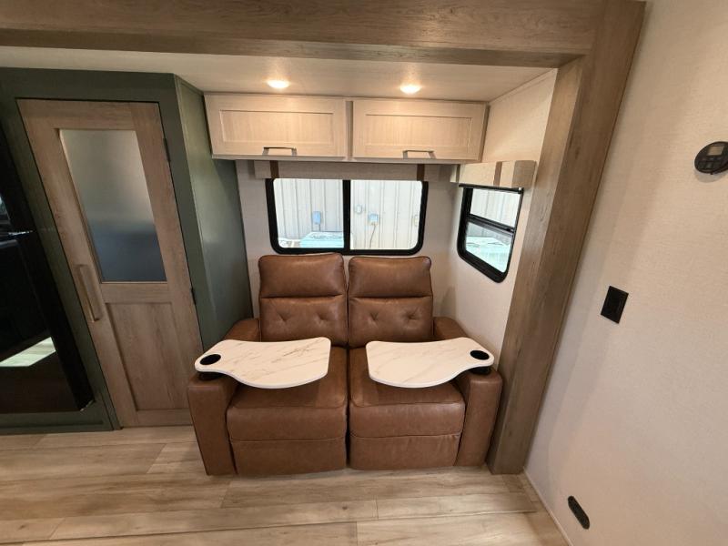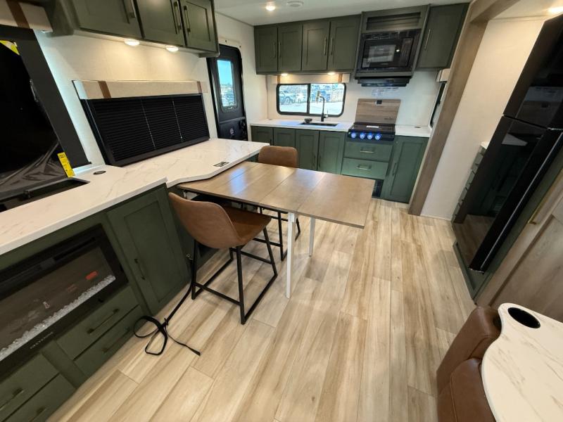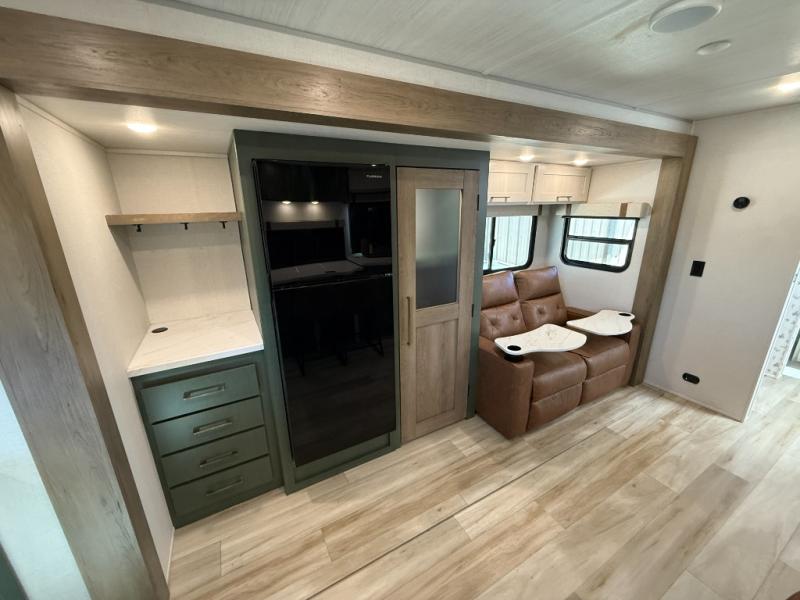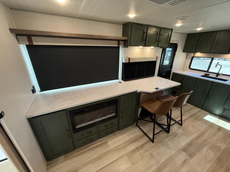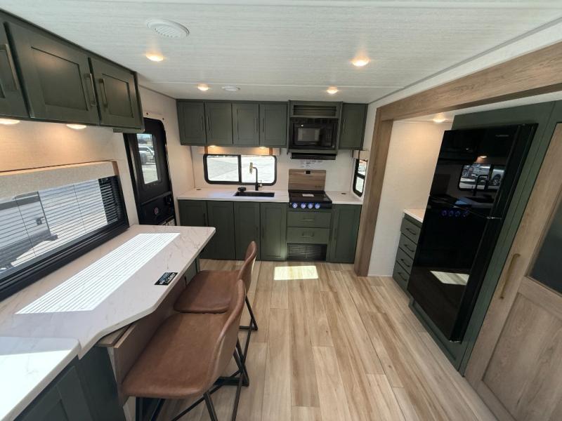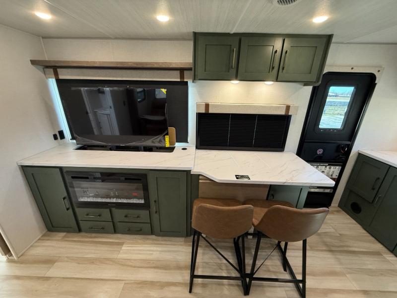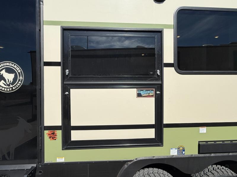 Make each camping trip one to remember in this dual entry, rear kitchen travel trailer! If you enter in through the front master bedroom, you'll find a queen bed and dual wardrobes for your things, plus a private entrance into the walk-thru bath. This will lead you to the main living area that is made spacious thanks to the large slide out. There is theater seating here, along with a refrigerator, pantry, and hutch with a shelf so everything has its place. Once the chef of your group has made dinner in the rear kitchen, you can dine at the Bar 2 Table pull-out dinette, which is conveniently located in front of the flip-up window. Just outside this window, you'll find the Trailgate outdoor bar, giving you a food truck atmosphere where you can visit with those sitting at the dinette table inside!