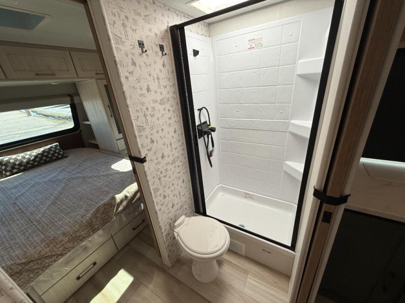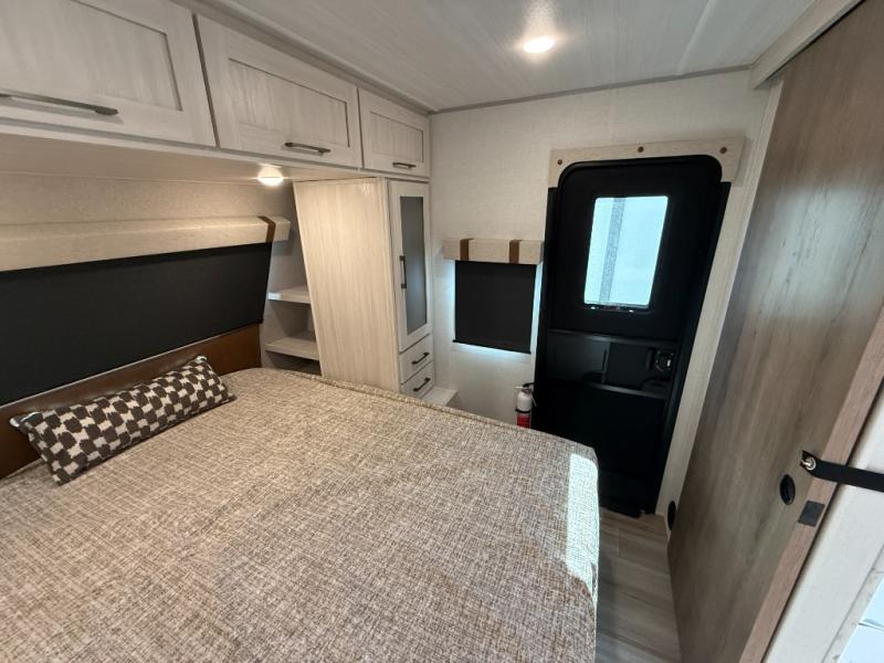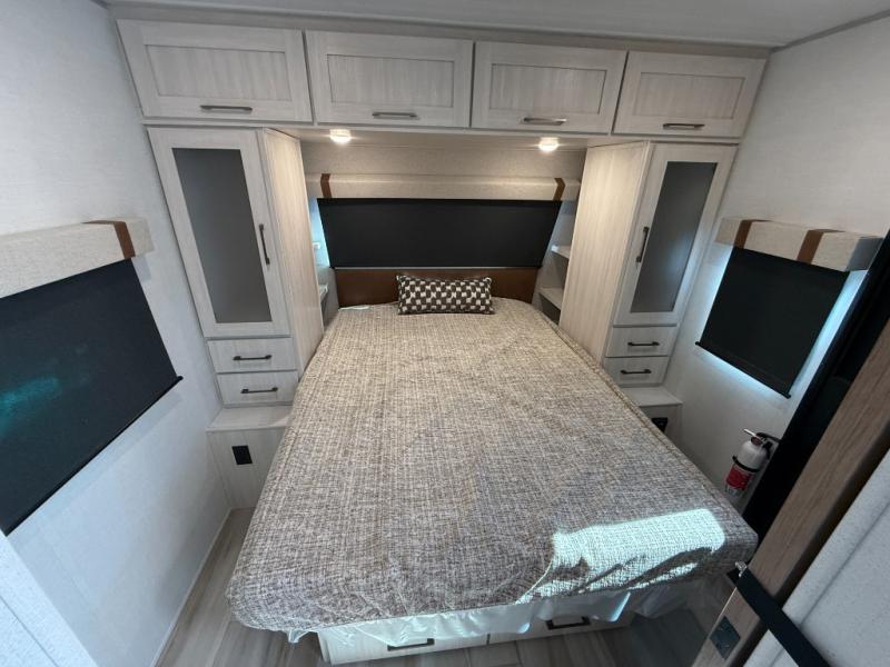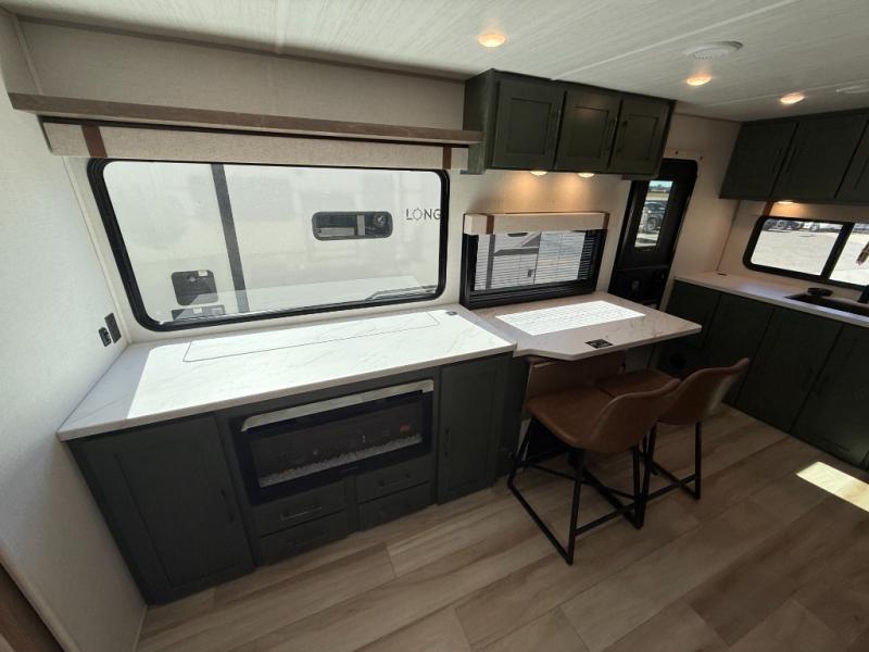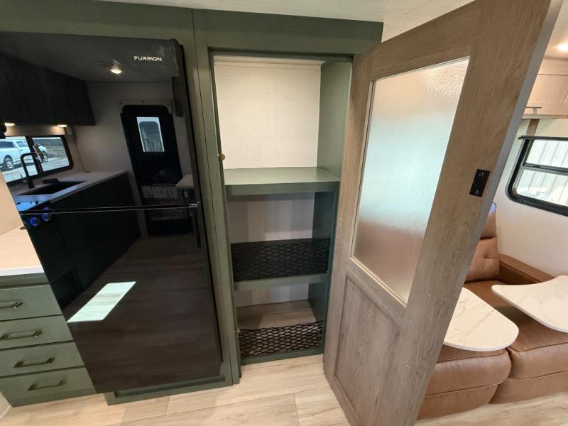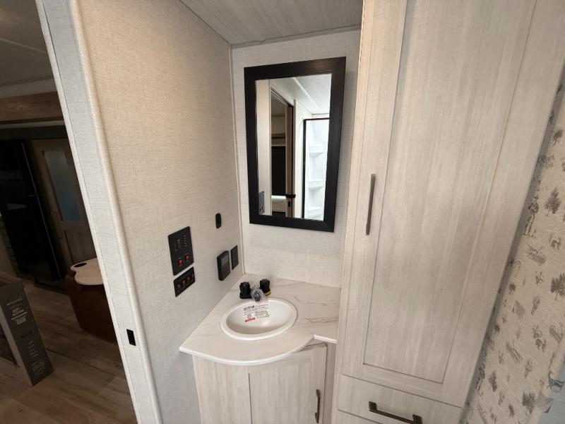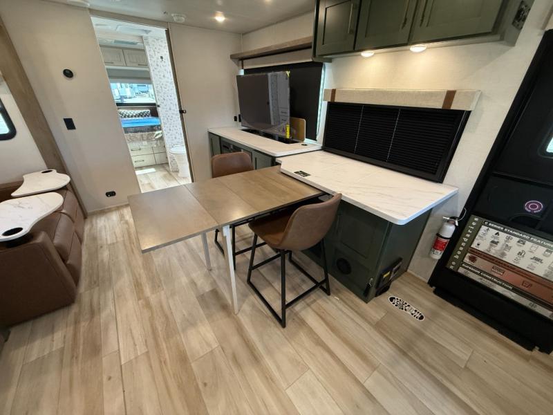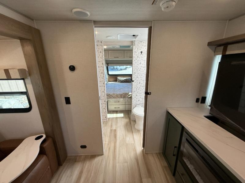 Make each camping trip one to remember in this dual entry, rear kitchen travel trailer! If you enter in through the front master bedroom, you'll find a queen bed and dual wardrobes for your things, plus a private entrance into the walk-thru bath. This will lead you to the main living area that is made spacious thanks to the large slide out. There is theater seating here, along with a refrigerator, pantry, and hutch with a shelf so everything has its place. Once the chef of your group has made dinner in the rear kitchen, you can dine at the Bar 2 Table pull-out dinette, which is conveniently located in front of the flip-up window. Just outside this window, you'll find the Trailgate outdoor bar, giving you a food truck atmosphere where you can visit with those sitting at the dinette table inside!
