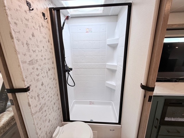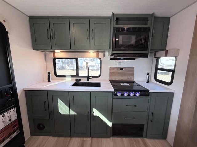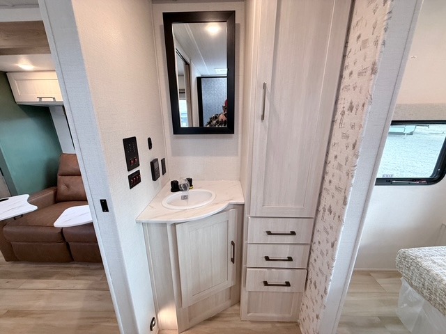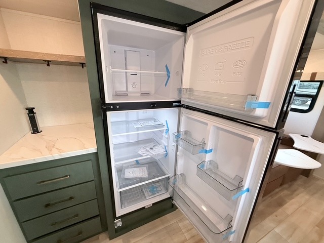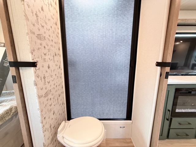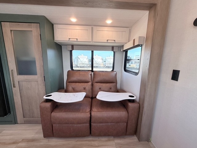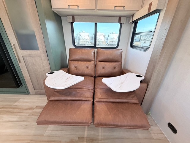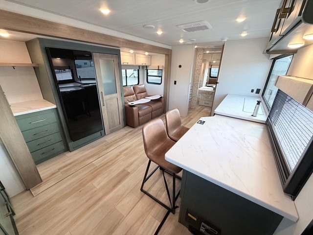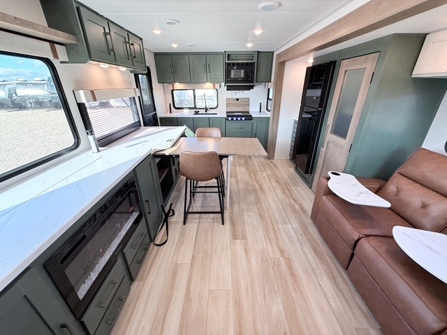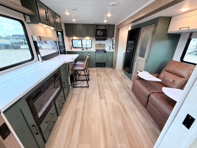 Make each camping trip one to remember in this dual entry, rear kitchen travel trailer! If you enter in through the front master bedroom, you'll find a queen bed and dual wardrobes for your things, plus a private entrance into the walk-thru bath. This will lead you to the main living area that is made spacious thanks to the large slide out. There is theater seating here, along with a refrigerator, pantry, and hutch with a shelf so everything has its place. Once the chef of your group has made dinner in the rear kitchen, you can dine at the Bar 2 Table pull-out dinette, which is conveniently located in front of the flip-up window. Just outside this window, you'll find the Trailgate outdoor bar, giving you a food truck atmosphere where you can visit with those sitting at the dinette table inside. When the optional Beast Mode Package on this model is chosen, you'll enjoy a 400-watt solar package, a fresh water filter, a Maxxair roof vent cover, plus a Beast Mode independent suspension for better handling.
