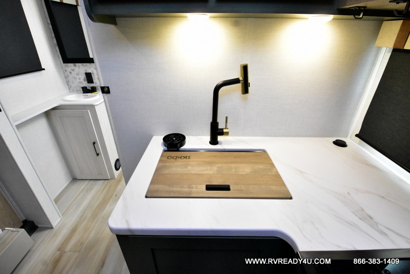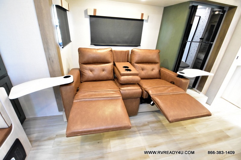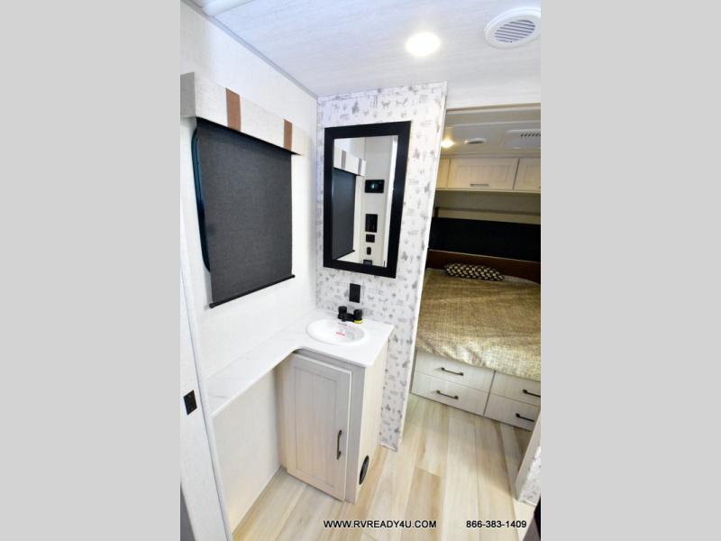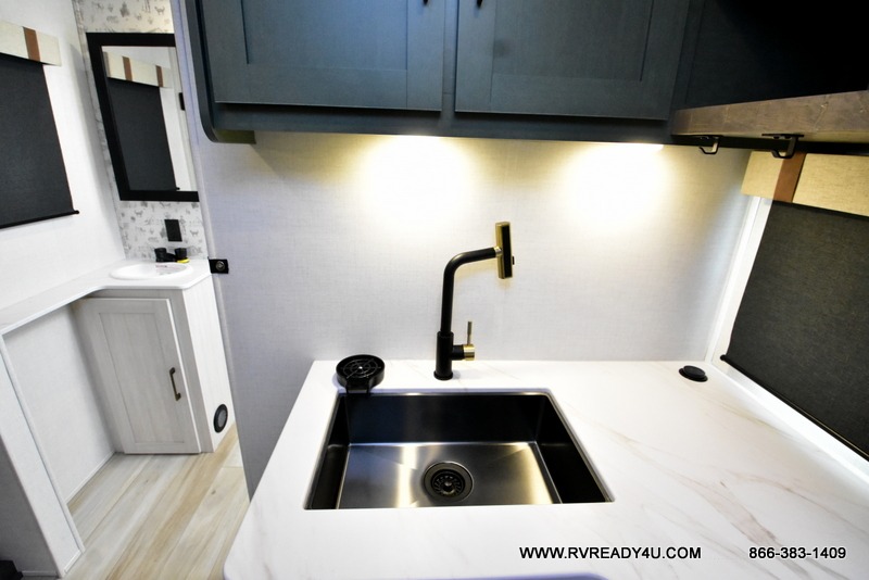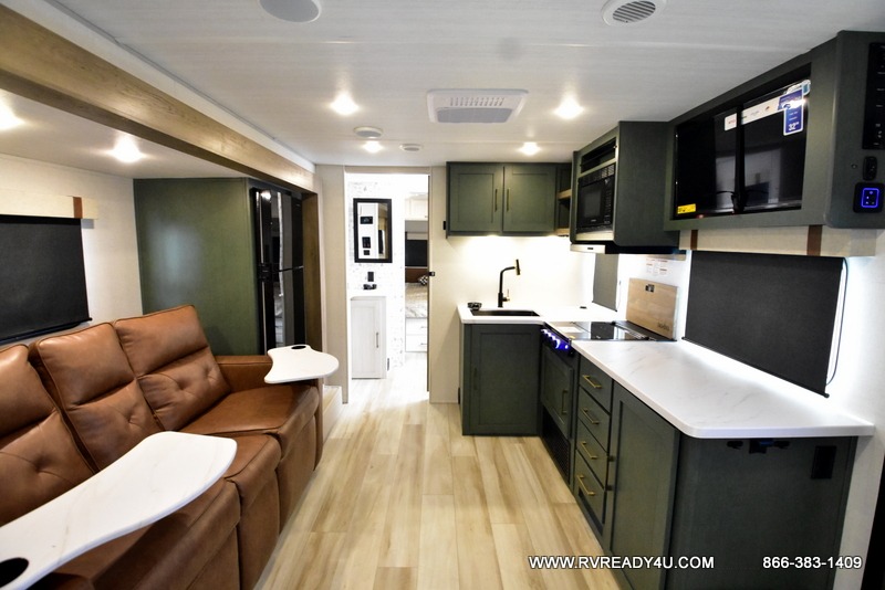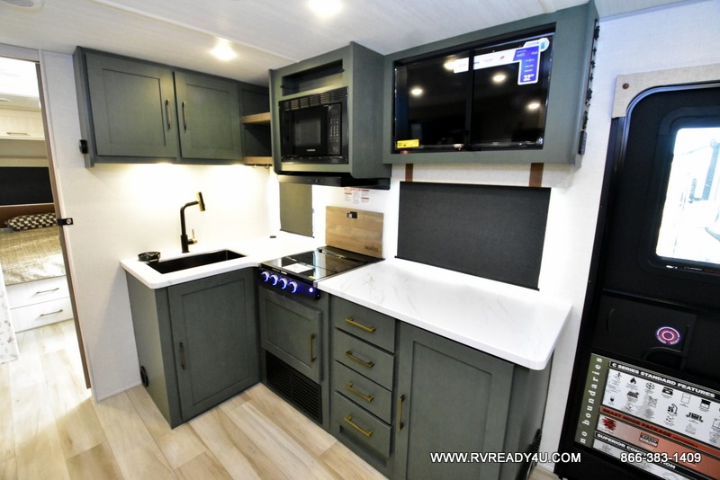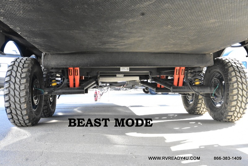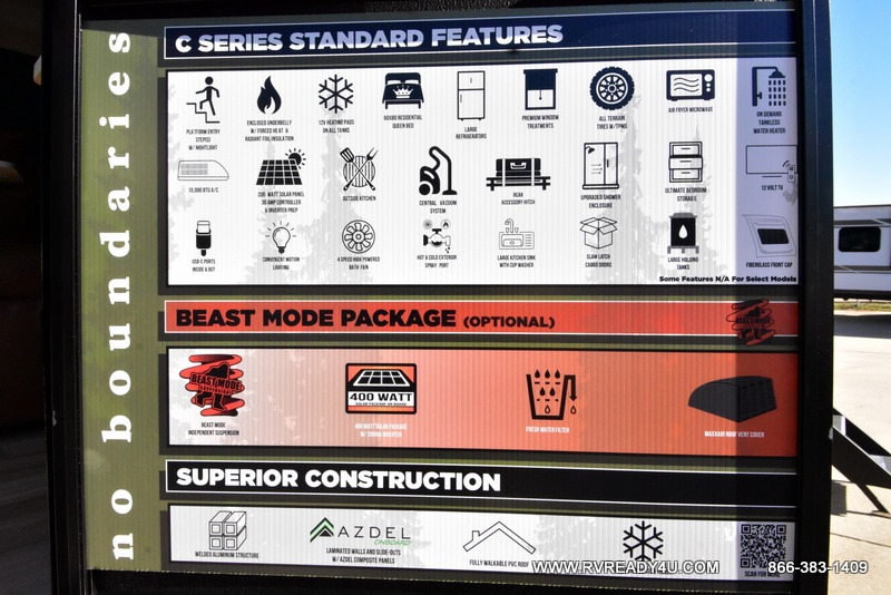 It will be so easy to enjoy camping trips in this No Boundaries travel trailer! The front master bedroom includes one of the dual entry doors so you can slip out early for a morning run without waking anyone else up. When you return, you can freshen up in the walk-thru bath, then head to the kitchen to make breakfast. There is also an outside kitchen so you can cook in the fresh mountain air. There is a booth dinette inside where you can dine at, play games, and even let a guest sleep over, and the tri-fold sofa slide provides more space and comfort! When the optional Beast Mode Package on this model is chosen, you'll enjoy a 400-watt solar package, a fresh water filter, a Maxxair roof vent cover, plus a Beast Mode independent suspension for better handling.