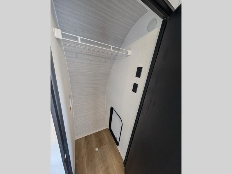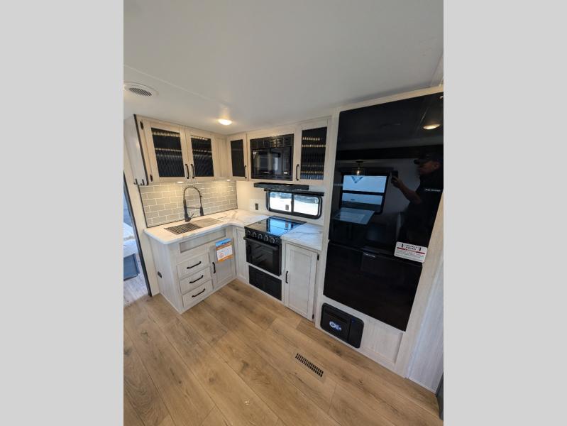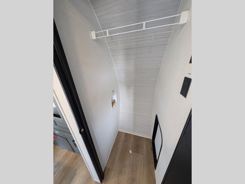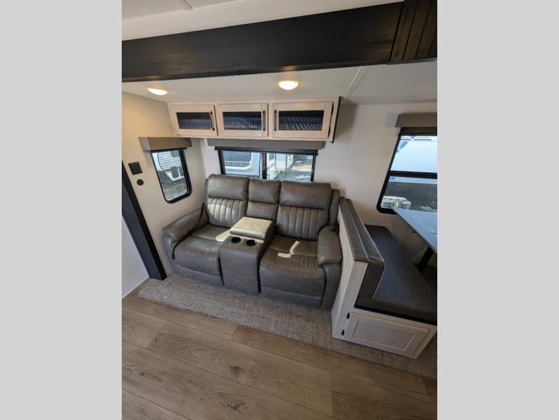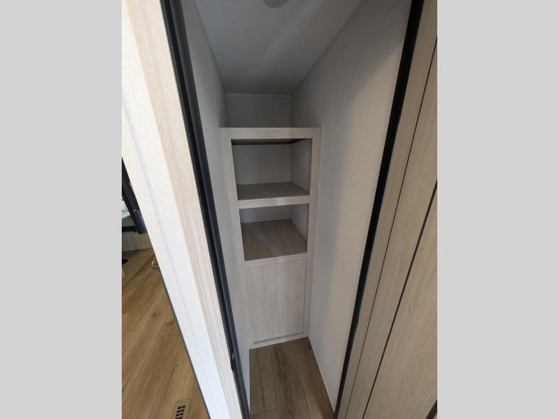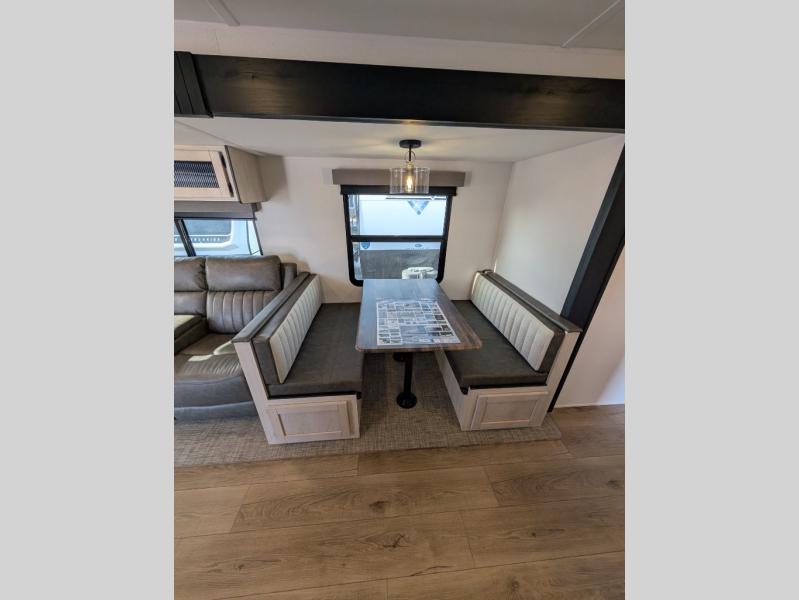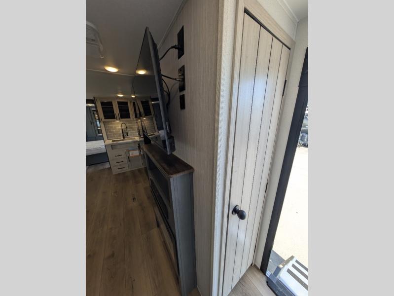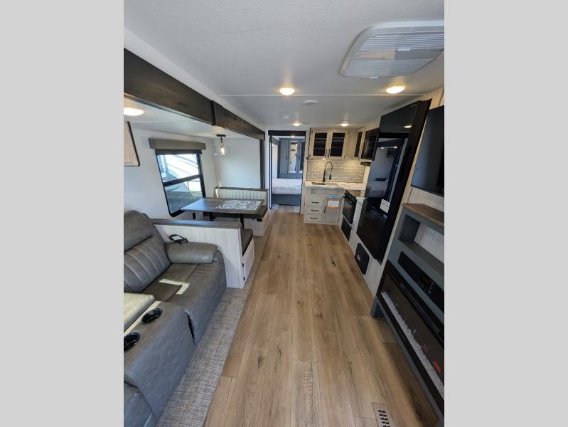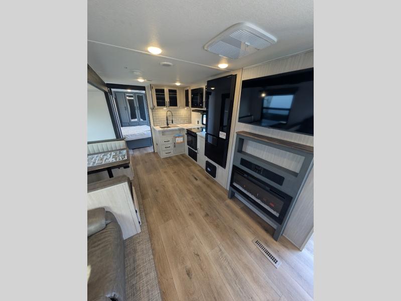 Head to the lake in this double slide out travel trailer that can sleep four to five each night. You will love having the front private bedroom all to yourselves that includes a queen bed slide out, a front wardrobe, a closet with washer and dryer prep, plus your own exterior entry door. Your guests can sleep on the sofa and booth dinette within the second slide out, and the full rear bath is tucked away for privacy. This model also includes an entryway closet/pantry for food storage and jackets, and the fireplace across from the sofa makes your space cozier. An optional outside micro kitchen is available also if you like to cook outdoors!