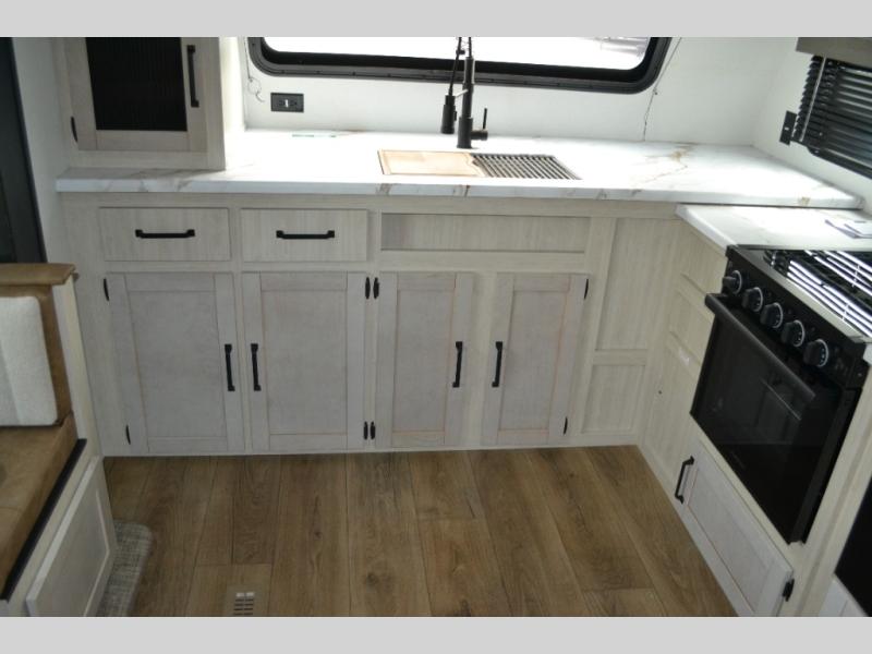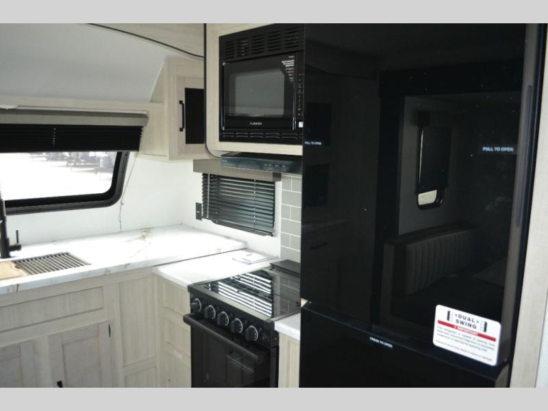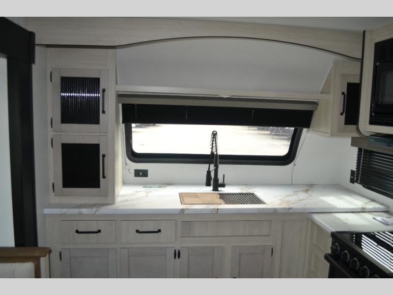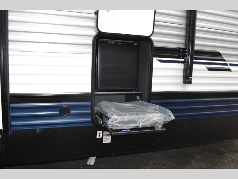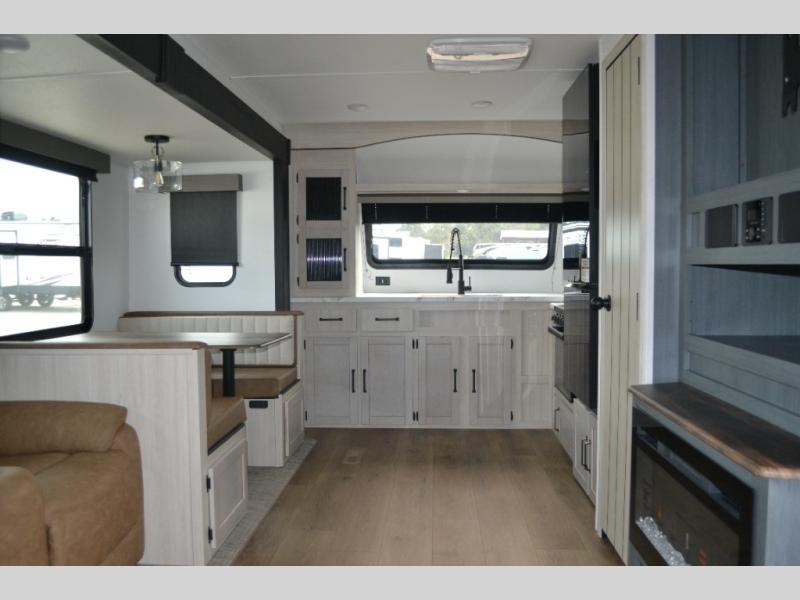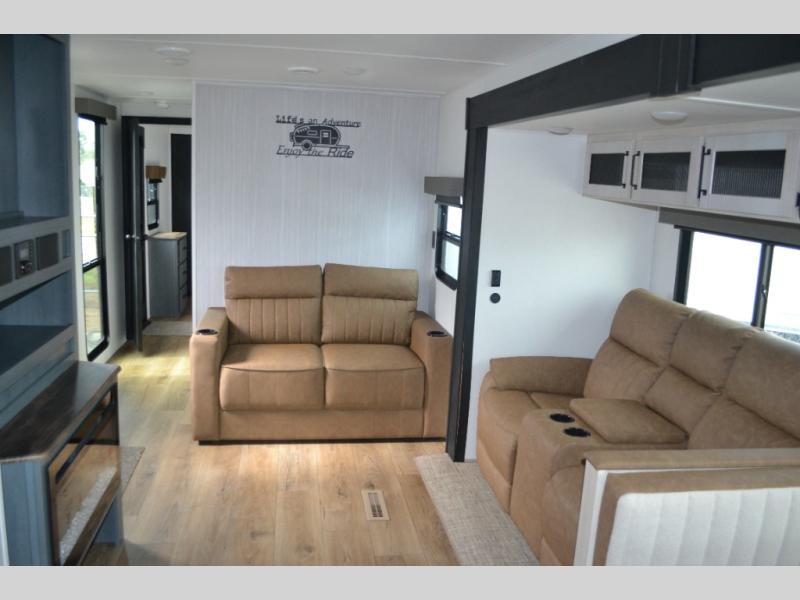 Experience a home away from home with this travel trailer! The front kitchen has everything you will need to prepare your best meals and you can enjoy them at the booth dinette. The rear private bedroom has a 72" x 80" king bed slide across from a dresser, a wardrobe, and a closet with washer and dryer prep. Freshen up in the full bathroom with the 32" x 40" shower and then enjoy a cup of coffee relaxing in one of the two recliners or on the sofa! Choose the optional outside micro kitchen with a griddle for even more convenience!