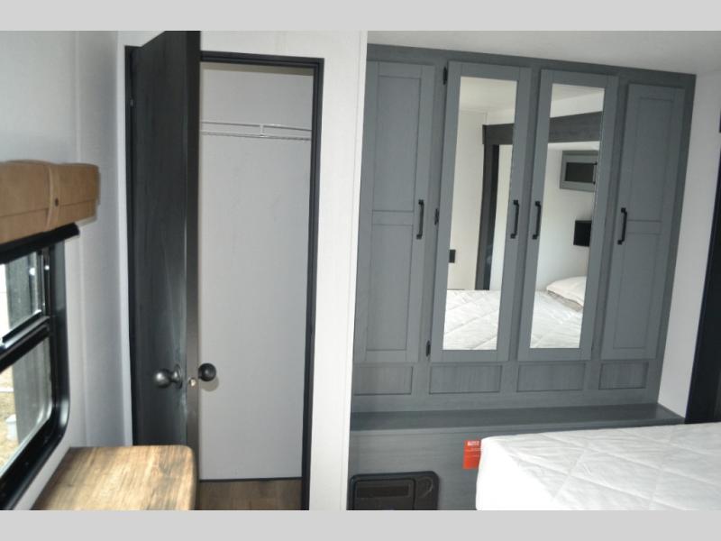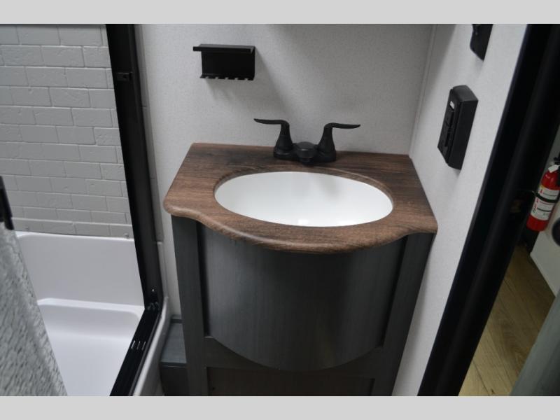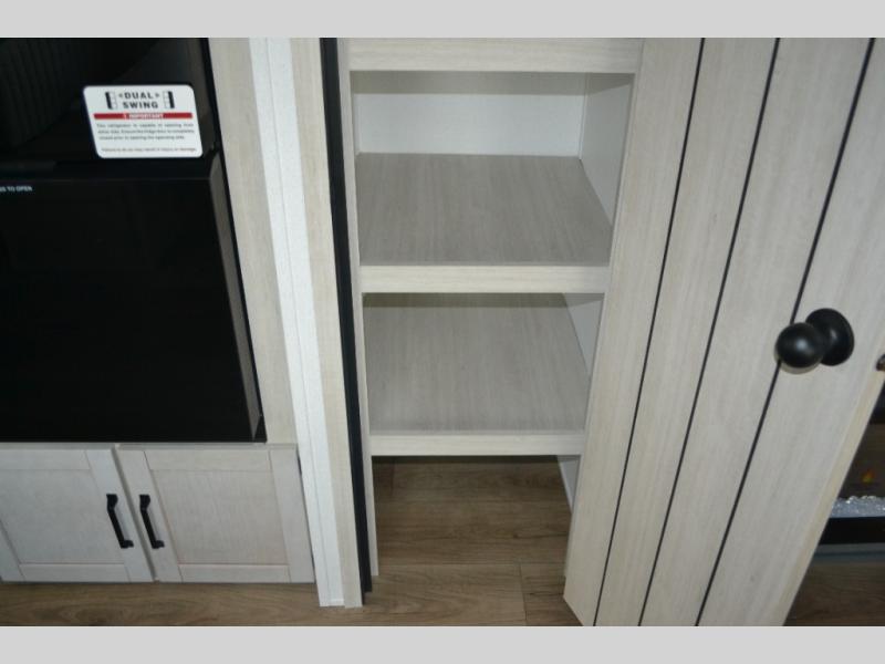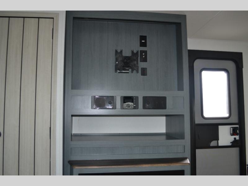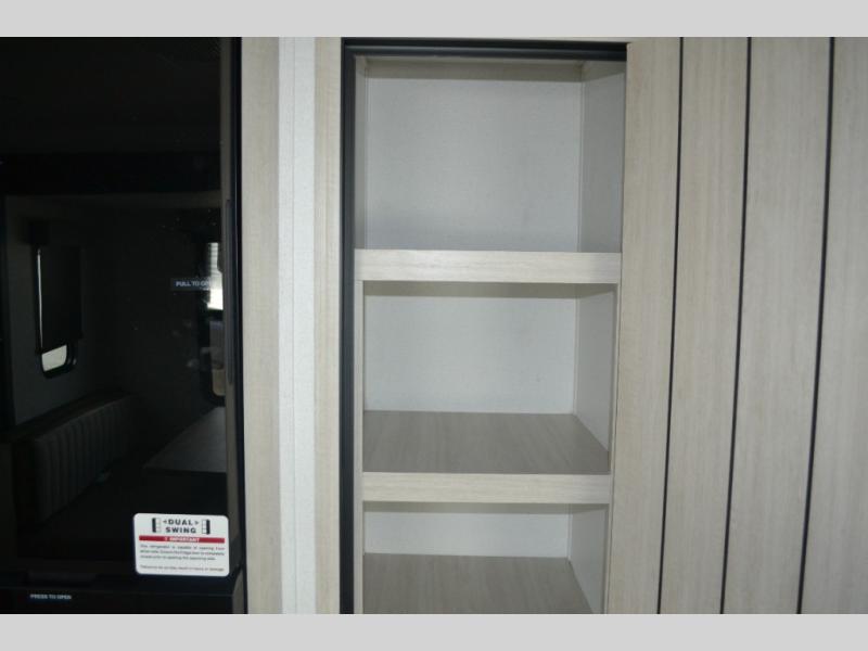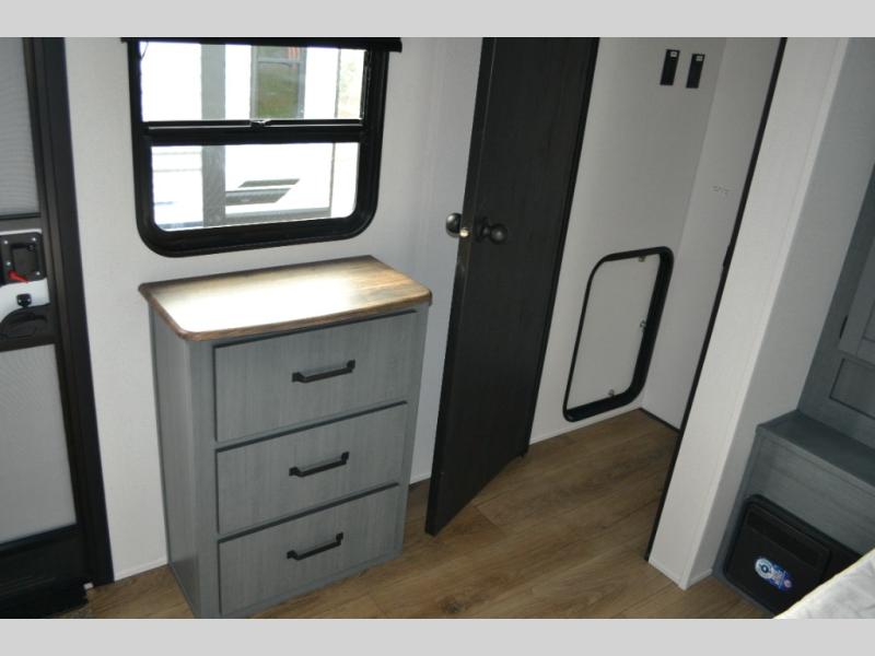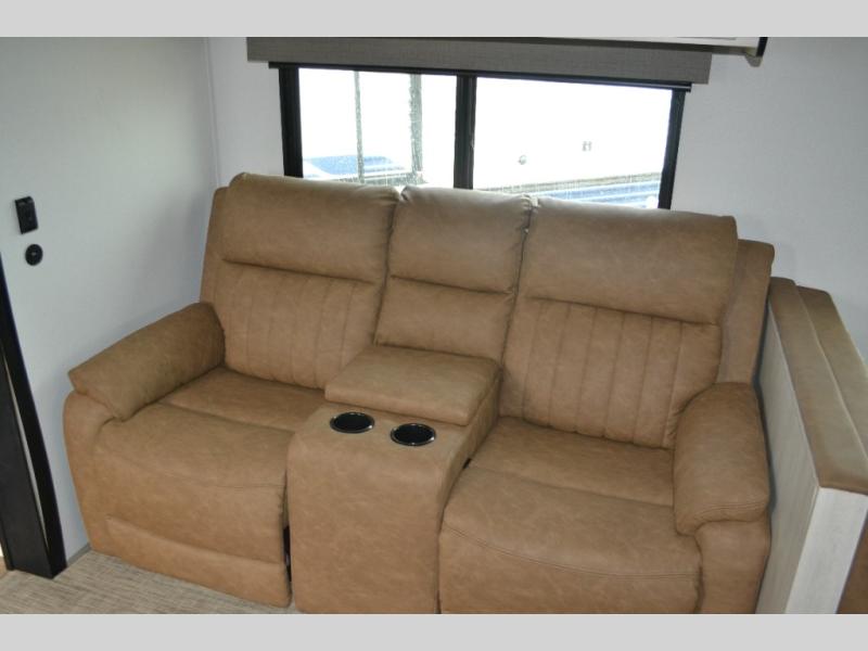 Experience a home away from home with this travel trailer! The front kitchen has everything you will need to prepare your best meals and you can enjoy them at the booth dinette. The rear private bedroom has a 72" x 80" king bed slide across from a dresser, a wardrobe, and a closet with washer and dryer prep. Freshen up in the full bathroom with the 32" x 40" shower and then enjoy a cup of coffee relaxing in one of the two recliners or on the sofa! Choose the optional outside micro kitchen with a griddle for even more convenience!