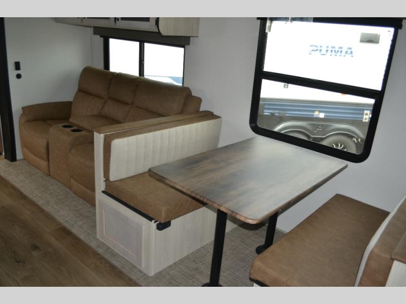 If you're looking for family-fun adventures then you need one of these Palomino Puma fifth wheels or travel trailers! They are built rugged, easy to tow, and jam packed with features. The Darco wrapped underbelly will protect your units vitals and the AlphaPly roofing membrane covers it. They also have new aluminum wheels and a powder coated steel I-beam frame. Inside, the Congoleum linoleum will be easy to keep clean, and the night roller shades will provide privacy when it's time to turn in. You'll also enjoy an electric awning with an LED light strip plus an AM/FM/Bluetooth stereo and two outside speakers to keep the party going!