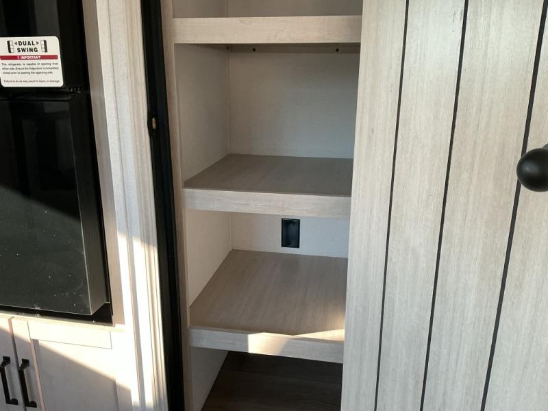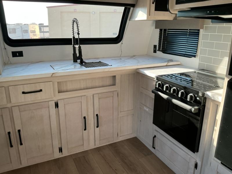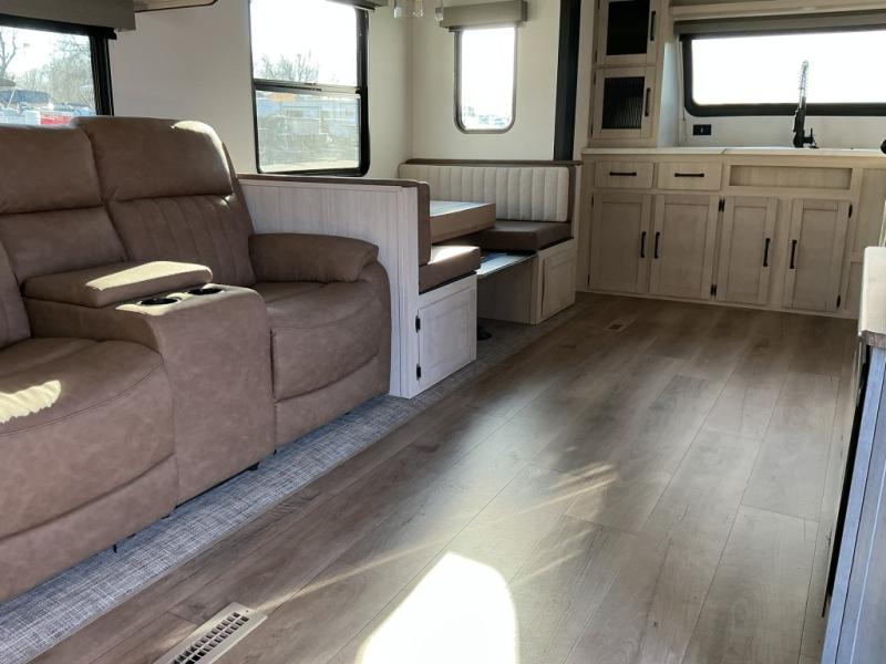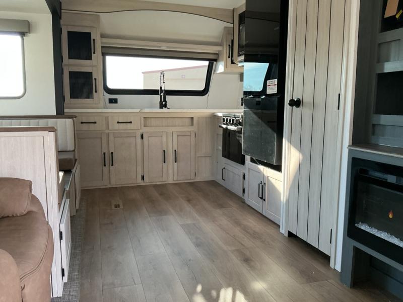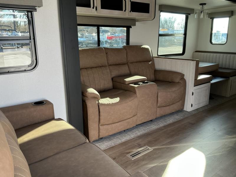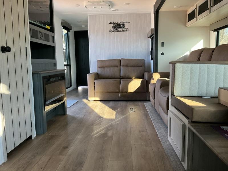 Experience a home away from home with this travel trailer! The front kitchen has everything you will need to prepare your best meals and you can enjoy them at the booth dinette. The rear private bedroom has a 72" x 80" king bed slide across from a dresser, a wardrobe, and a closet with washer and dryer prep. Freshen up in the full bathroom with the 32" x 40" shower and then enjoy a cup of coffee relaxing in one of the two recliners or on the sofa! Choose the optional outside micro kitchen with a griddle for even more convenience!