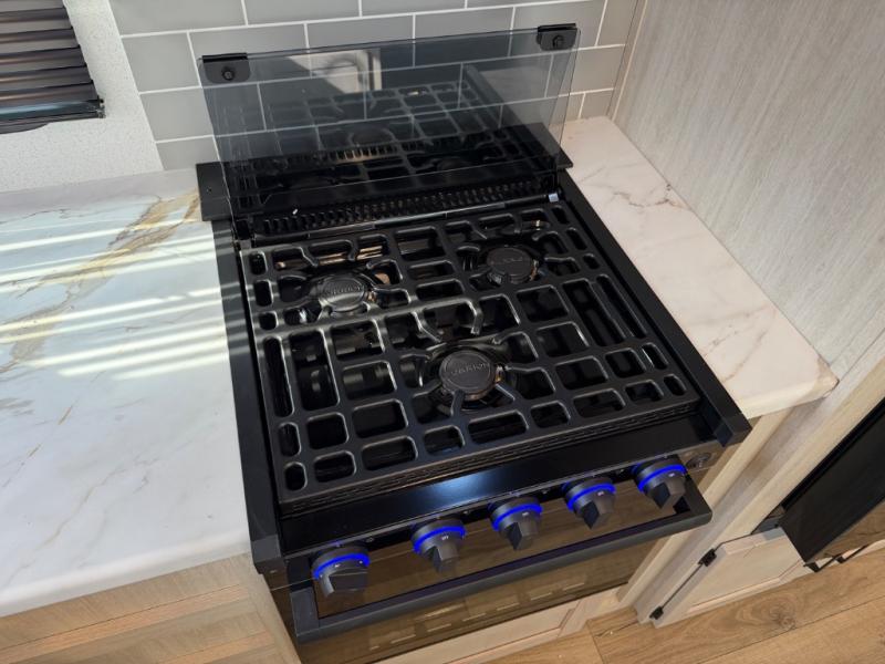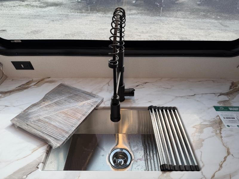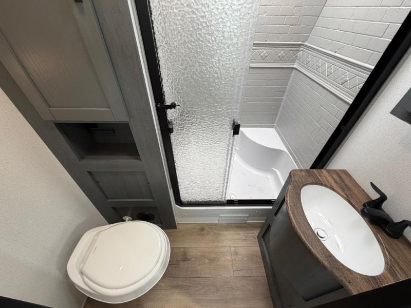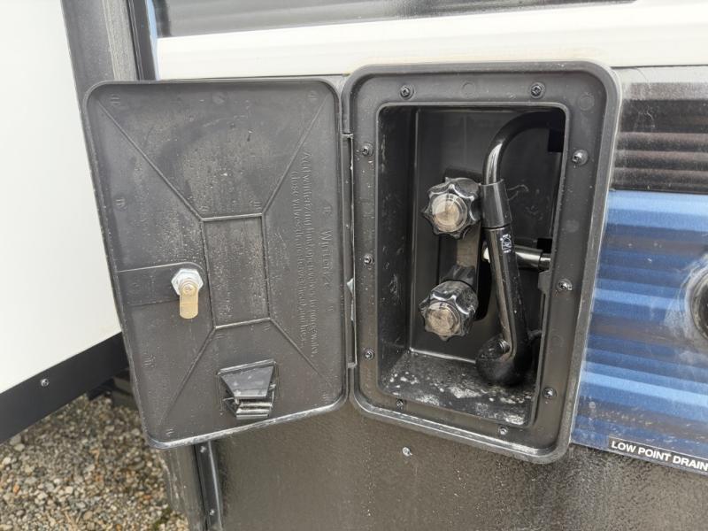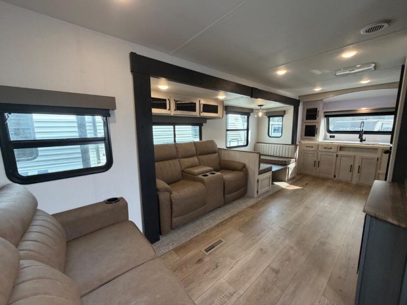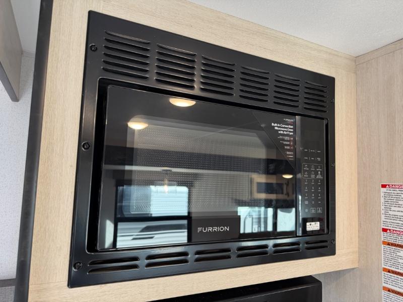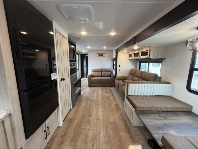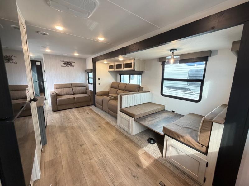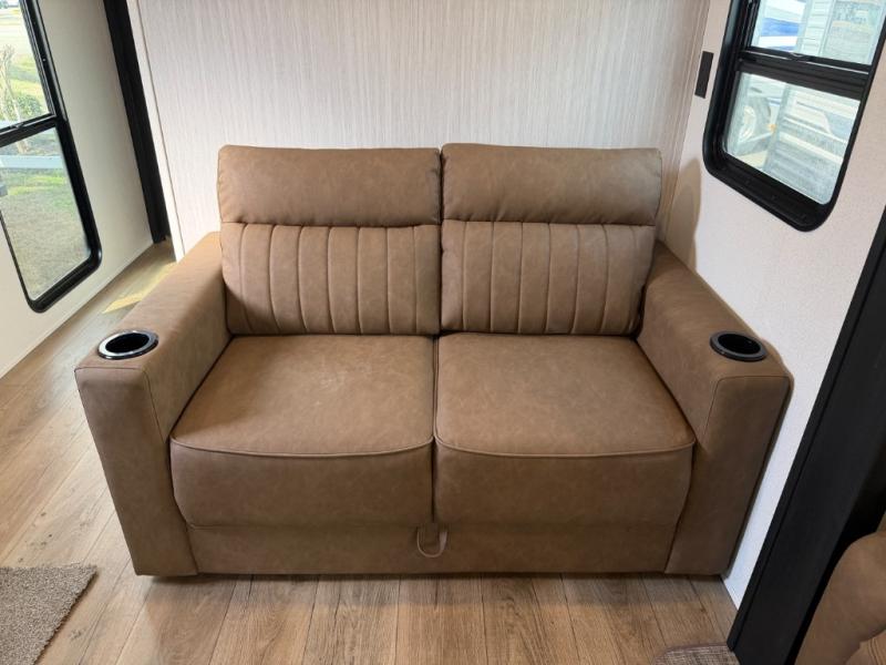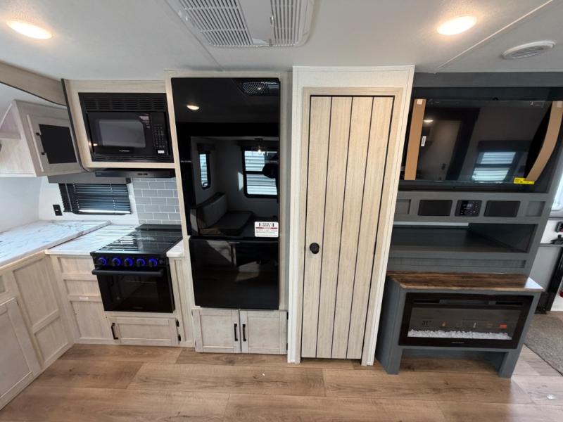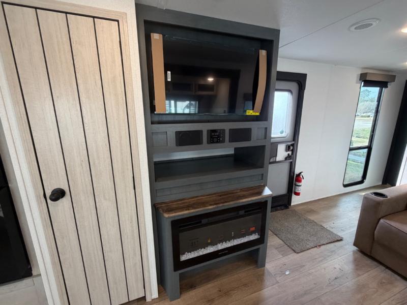 Experience a home away from home with this travel trailer! The front kitchen has everything you will need to prepare your best meals, and you can enjoy them at the booth dinette. The rear private bedroom has a 72" x 80" king bed slide across from a dresser, a wardrobe, and a closet with washer and dryer prep. Freshen up in the full bathroom with the 32" x 40" shower and then enjoy a cup of coffee relaxing on the theater seating or on the sofa! Choose the optional outside micro kitchen with a griddle for even more convenience!