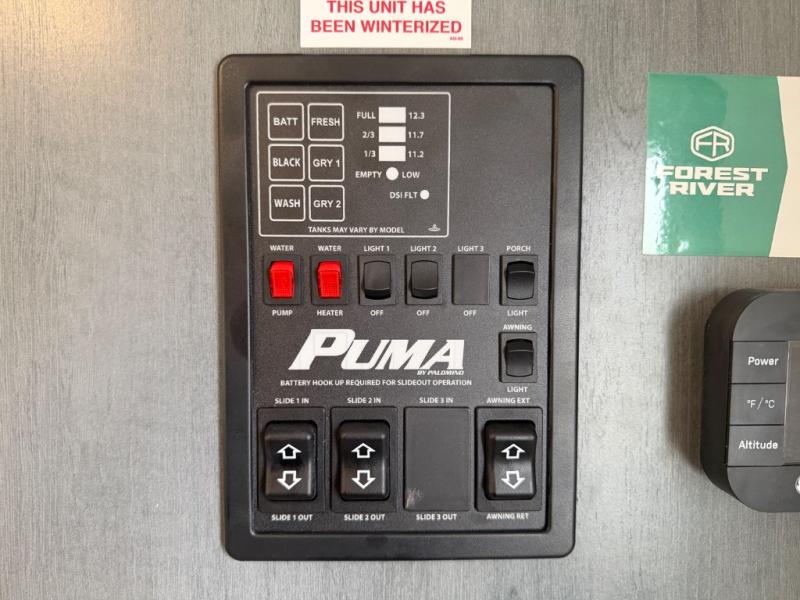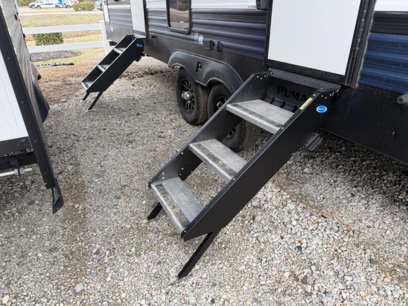 If you're looking for family-fun adventures, then you need one of these Forest River Puma travel trailers! They are built rugged, easy to tow, and jam packed with features. The Darco wrapped underbelly will help protect your unit, and the roof and side mount solar prep gives you the option to add off-grid power. Inside, the Congoleum linoleum will be easy to keep clean, and the night roller shades will provide privacy when it's time to turn in. You'll also enjoy an electric awning with an LED light strip plus an AM/FM/Bluetooth stereo and two outside speakers to keep the party going!