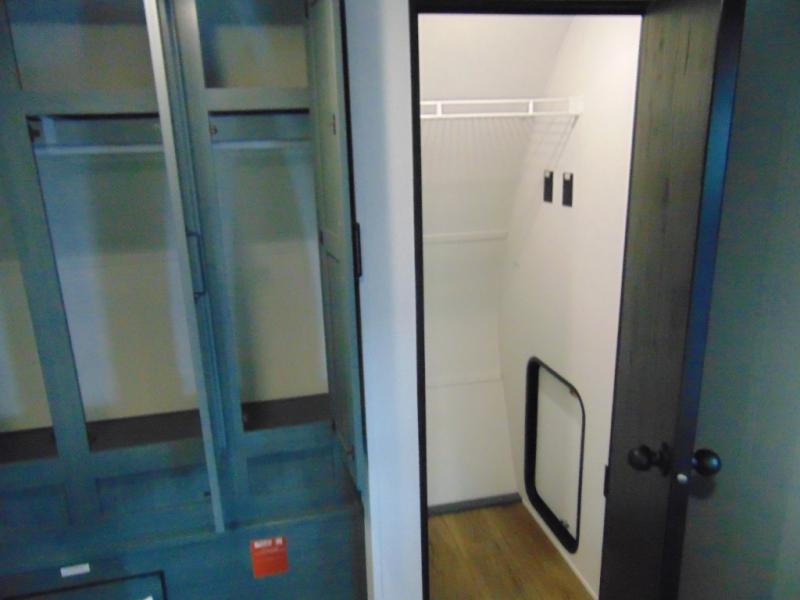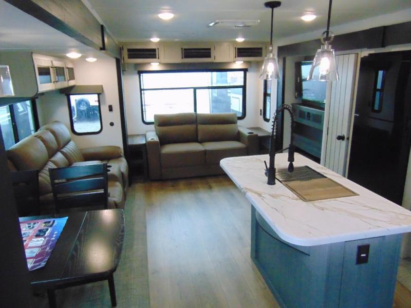 You're going to feel right at home in this travel trailer! The front private bedroom has a queen bed slide for a good night's rest, a dresser and front closet for your clothes, and another closet with washer and dryer prep. Freshen up each morning in the full bathroom with the 32" x 40" shower with a seat and then head to the kitchen to fry up some eggs on the stainless steel oven and range. You will also appreciate having a kitchen island for easier meal prep and a walk-in pantry to easily see your canned goods and snacks. The booth dinette offers a comfortable place to dine, play, and even sleep once converted. What better way to wind down your nights than to relax on either the rear sofa or in one of the two recliners across from the entertainment center with a fireplace!