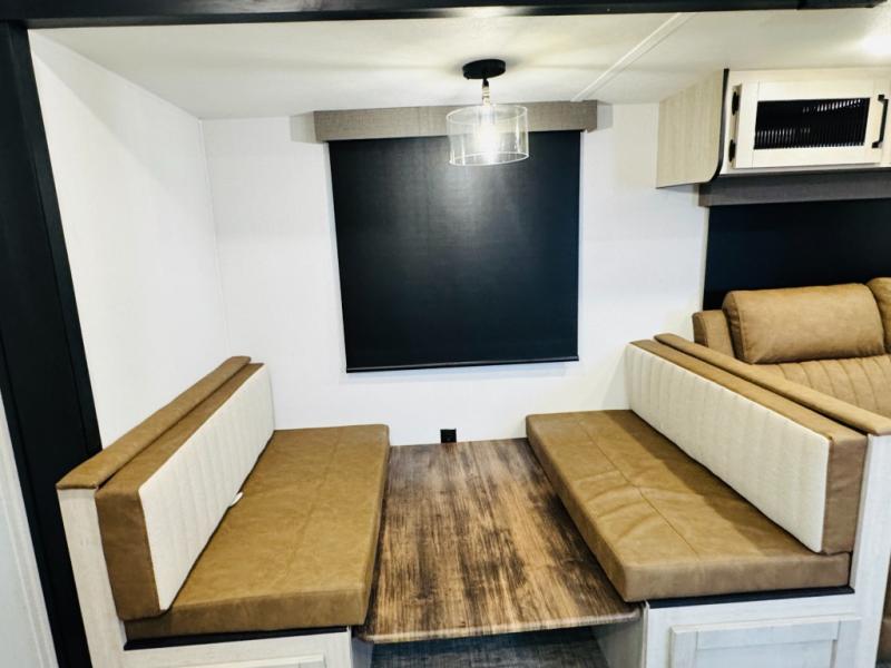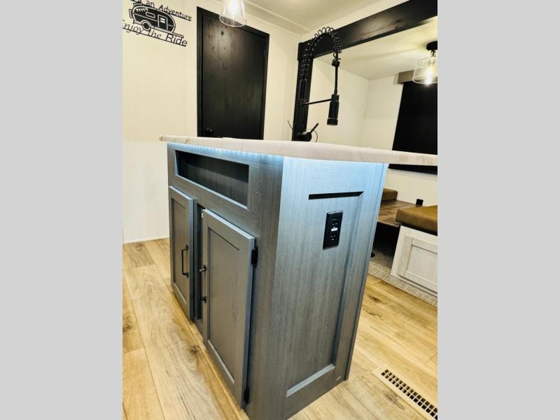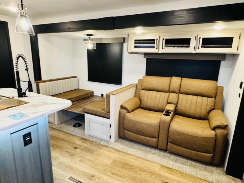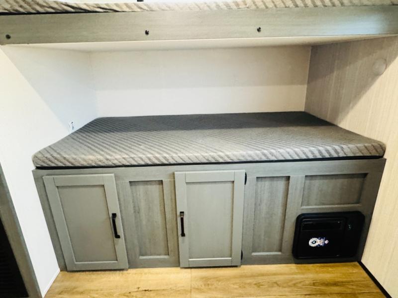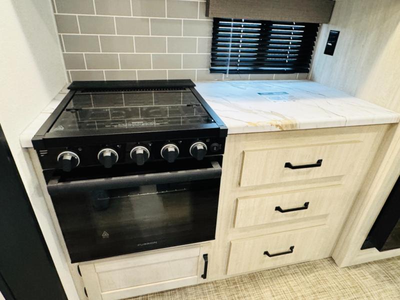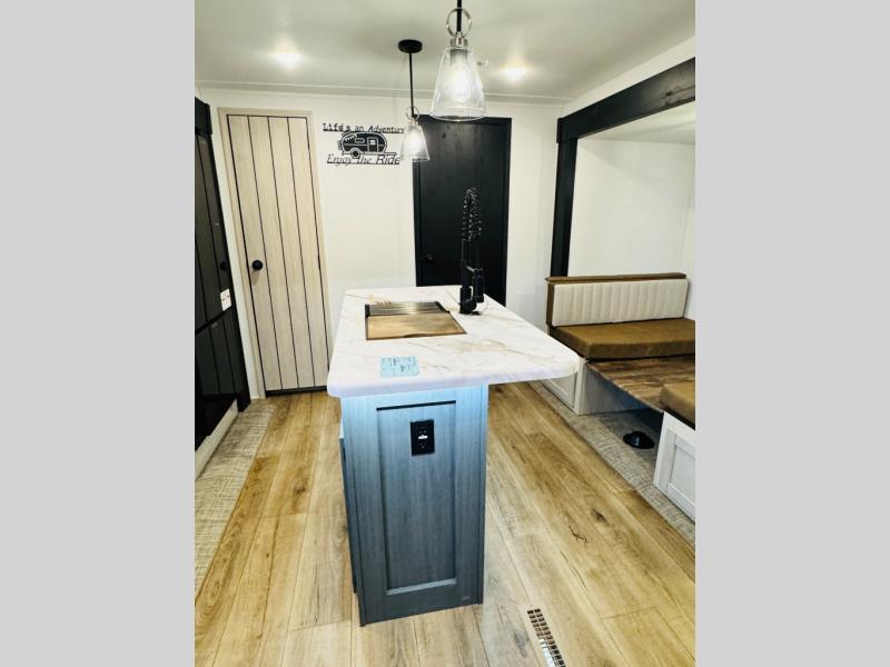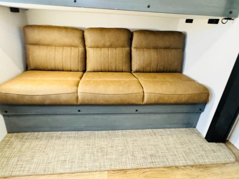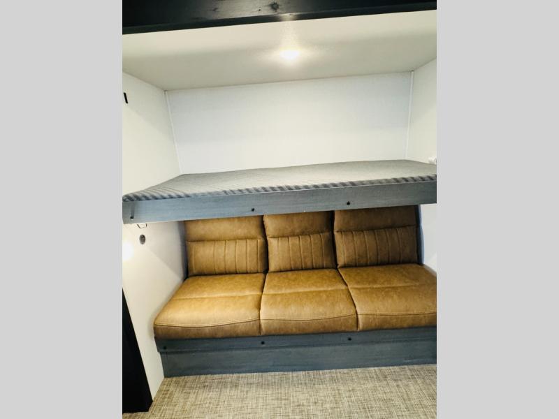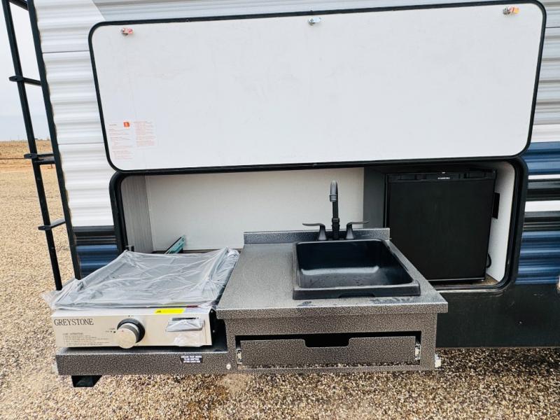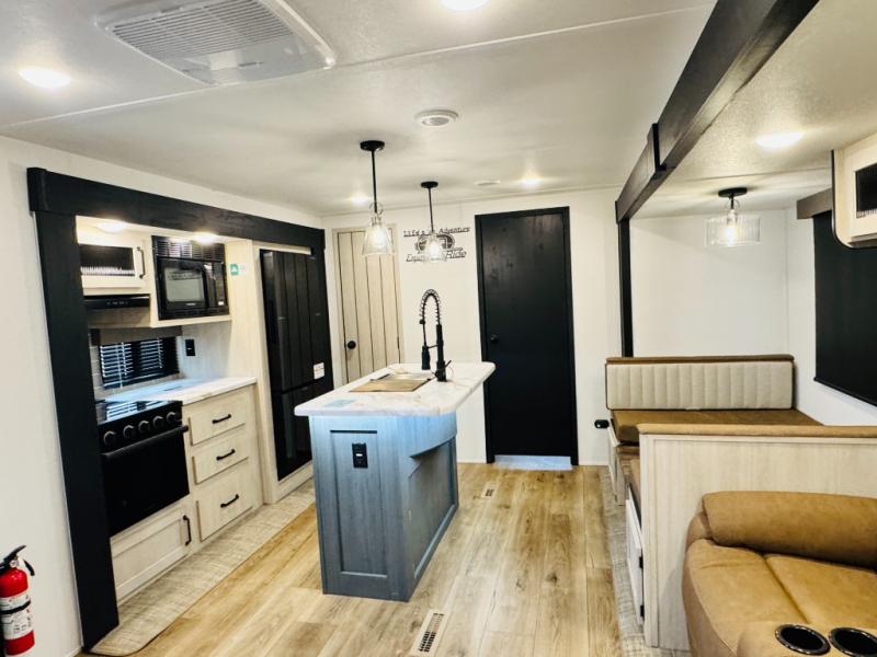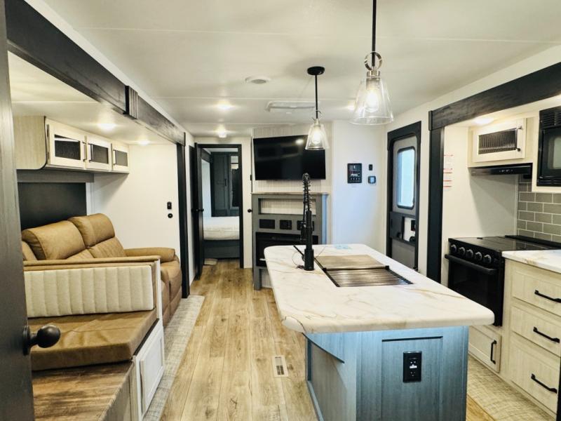 You will be the talk of the campground with this travel trailer! The front private bedroom has a queen bed slide across from a dresser and a front closet plus a second closet with washer and dryer prep. Freshen up each morning in the full bathroom with the 34" x 34" radius shower then head to the kitchen to fry up some eggs with the stainless-steel oven and range. You can enjoy your meals at the booth dinette, and the kitchen island will make your clean up easier with the sink that has a high-rise faucet and sprayer. The rear private bunkhouse has a 32" x 69" bunk above a jiffy sofa slide, a 36" x 69" bunk above a 36" x 71" bunk and a linen closet. Choose one of the outside kitchen options for even more convenience!