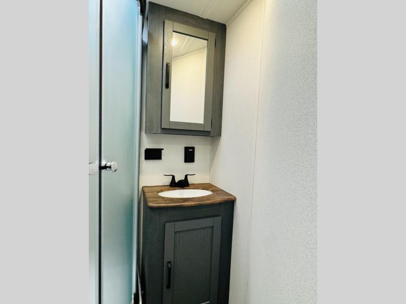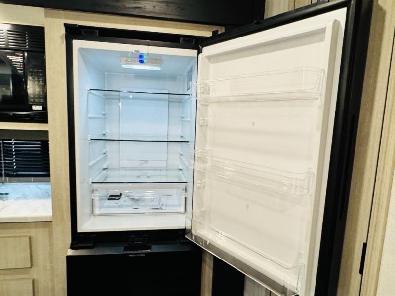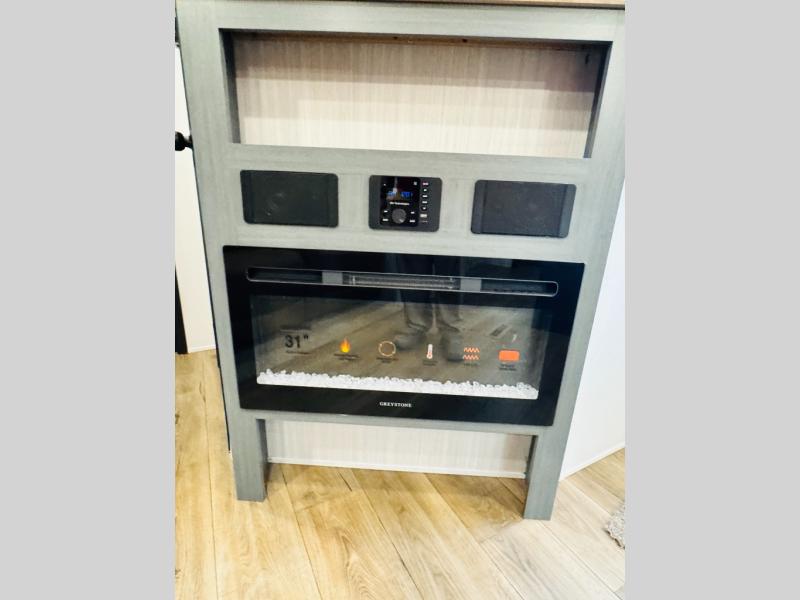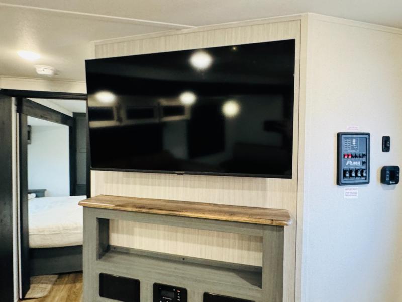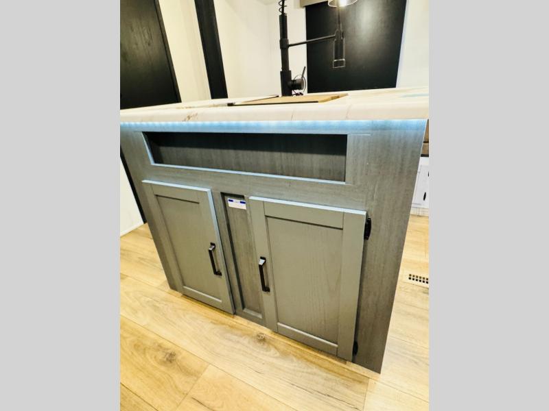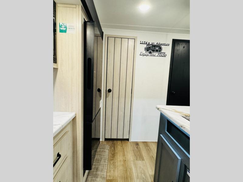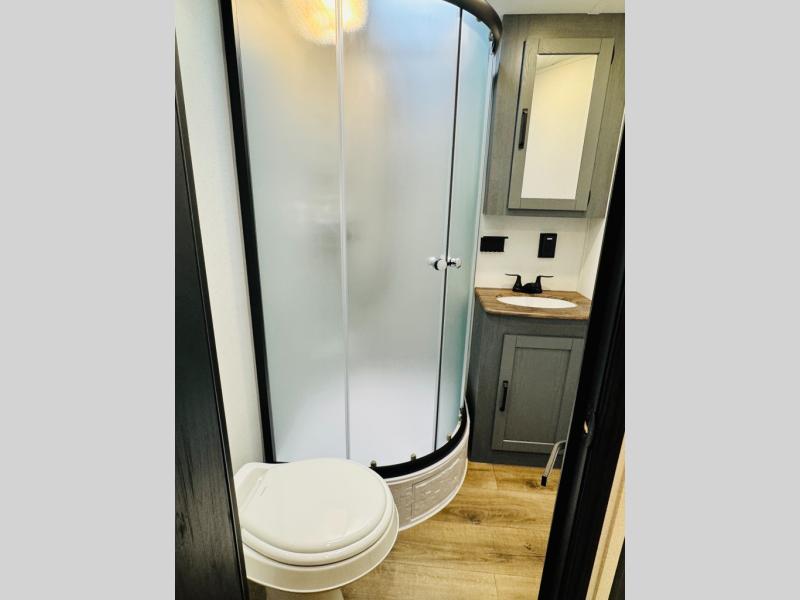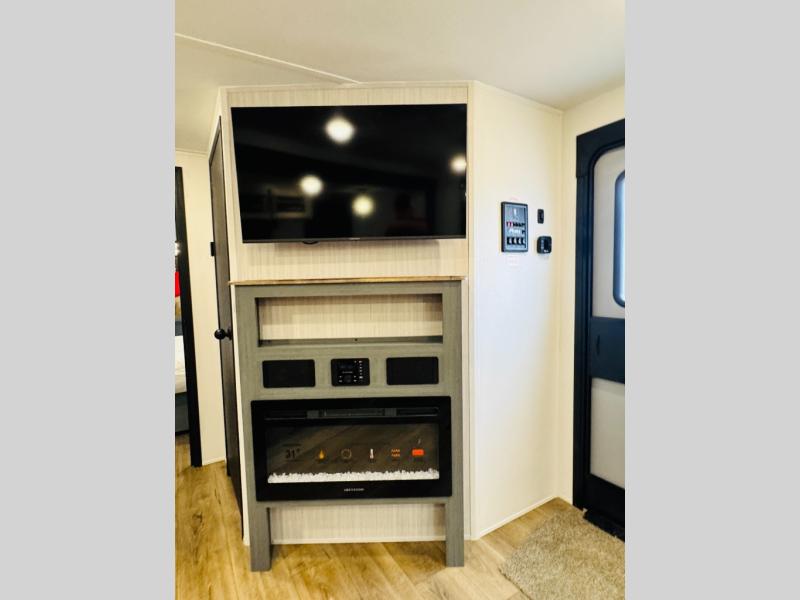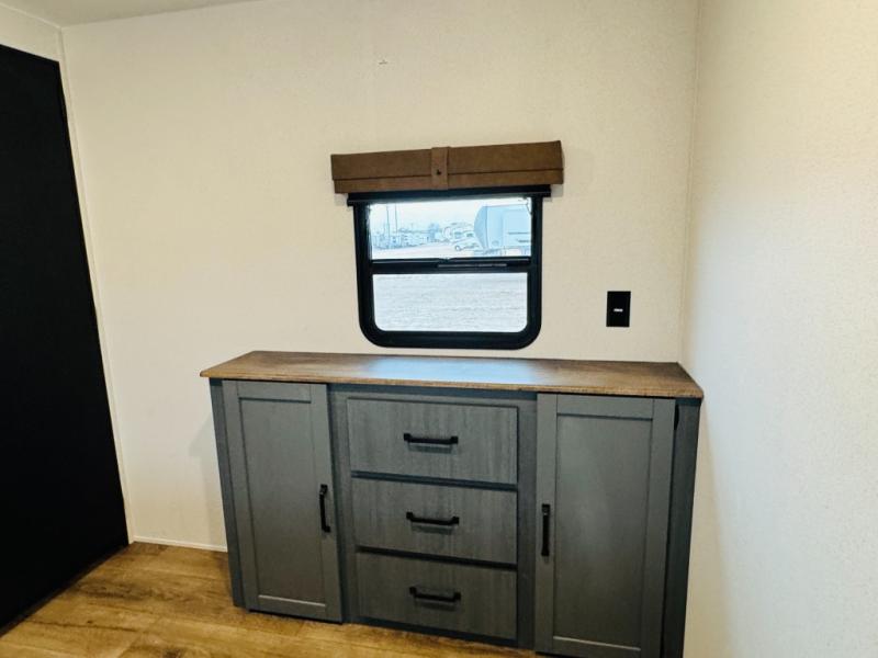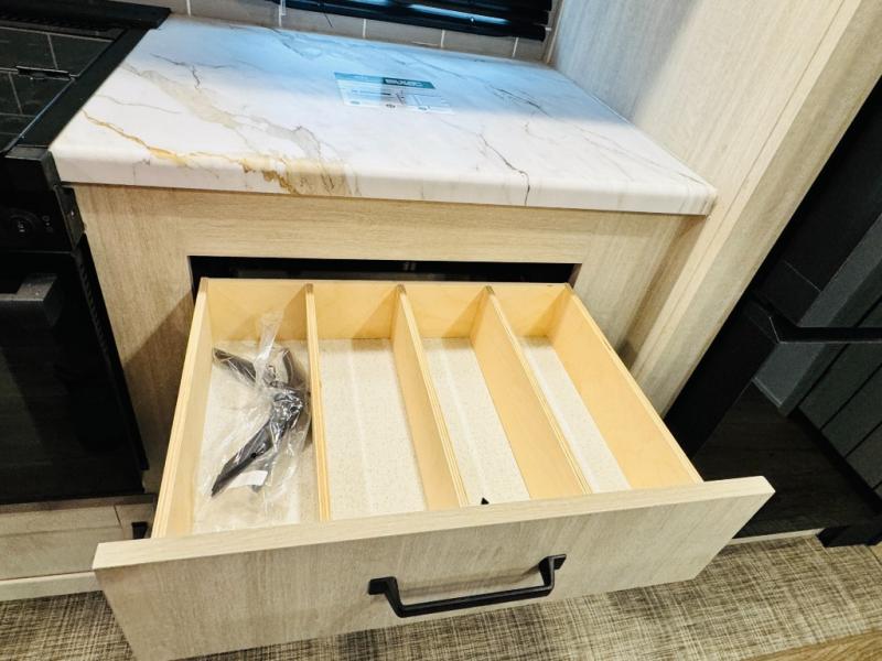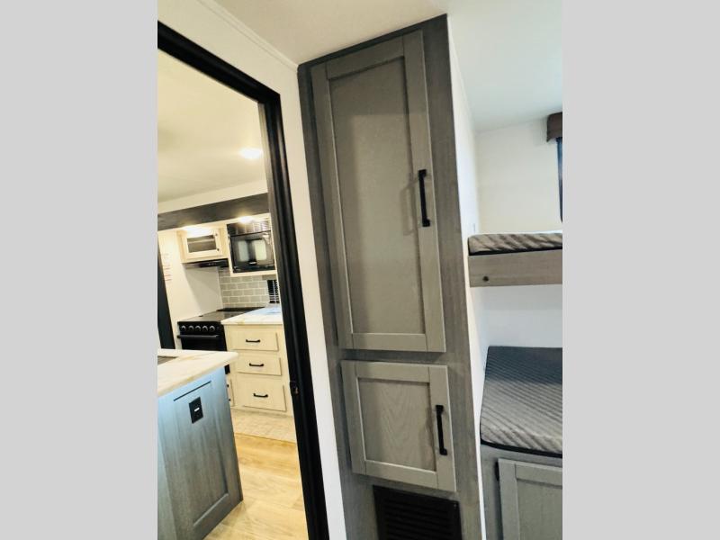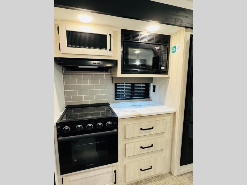 You will be the talk of the campground with this travel trailer! The front private bedroom has a queen bed slide across from a dresser and a front closet plus a second closet with washer and dryer prep. Freshen up each morning in the full bathroom with the 34" x 34" radius shower then head to the kitchen to fry up some eggs with the stainless-steel oven and range. You can enjoy your meals at the booth dinette, and the kitchen island will make your clean up easier with the sink that has a high-rise faucet and sprayer. The rear private bunkhouse has a 32" x 69" bunk above a jiffy sofa slide, a 36" x 69" bunk above a 36" x 71" bunk and a linen closet. Choose one of the outside kitchen options for even more convenience!