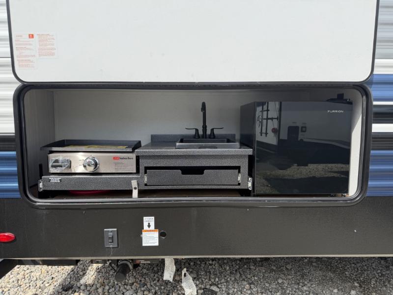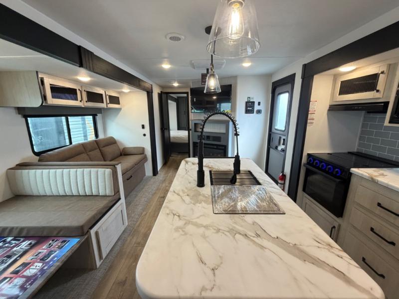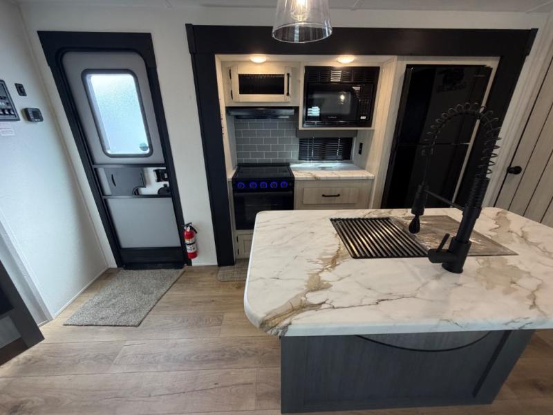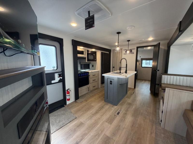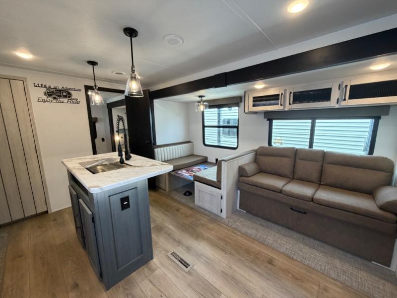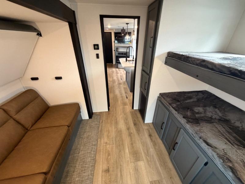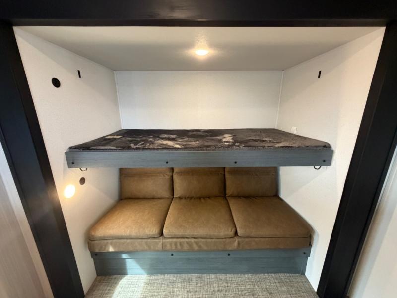You will be the talk of the campground with this travel trailer! The front private bedroom has a queen bed slide across from a dresser and a front closet plus a second closet with washer and dryer prep. Freshen up each morning in the full bathroom with the 34" x 34" radius shower then head to the kitchen to fry up some eggs with the stainless-steel oven and range. You can enjoy your meals at the booth dinette, and the kitchen island will make your clean up easier with the sink that has a high-rise faucet and sprayer. The rear private bunkhouse has a 32" x 69" bunk above a jiffy sofa slide, a 36" x 69" bunk above a 36" x 71" bunk and a linen closet. Choose one of the outside kitchen options for even more convenience!