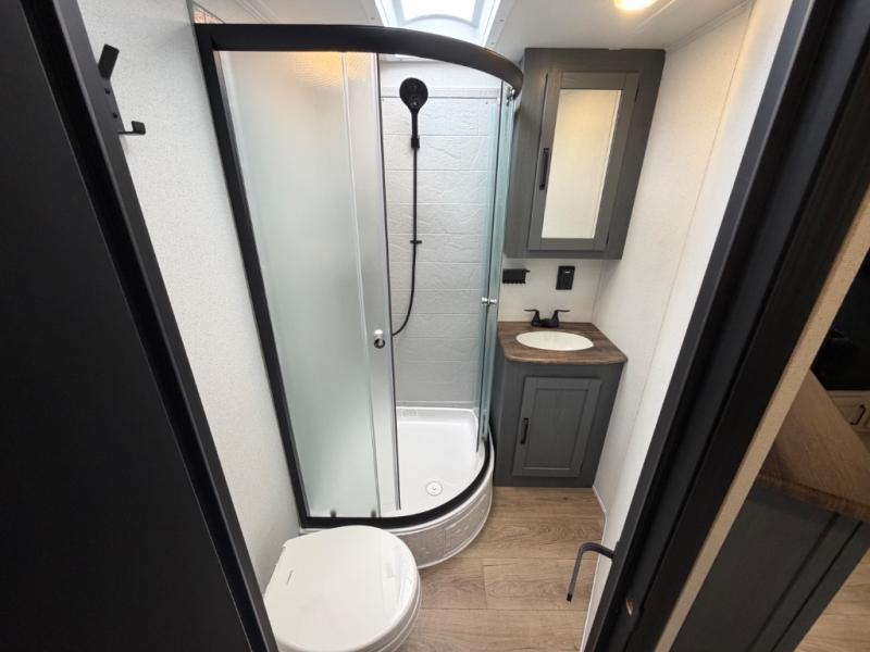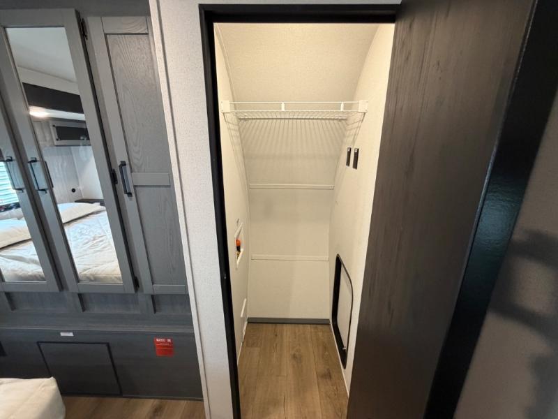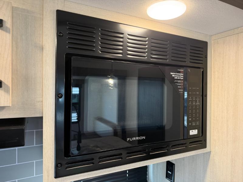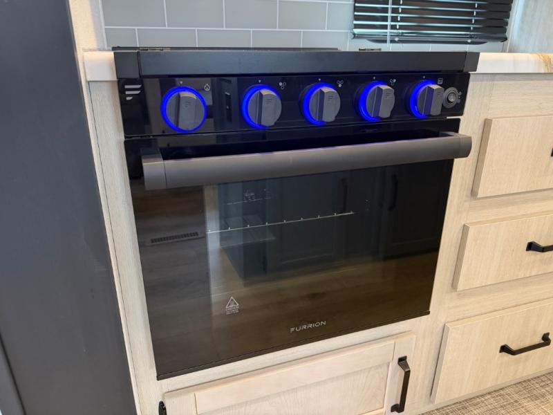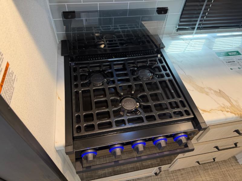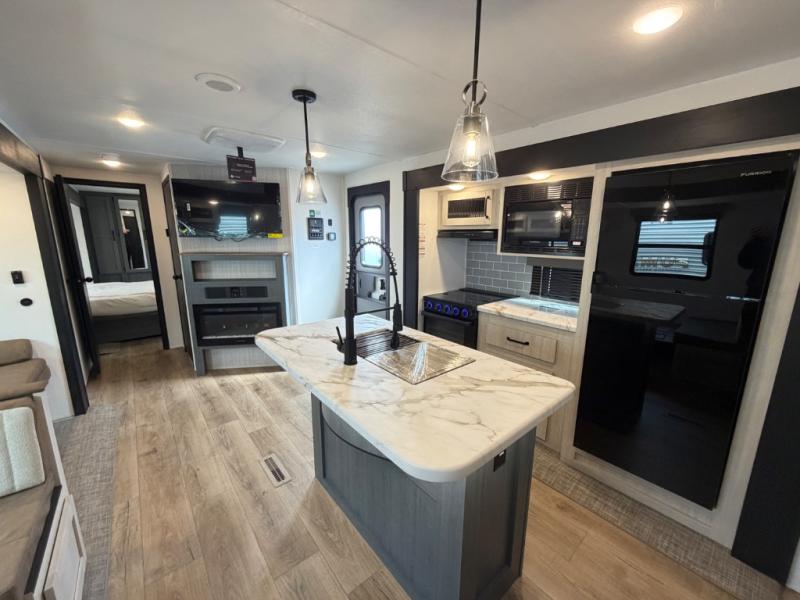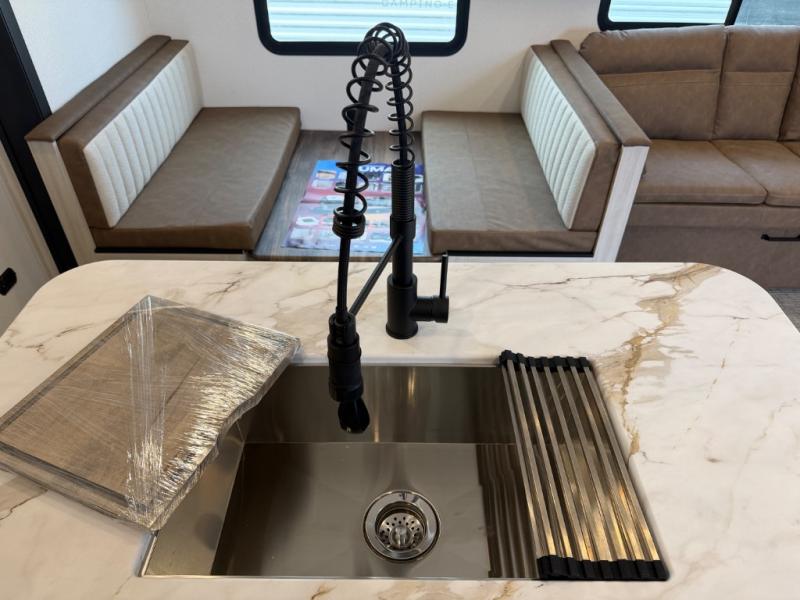 You will be the talk of the campground with this travel trailer! The front private bedroom has a queen bed slide across from a dresser and a front closet plus a second closet with washer and dryer prep. Freshen up each morning in the full bathroom with the 34" x 34" radius shower then head to the kitchen to fry up some eggs with the stainless-steel oven and range. You can enjoy your meals at the booth dinette, and the kitchen island will make your clean up easier with the sink that has a high-rise faucet and sprayer. The rear private bunkhouse has a 32" x 69" bunk above a jiffy sofa slide, a 36" x 69" bunk above a 36" x 71" bunk and a linen closet. Choose one of the outside kitchen options for even more convenience!