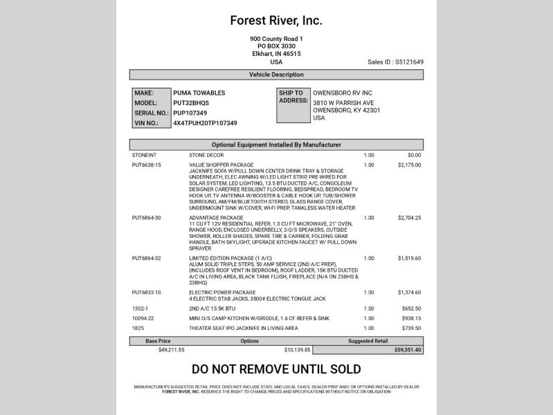 If you're looking for family-fun adventures, then you need one of these Forest River Puma travel trailers! They are built rugged, easy to tow, and jam packed with features. The Darco wrapped underbelly will help protect your unit, and the roof and side mount solar prep gives you the option to add off-grid power. Inside, the Congoleum linoleum will be easy to keep clean, and the night roller shades will provide privacy when it's time to turn in. You'll also enjoy an electric awning with an LED light strip plus an AM/FM/Bluetooth stereo and two outside speakers to keep the party going!