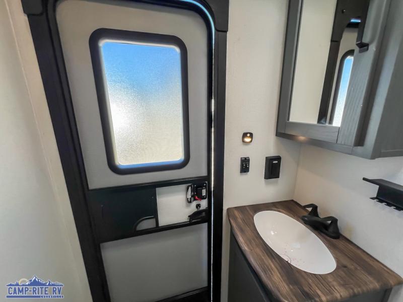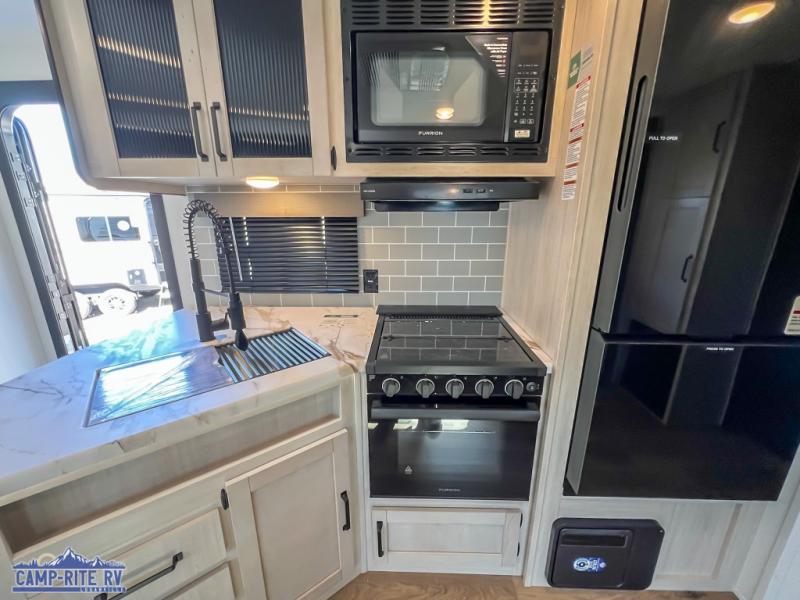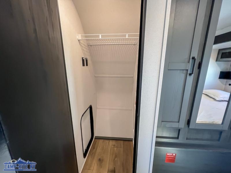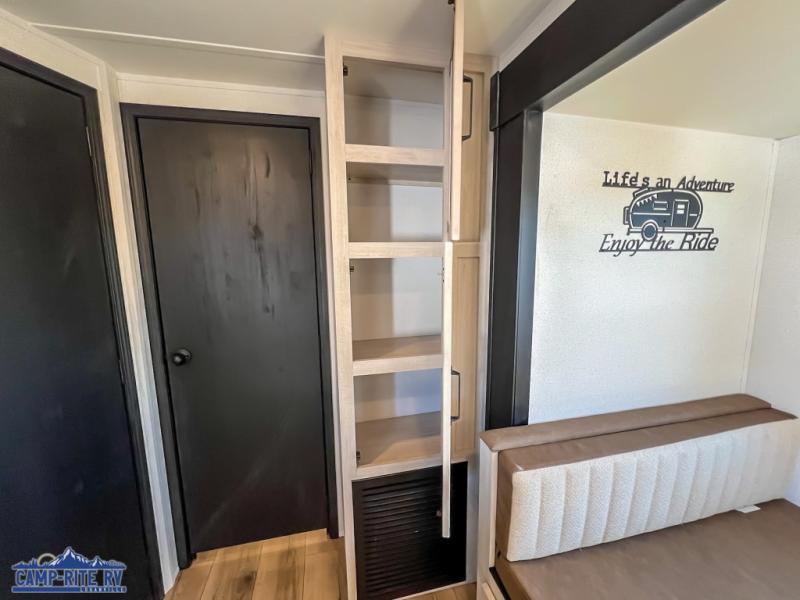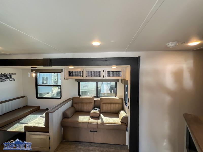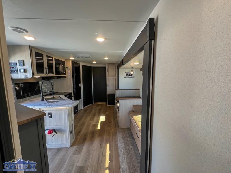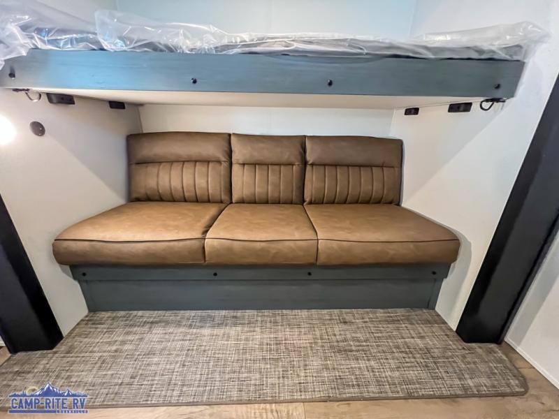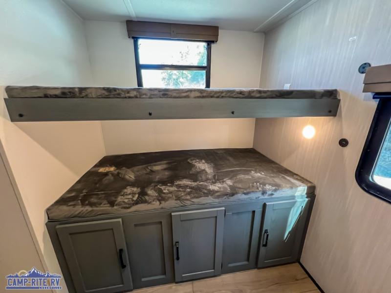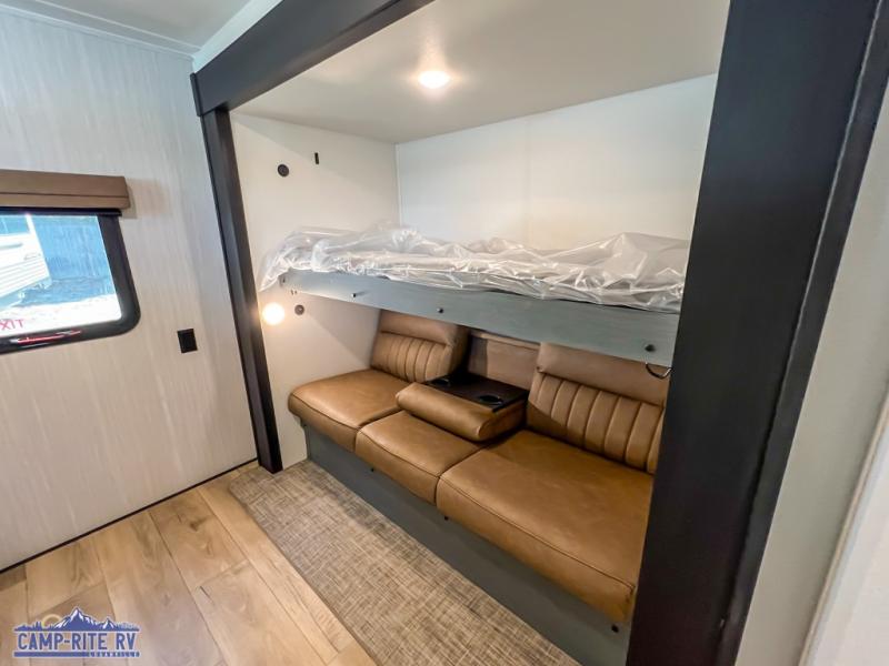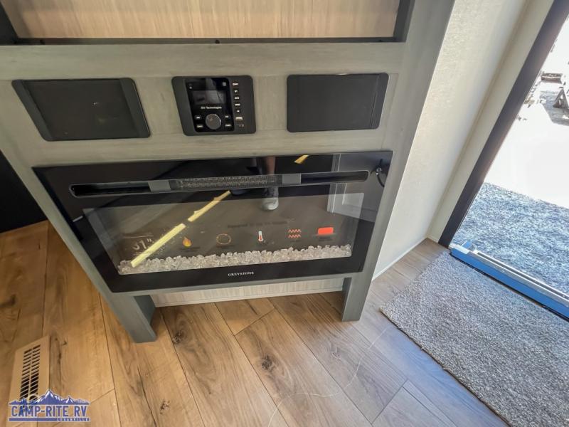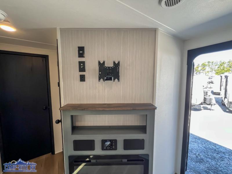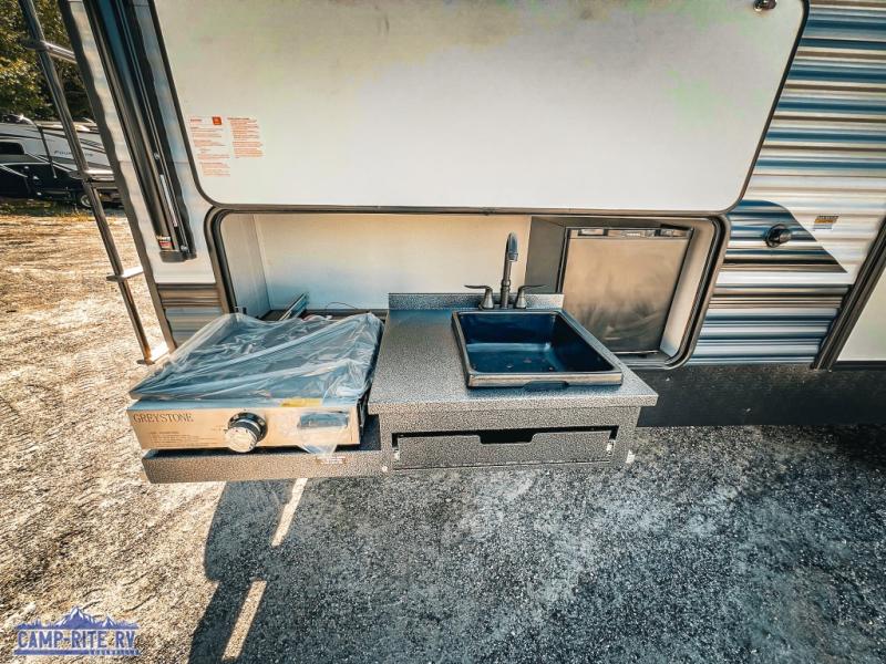 With dual entry doors and a bath and a half, you will have the ultimate in convenience with this travel trailer! The bedroom also has a front closet to keep your clothes looking their best and a queen bed slide for you to sleep your best. Everyone can freshen up in the full bathroom with the 34" x 34" radius shower and fill their bellies with scrambled eggs cooked with the stainless steel oven and range. Enjoy your meals, play games, and even sleep at the booth dinette or relax on the sofa while watching a movie with the entertainment center and fireplace. And your guests will love the rear private bunkhouse with three bunks, a jiffy sofa, and a slide out for more space! This model also includes an optional outside mini kitchen with a griddle!