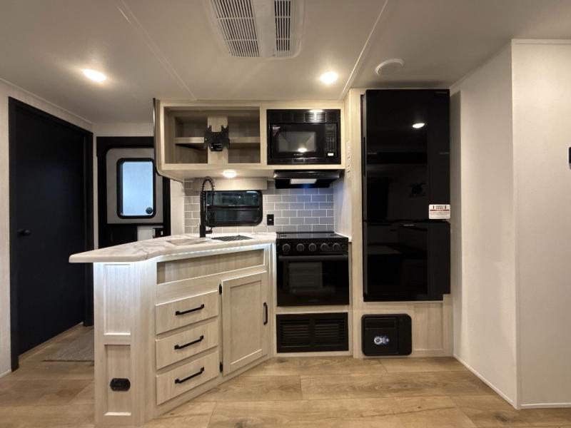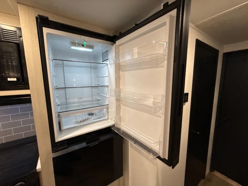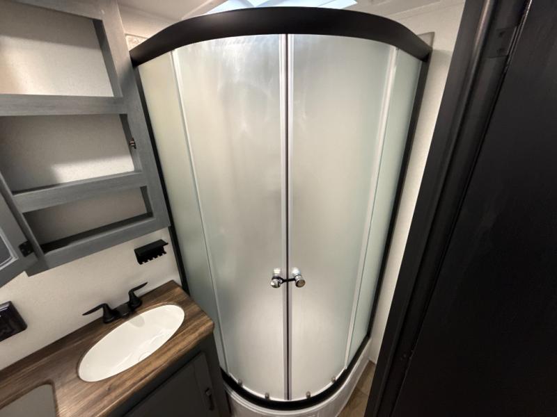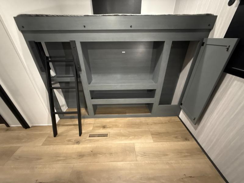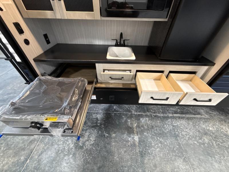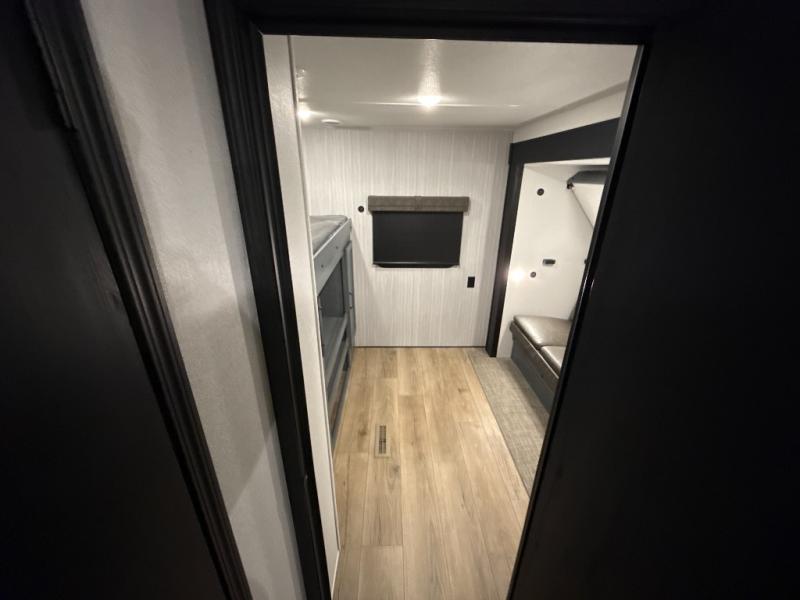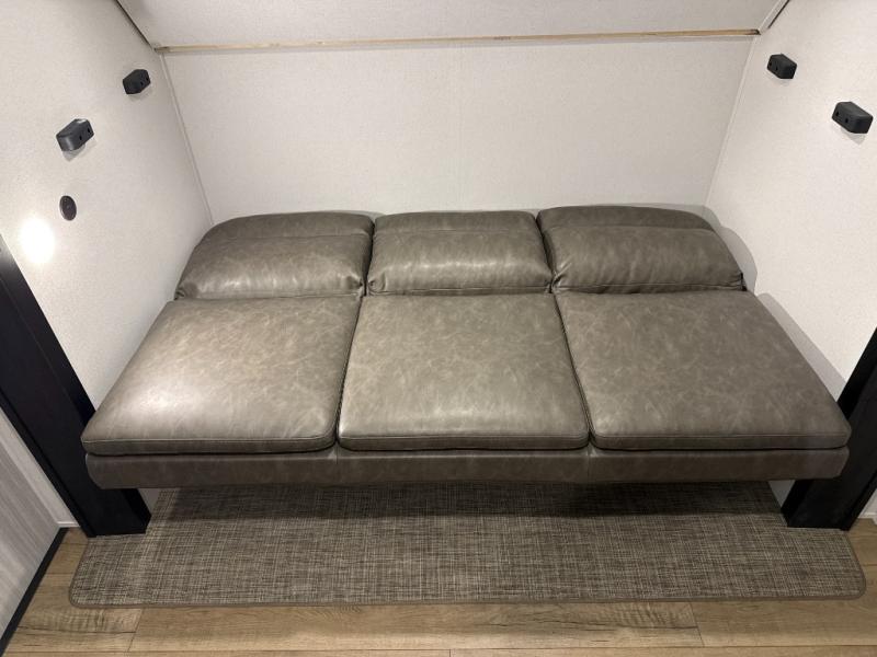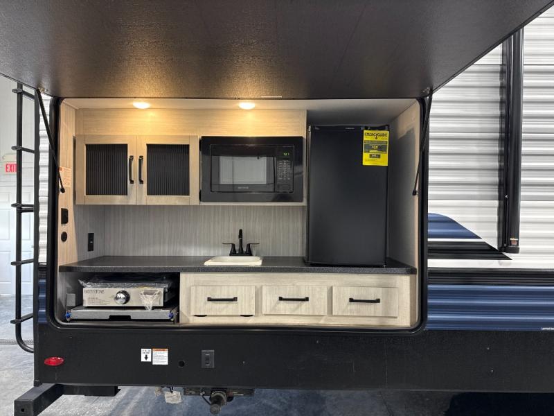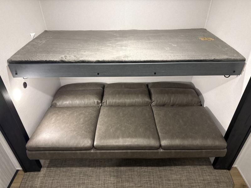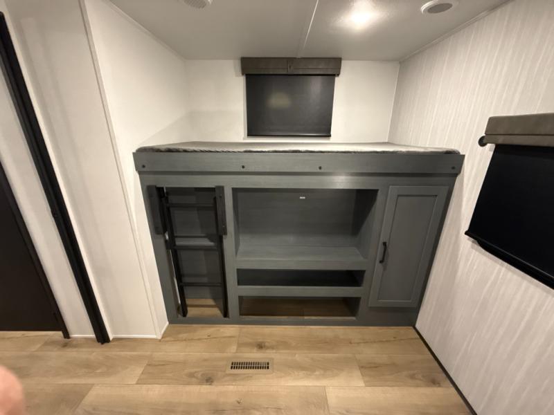 The whole family will love camping in this travel trailer! The kids will have their own privacy with the rear private bunkhouse which has a 32" x 69" bunk above a jiffy sofa slide and a 38" x 76" bunk above an entertainment center to keep them occupied on those rainy days. And you will have your own privacy with the front private bedroom that has a queen bed slide across from a dresser and a front closet. There is even a second closet with washer and dryer prep if you choose to add those appliances. Everyone can stay clean in the full bathroom with the 34" x 34" radius shower and their bellies full with the full kitchen. And you can choose between two outside kitchen options for even more convenience!