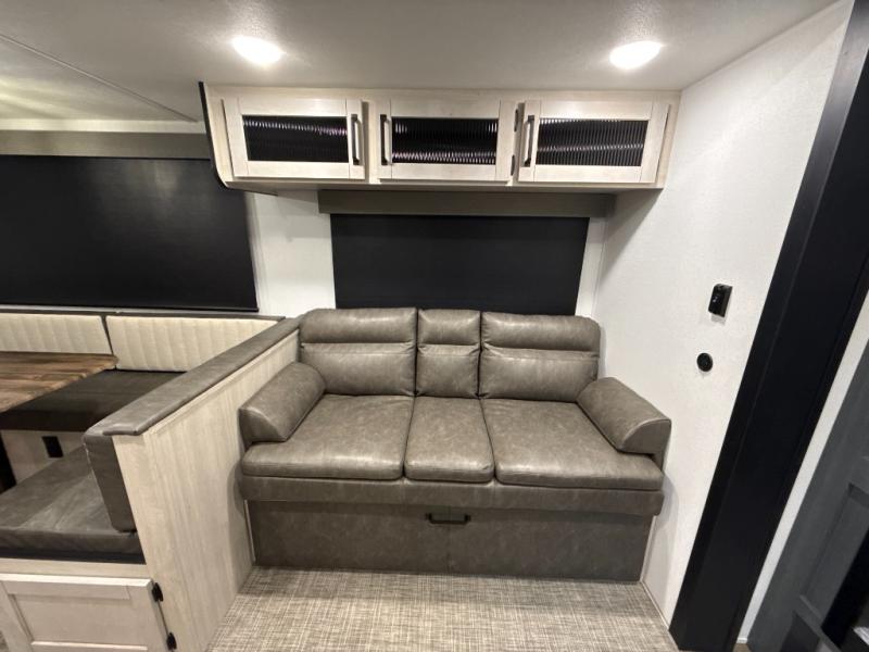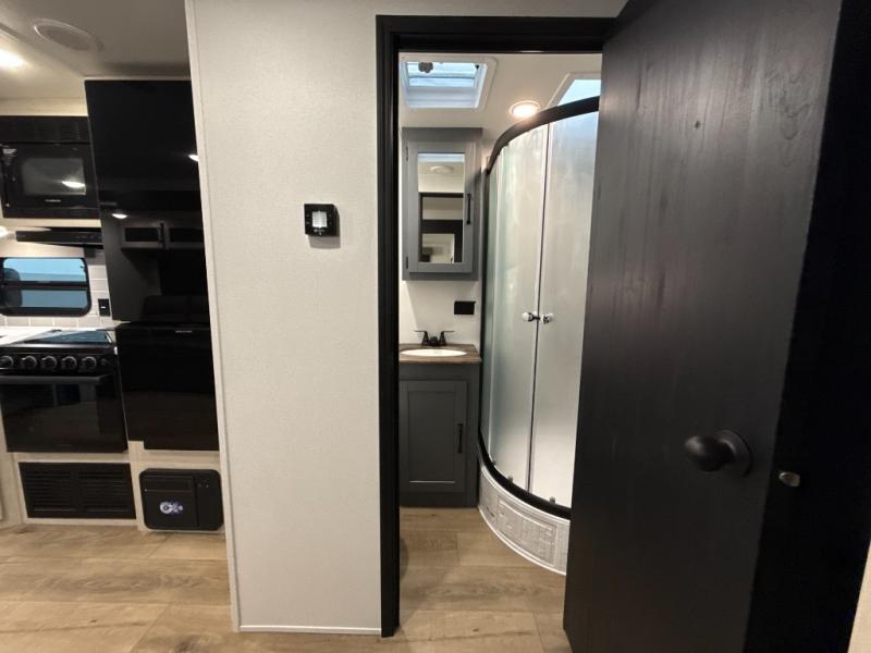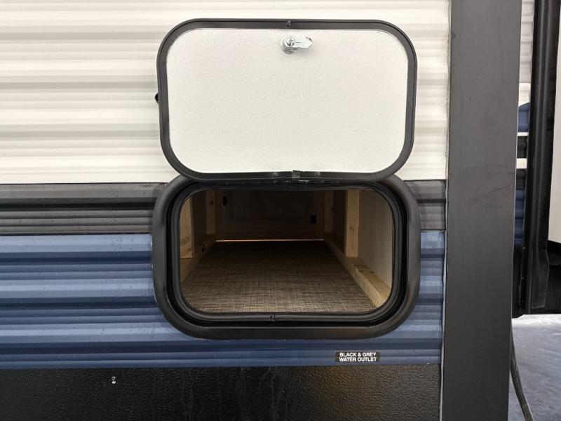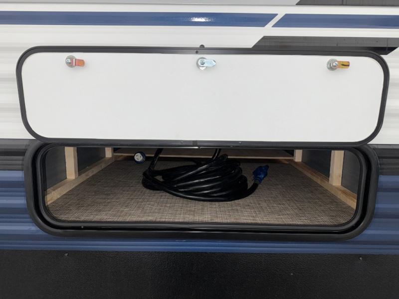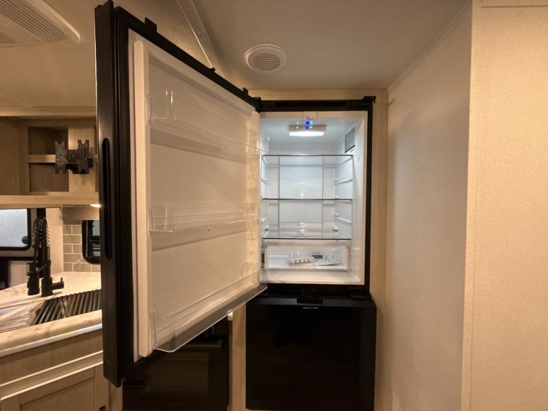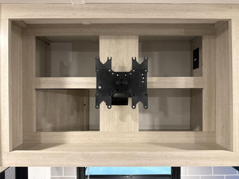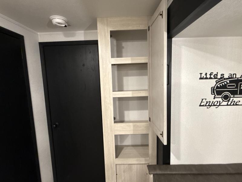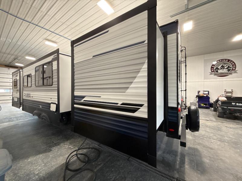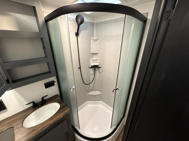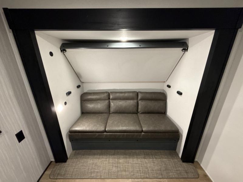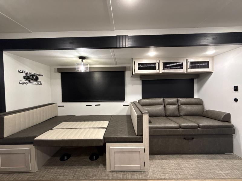 The whole family will love camping in this travel trailer! The kids will have their own privacy with the rear private bunkhouse which has a 32" x 69" bunk above a jiffy sofa slide and a 38" x 76" bunk above an entertainment center to keep them occupied on those rainy days. And you will have your own privacy with the front private bedroom that has a queen bed slide across from a dresser and a front closet. There is even a second closet with washer and dryer prep if you choose to add those appliances. Everyone can stay clean in the full bathroom with the 34" x 34" radius shower and their bellies full with the full kitchen. And you can choose between two outside kitchen options for even more convenience!