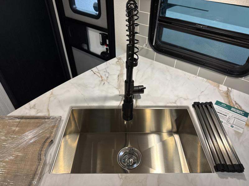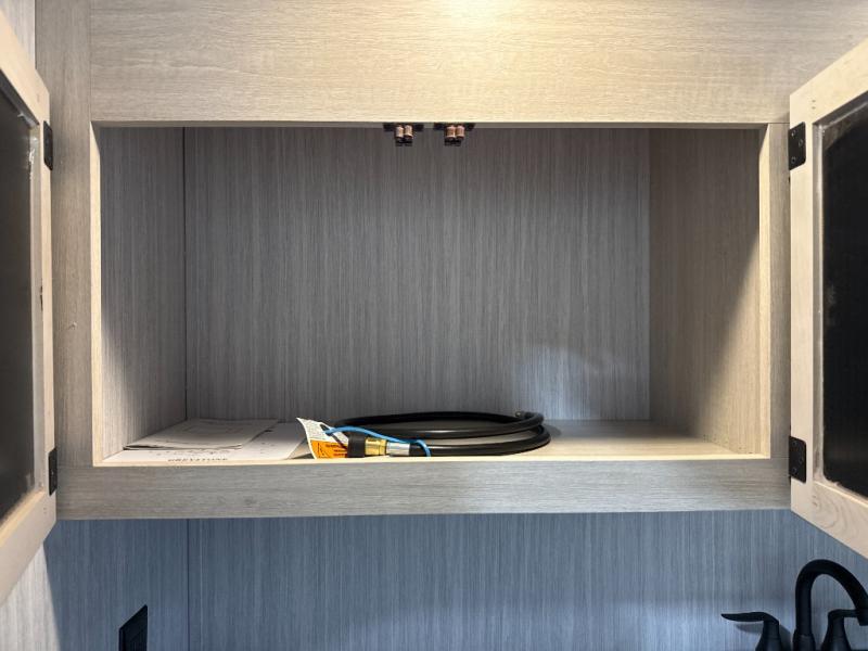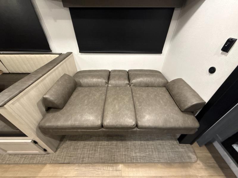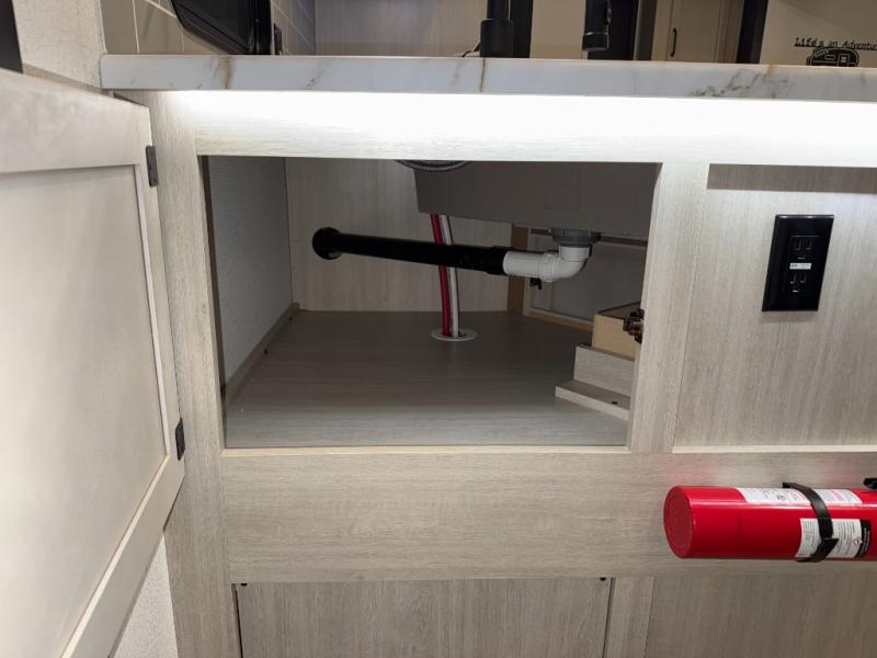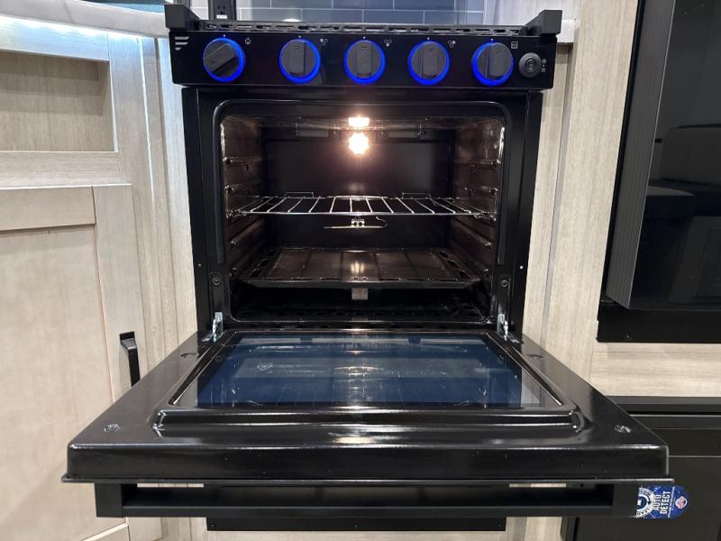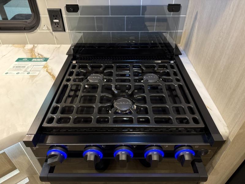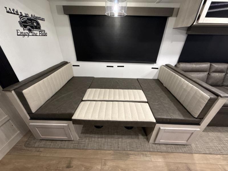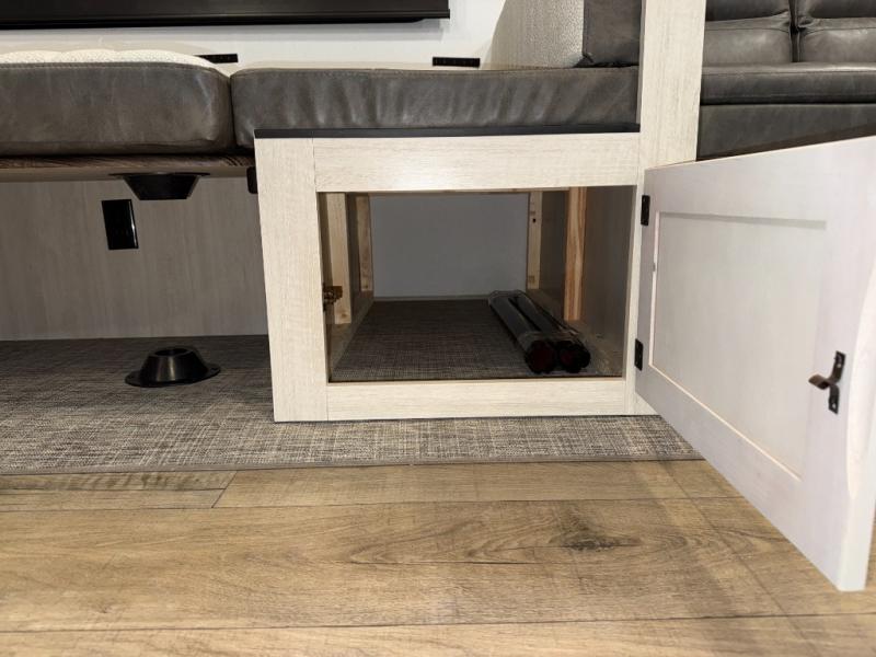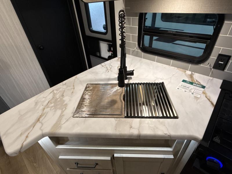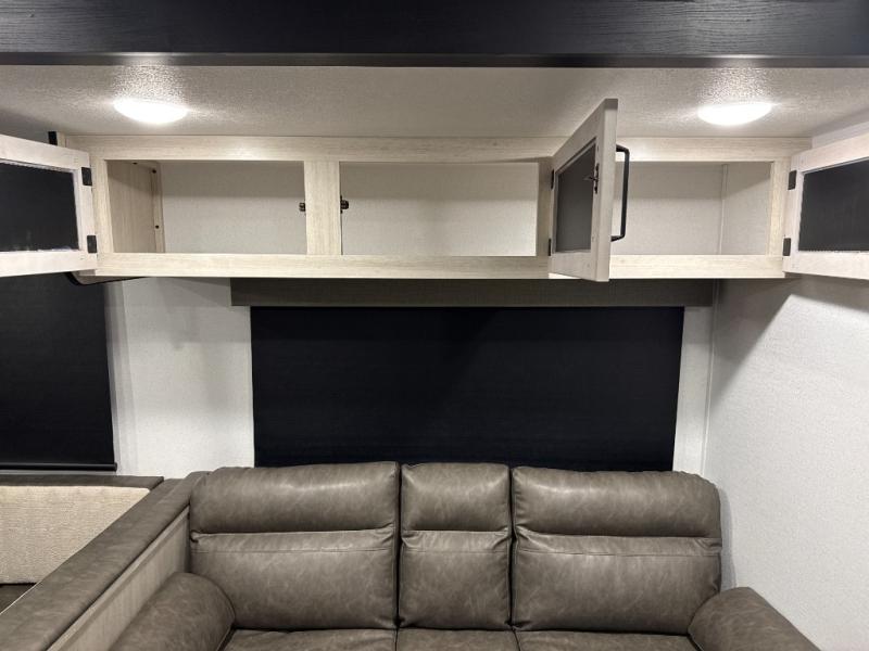 The whole family will love camping in this travel trailer! The kids will have their own privacy with the rear private bunkhouse which has a 32" x 69" bunk above a jiffy sofa slide and a 38" x 76" bunk above an entertainment center to keep them occupied on those rainy days. And you will have your own privacy with the front private bedroom that has a queen bed slide across from a dresser and a front closet. There is even a second closet with washer and dryer prep if you choose to add those appliances. Everyone can stay clean in the full bathroom with the 34" x 34" radius shower and their bellies full with the full kitchen. And you can choose between two outside kitchen options for even more convenience!