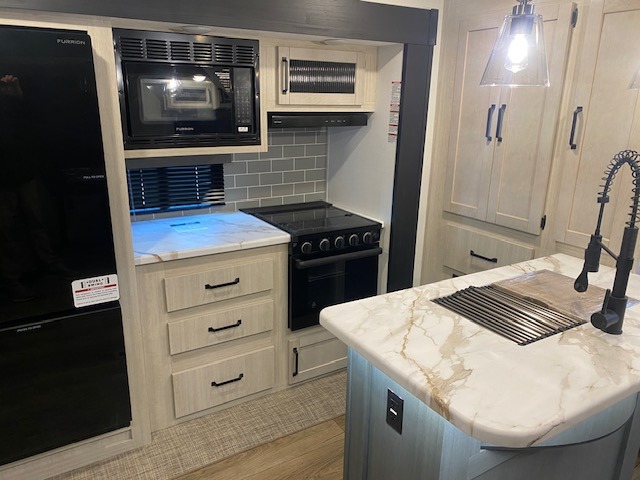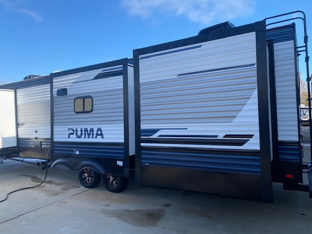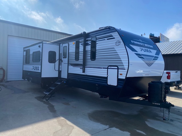 If you're looking for family-fun adventures, then you need one of these Forest River Puma travel trailers! They are built rugged, easy to tow, and jam packed with features. The Darco wrapped underbelly will help protect your unit, and the roof and side mount solar prep gives you the option to add off-grid power. Inside, the Congoleum linoleum will be easy to keep clean, and the night roller shades will provide privacy when it's time to turn in. You'll also enjoy an electric awning with an LED light strip plus an AM/FM/Bluetooth stereo and two outside speakers to keep the party going!