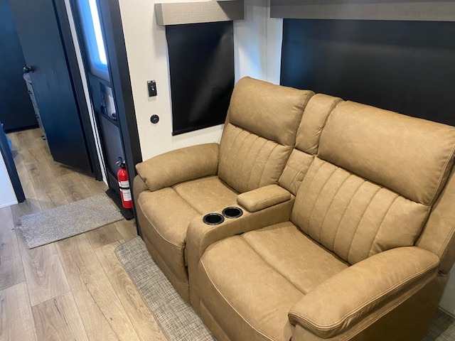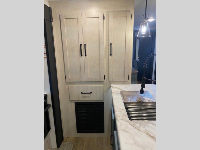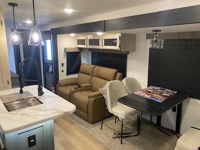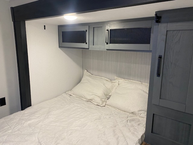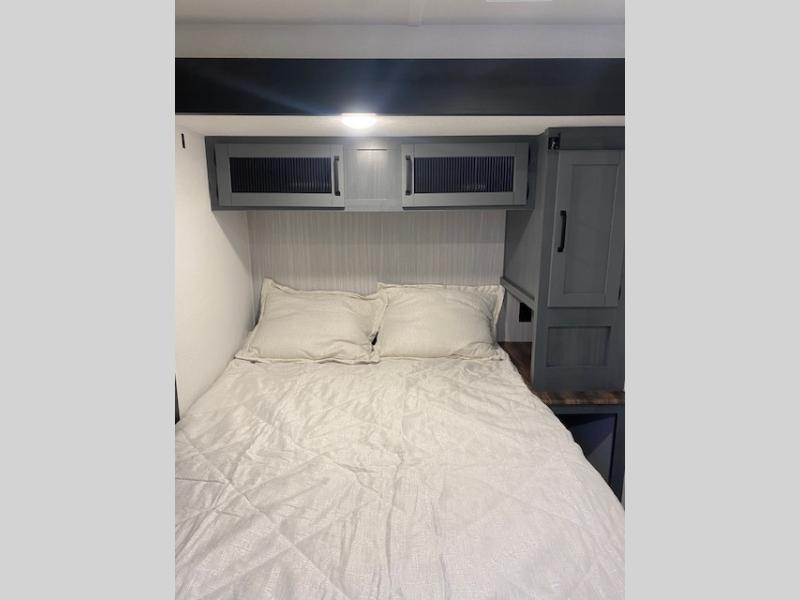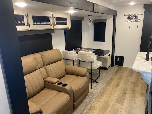 If you enjoy camping with friends or family, this travel trailer will be perfect for you! There are two bedrooms with queen bed slide outs and storage space, plus the rear bedroom includes its own full bath for added comfort. A bunkhouse suite option is also available if you choose the jiffy sofa with a bunk in place of the queen bed in the rear bedroom. Everyone can meet in the combined kitchen and living area that includes a counter peninsula, a spacious pantry, all the kitchen appliances to cook meals, plus a table with chairs and bench seating. There is also a sofa with overhead storage for more seating and sleeping space. Don't let this impressive travel trailer slip away!
