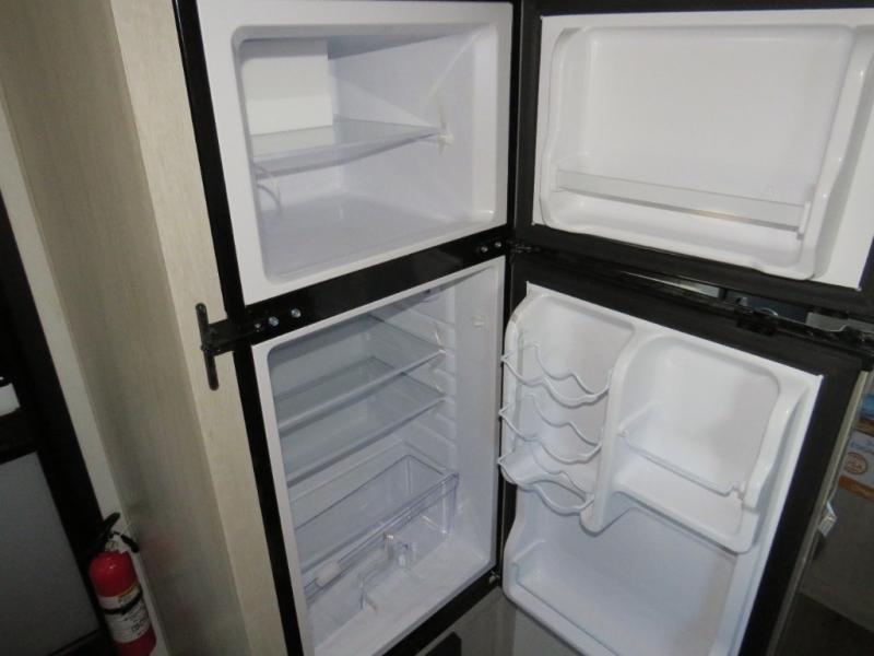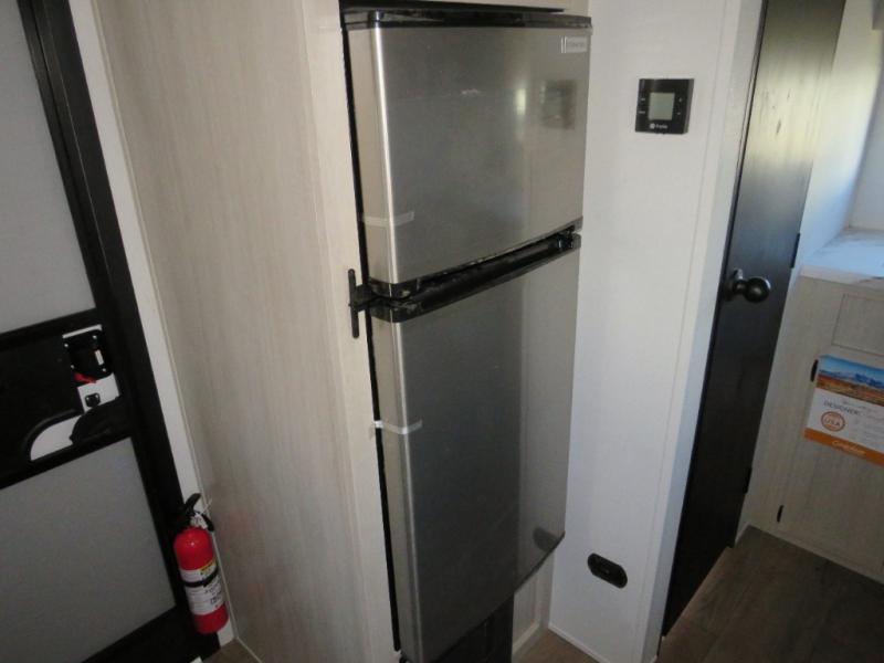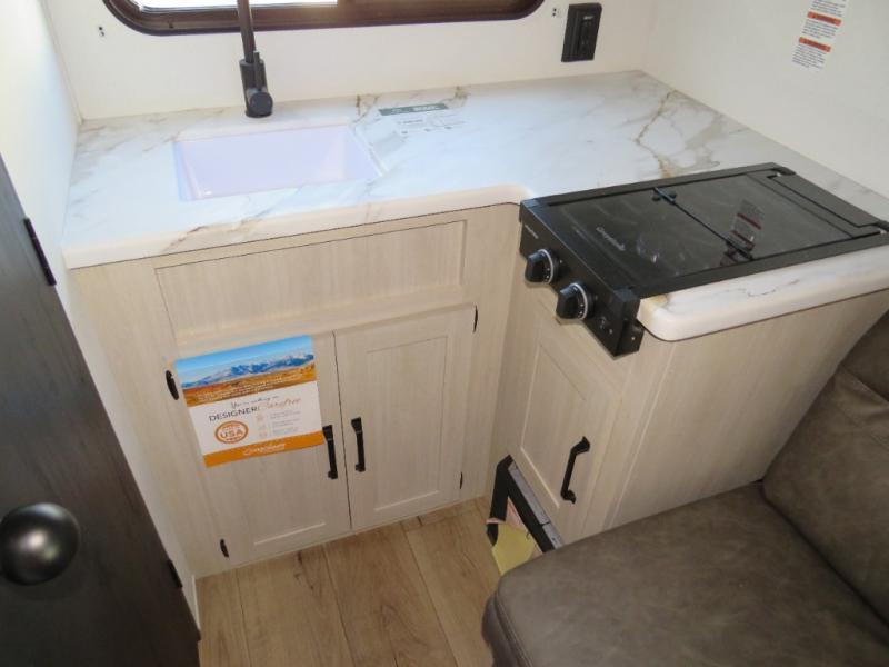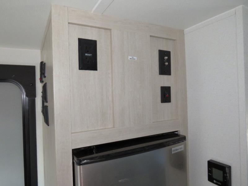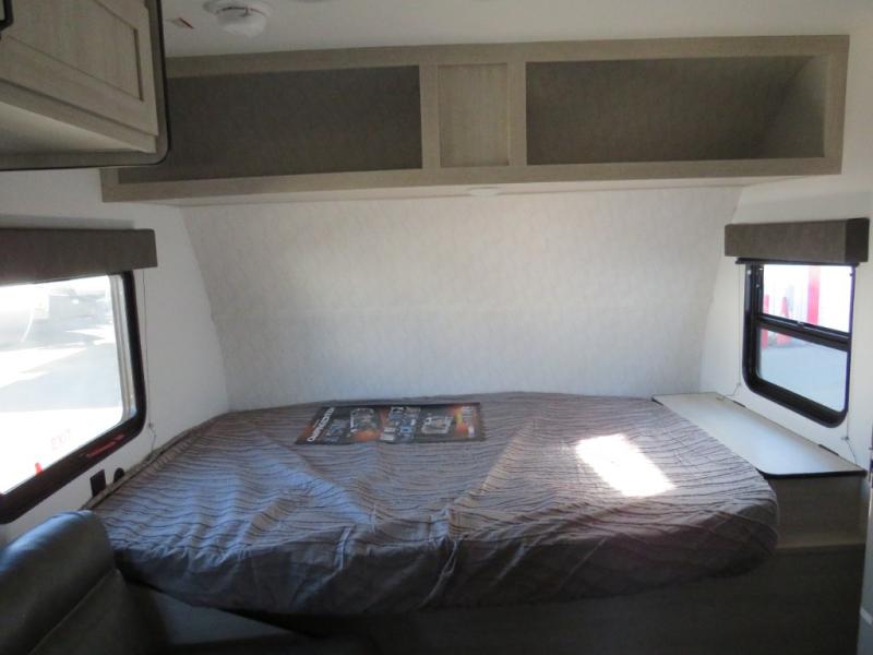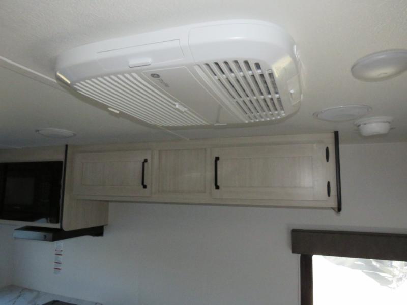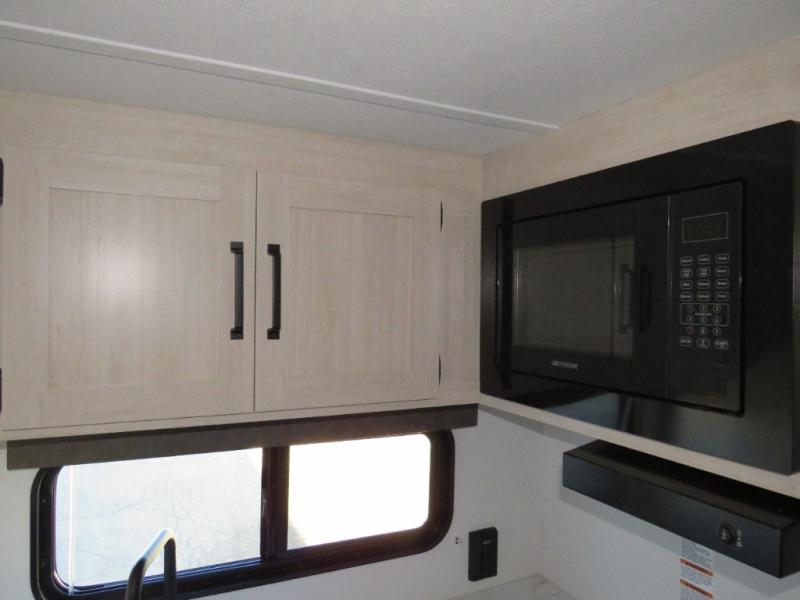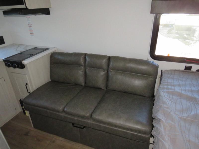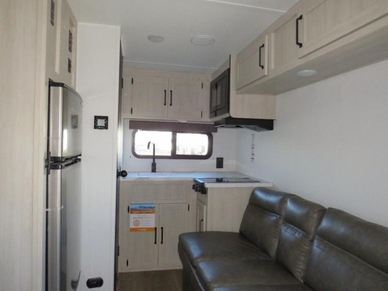It will be so easy to enjoy camping trips in this single axle travel trailer! There is an RV queen bed up front with flip-up storage at the foot of the bed for your belongings, and any additional guests can sleep on the sofa. A full kitchen includes a two-burner cooktop and microwave to cook meals each day, and the 12V black glass refrigerator will keep your food fresh. And a private bath with a toilet and shower will let you freshen up without having to use the camp's facilities!