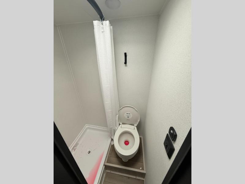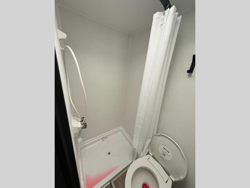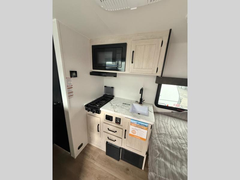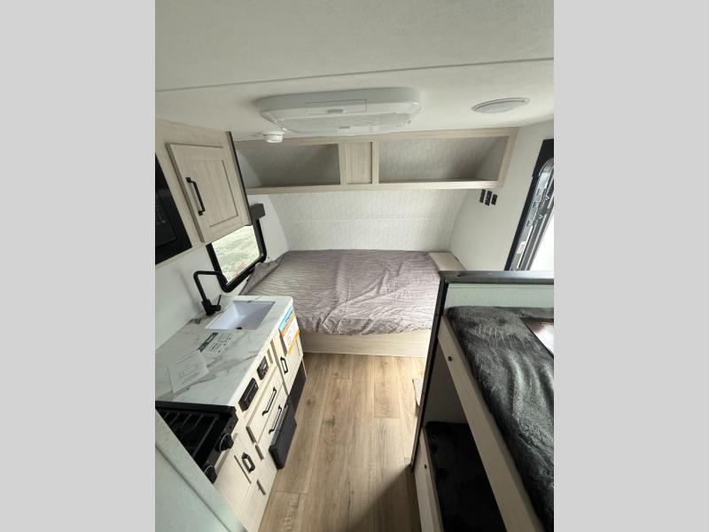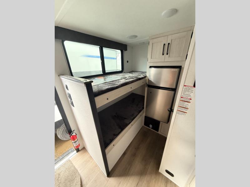 It will be so easy to enjoy camping trips in this single axle travel trailer! There is a front RV queen bed with flip-up storage at the foot of the bed for your belongings, and any additional guests can sleep on the 28" x 69" bunk beds. A full kitchen includes a two-burner cooktop and microwave to cook meals each day, and the 12V black glass refrigerator will keep your food fresh. And a private bath with a toilet and shower will let you freshen up without having to use the camp's facilities!