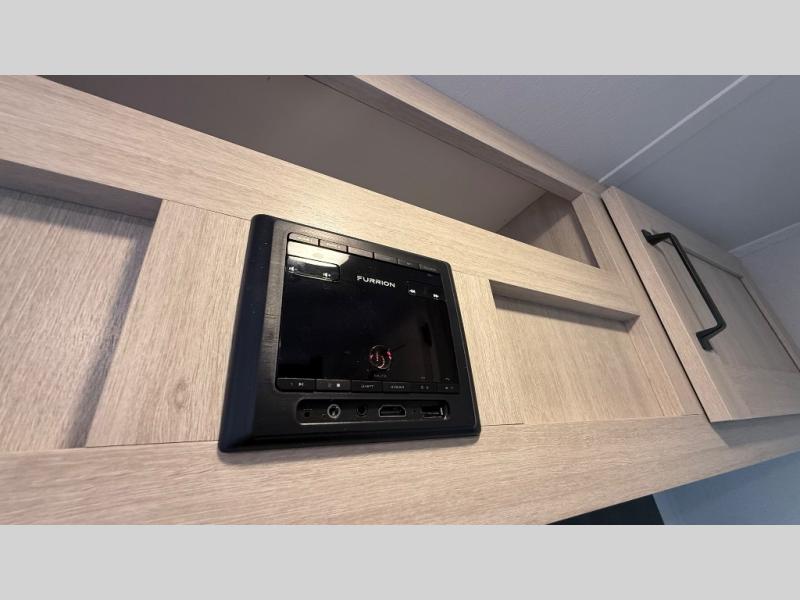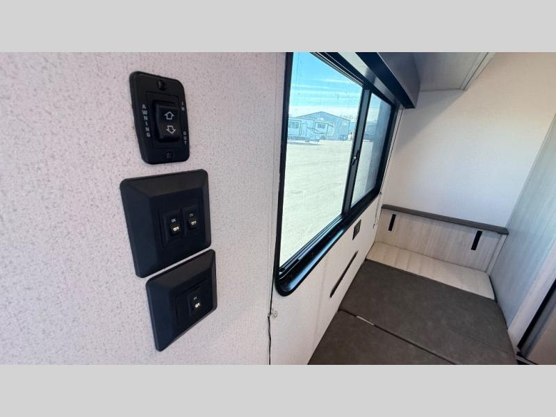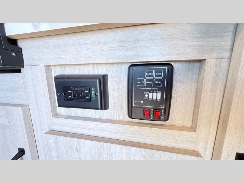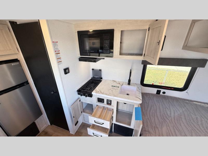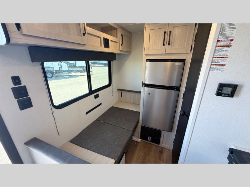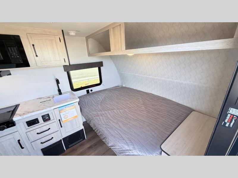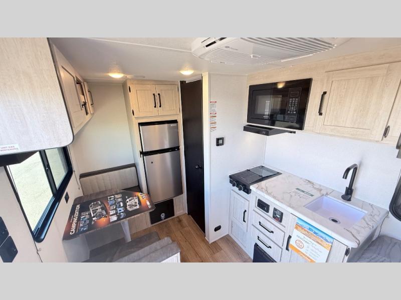 It will be so easy to enjoy camping trips in this single axle travel trailer! There is a front RV queen bed with flip-up storage at the foot of the bed for your belongings, and any additional guests can sleep on the booth dinette with an open shelf above. A full kitchen includes a two-burner cooktop and microwave to cook meals each day, and the 12V black glass refrigerator will keep your food fresh. And a private bath includes a 24" x 32" shower to clean off after a day outdoors!