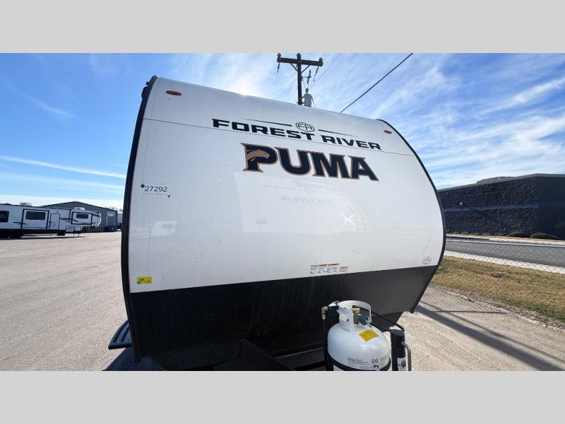 The Puma Camping Edition by Forest River offer an affordable travel trailer for rookie campers or seasoned RVers! They are built with 5/8" tongue and groove plywood flooring and a front diamond plate for added protection. There are also exterior magnetic baggage door latches, back up camera prep, a battery disconnect. Head inside to find Thermofoil countertops with a smooth drop edge, bedroom USB ports and outlets, and pleated shades in the living room.