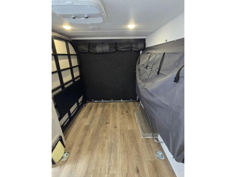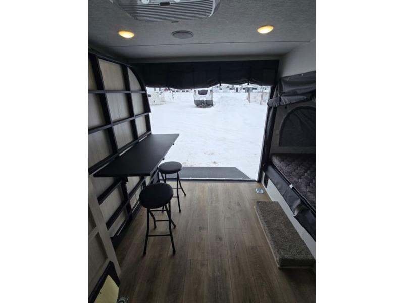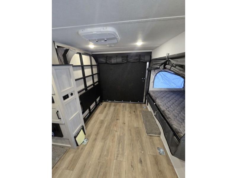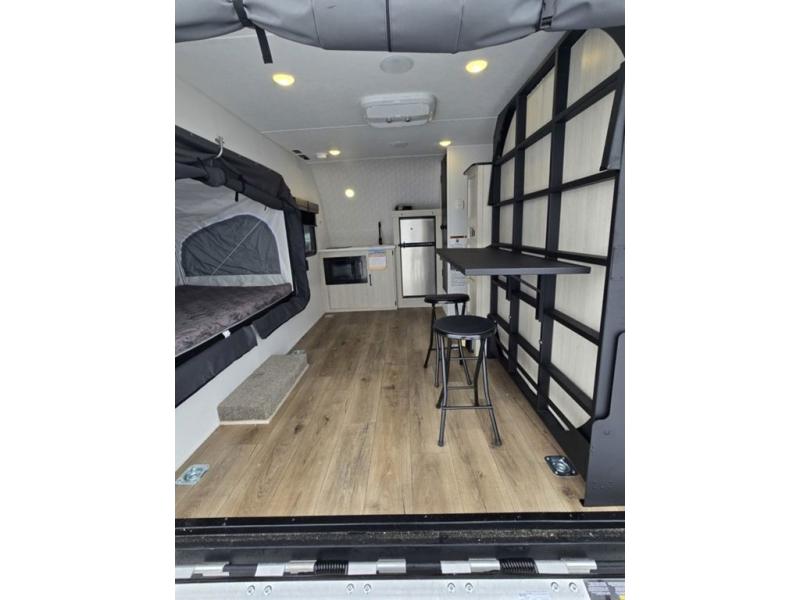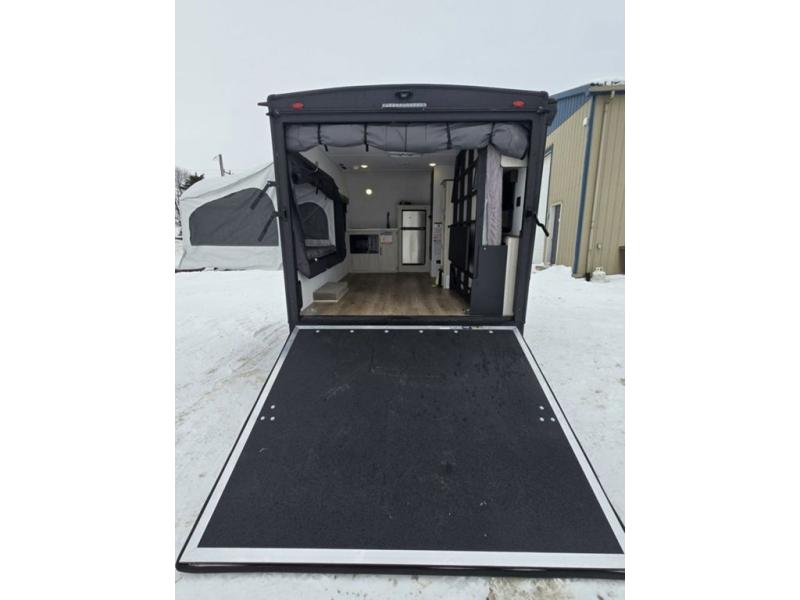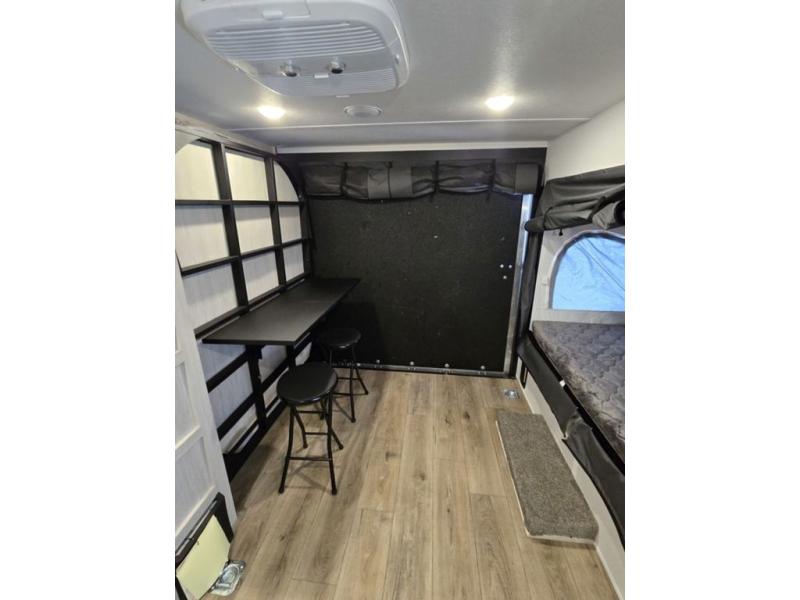 The outdoor enthusiast has met their match with this lightweight toy hauler. Once you've unloaded your bikes or kayaks using the ramp door, you can take a rest on the 54" x 74" Murphy bed, make lunch in the front corner kitchen, or freshen up in the 23" x 38" shower combo! And an optional fold-out tent bed is available if you're needing additional sleeping space!