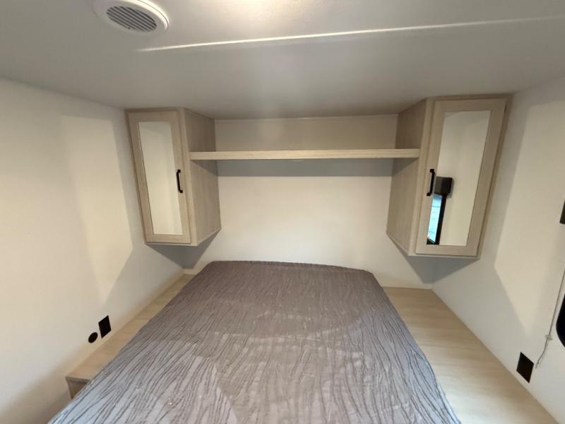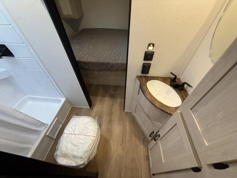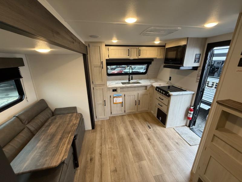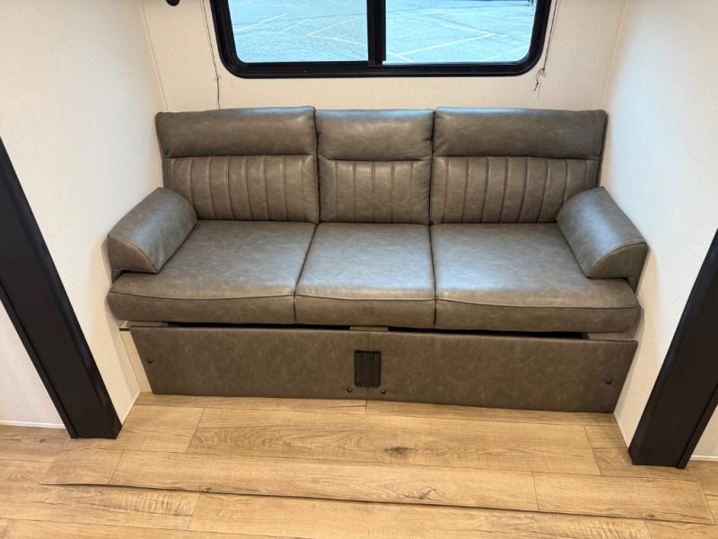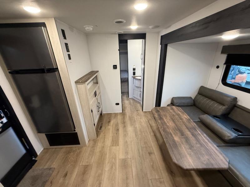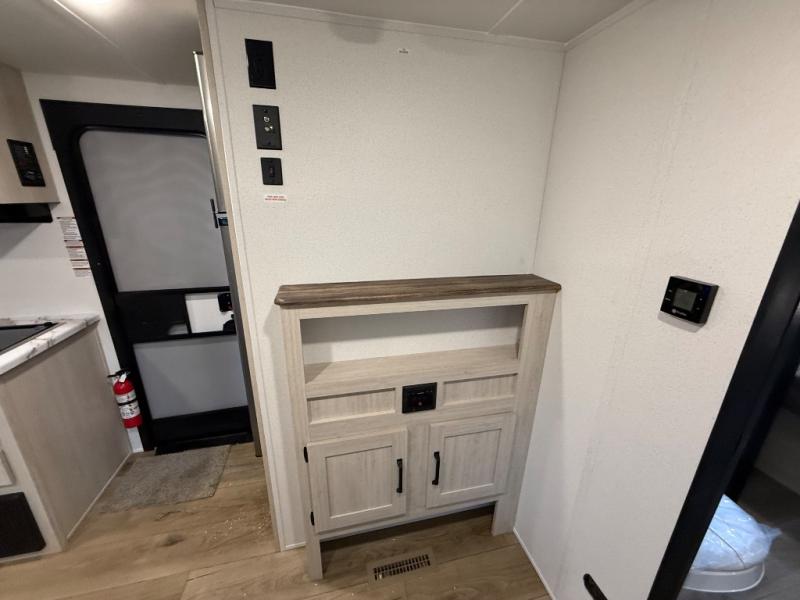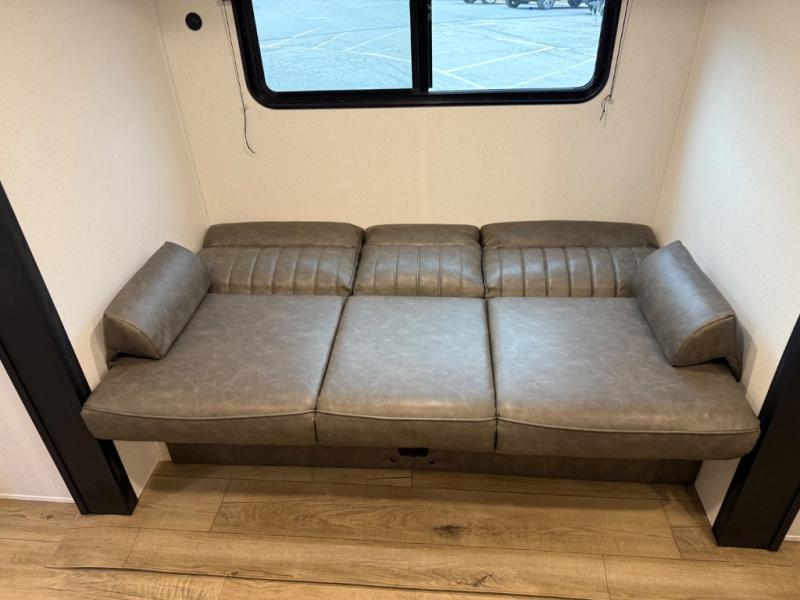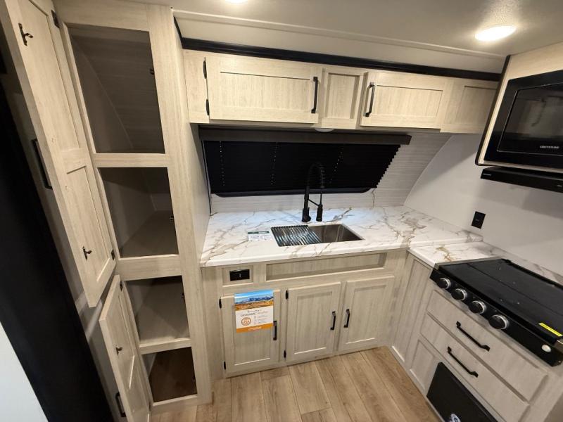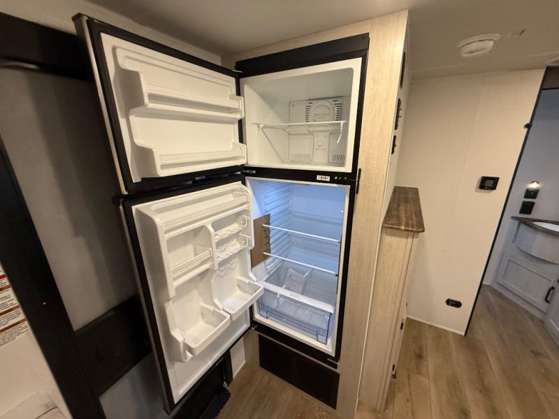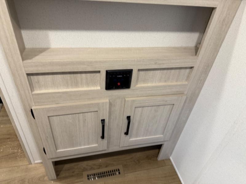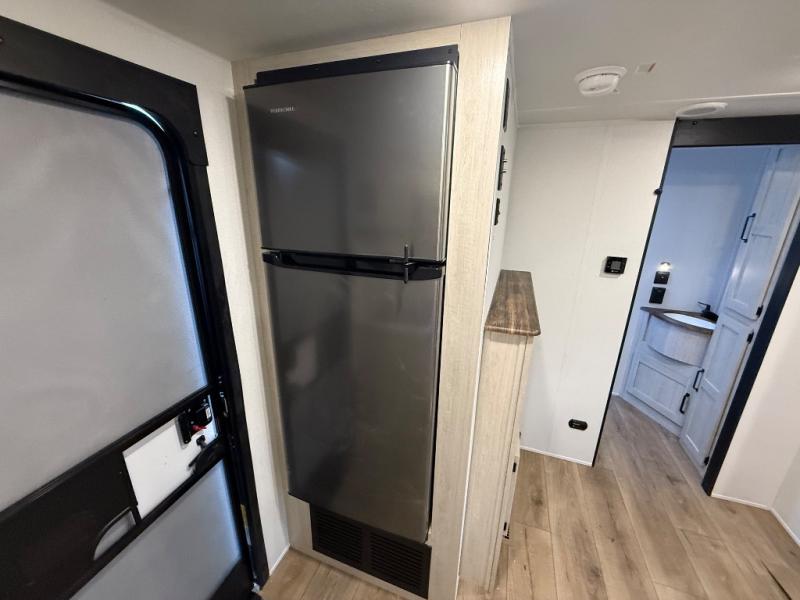 You'll love every minute in this front kitchen travel trailer. There is ample counter space to prep meals, a three-burner cooktop, a microwave oven, plus a 12V refrigerator and pantry for food storage. A sofa slide out with a table provides a place to dine and relax each evening, and there is an entertainment center with a fireplace to make your space cozier. Head through the full bath where you'll find the master bedroom, complete with an RV queen bed, dual shirt closets, and an optional TV!