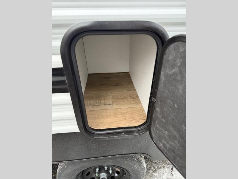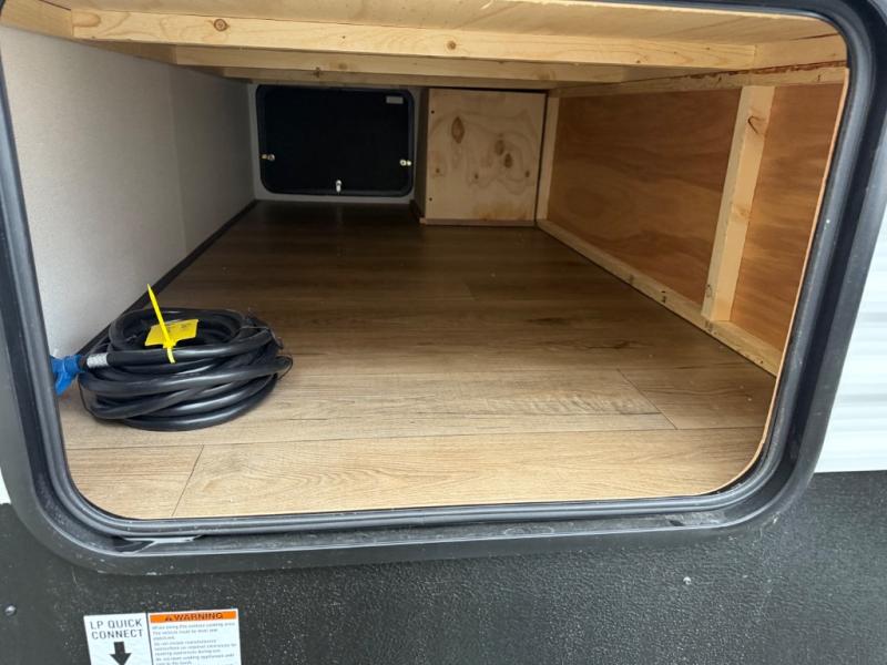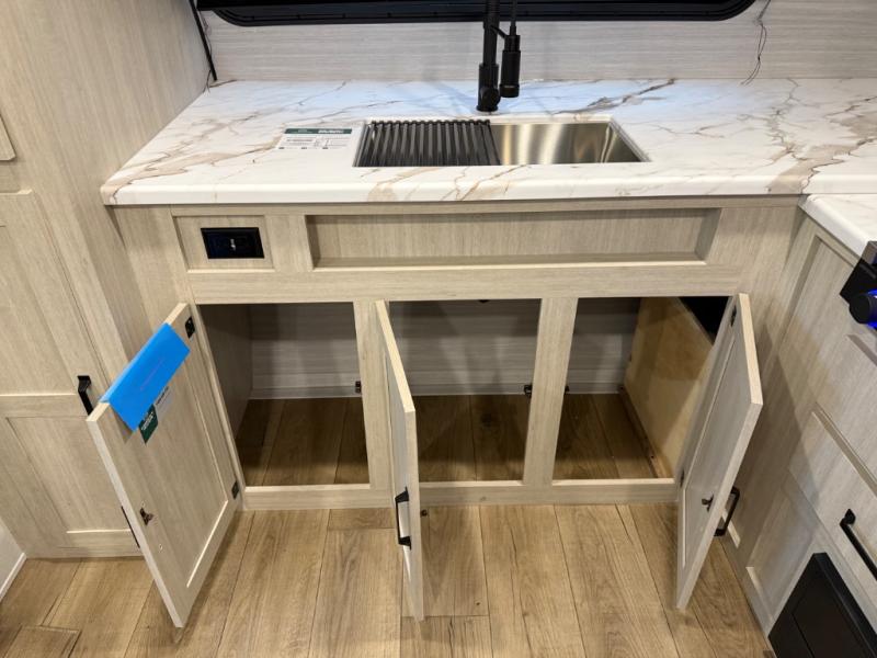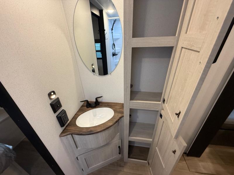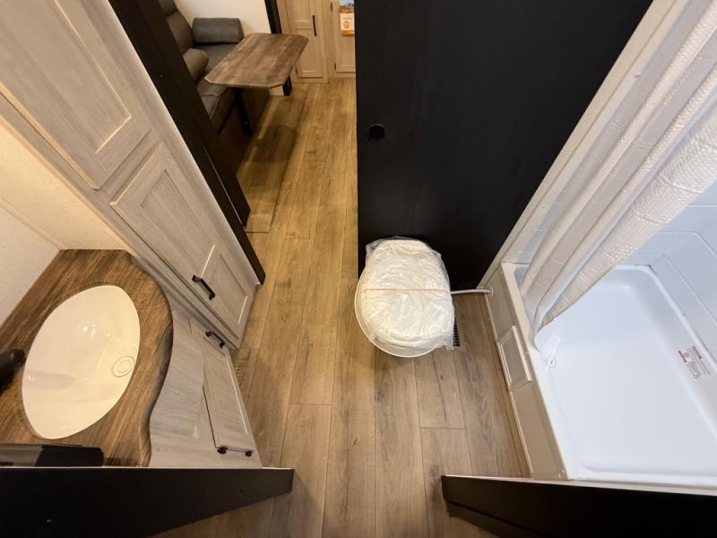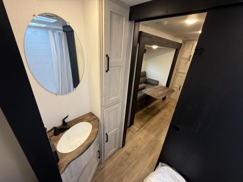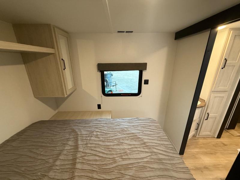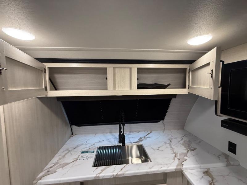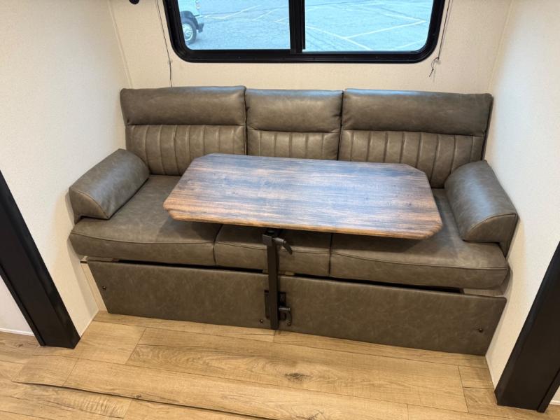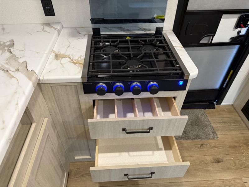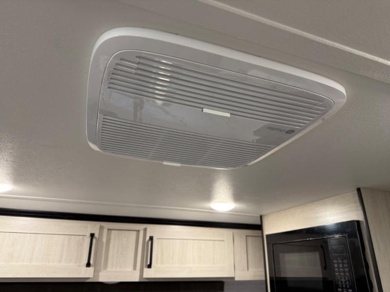 You'll love every minute in this front kitchen travel trailer. There is ample counter space to prep meals, a three-burner cooktop, a microwave oven, plus a 12V refrigerator and pantry for food storage. A sofa slide out with a table provides a place to dine and relax each evening, and there is an entertainment center with a fireplace to make your space cozier. Head through the full bath where you'll find the master bedroom, complete with an RV queen bed, dual shirt closets, and an optional TV!