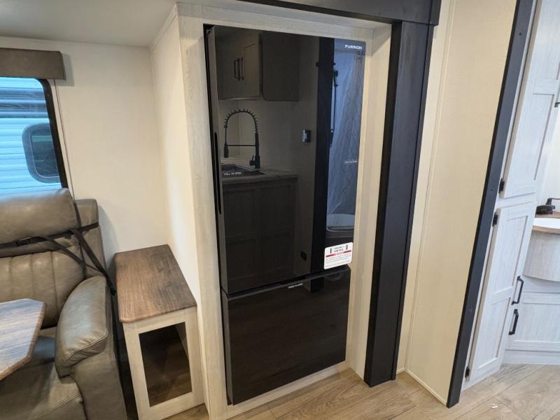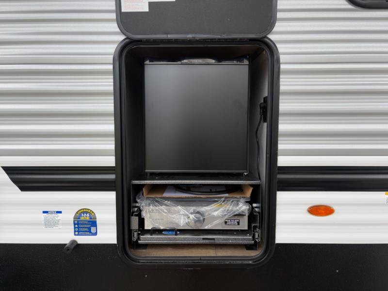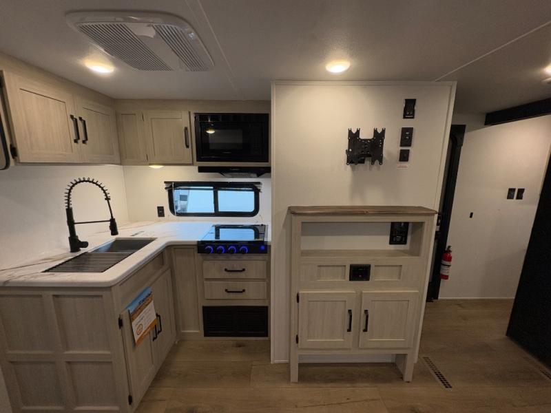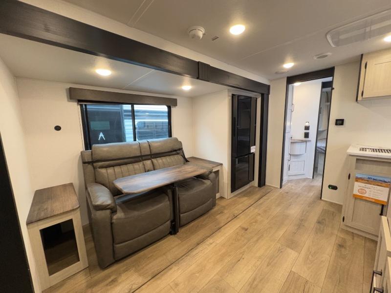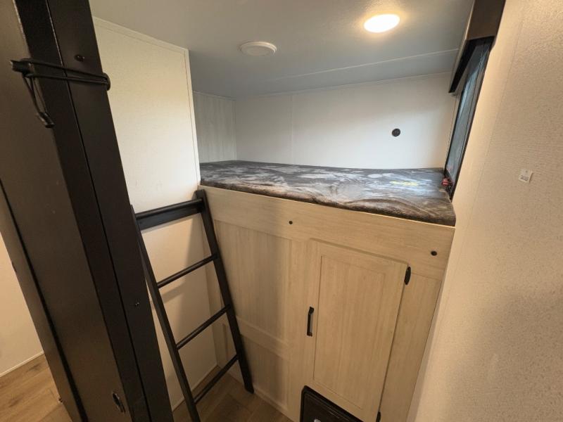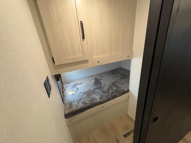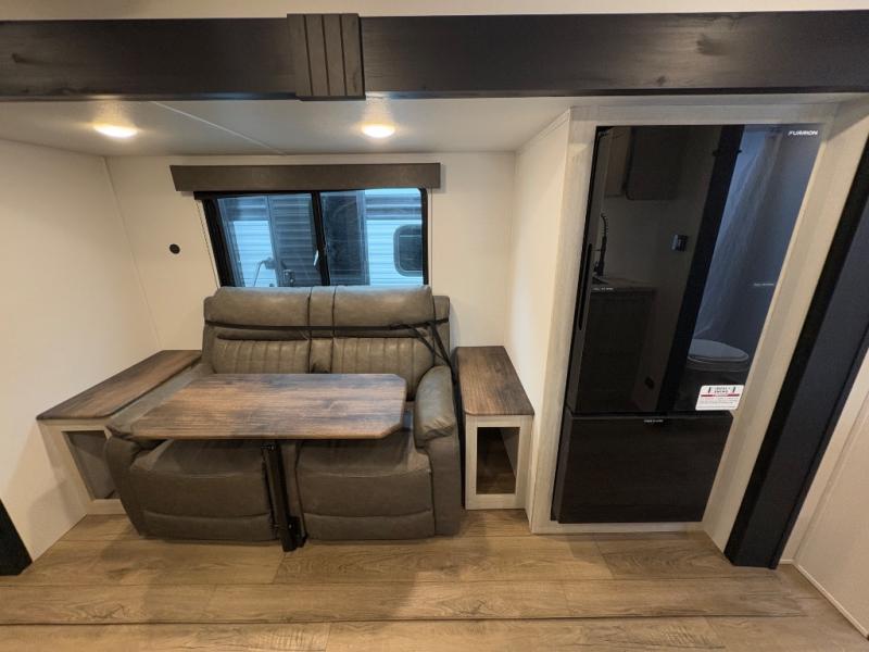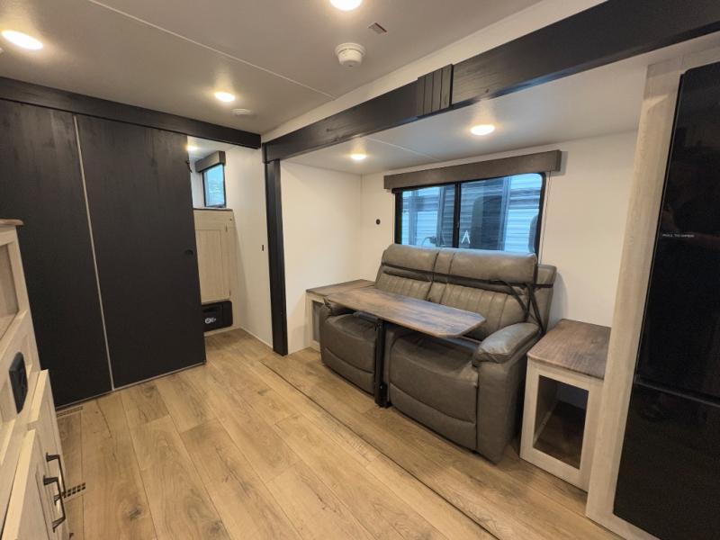 Your whole crew will love camping in this travel trailer since everyone can enjoy their own private space. The rear bunkhouses feature a private lower bunk room plus a private upper bunk room, each with their own door and a linen closet for storage space. The front master bedroom includes an RV queen bed, dual shirt closets, and easy access into the walk-thru bath. Head to the combined kitchen and living area to make dinner in the full kitchen, dine around the U-shaped dinette slide, and enjoy the fireplace! Outside, an optional mini kitchen with a griddle can be added if you choose, and you'll find outside storage compartments to keep all your gear secure!