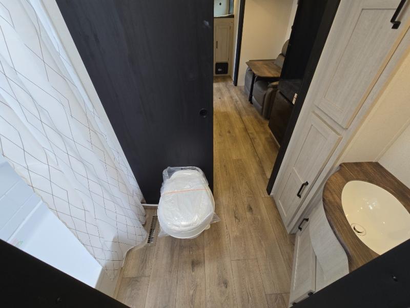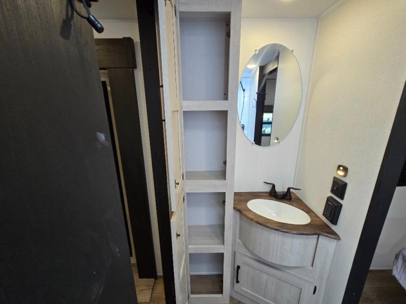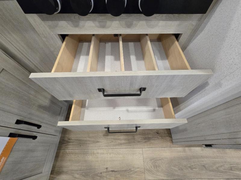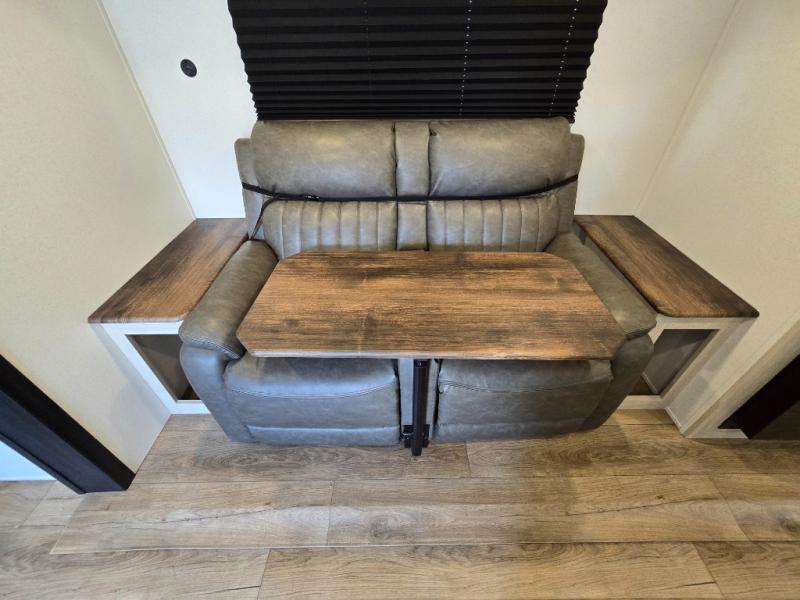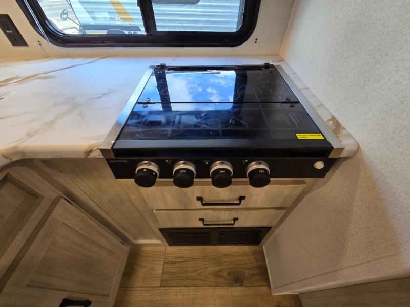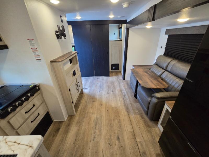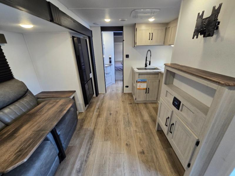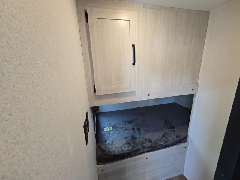 Your whole crew will love camping in this travel trailer since everyone can enjoy their own private space. The rear bunkhouses feature a private lower bunk room plus a private upper bunk room, each with their own door and a linen closet for storage space. The front master bedroom includes an RV queen bed, dual shirt closets, and easy access into the walk-thru bath. Head to the combined kitchen and living area to make dinner in the full kitchen, dine around the U-shaped dinette slide, and enjoy the fireplace! Outside, an optional mini kitchen with a griddle can be added if you choose, and you'll find outside storage compartments to keep all your gear secure!