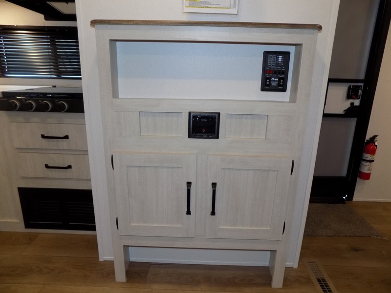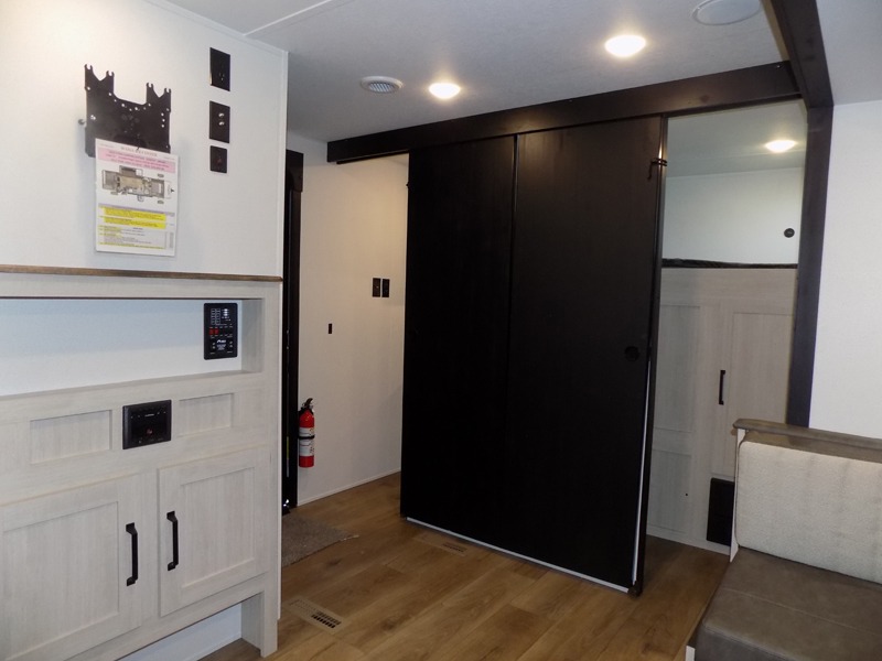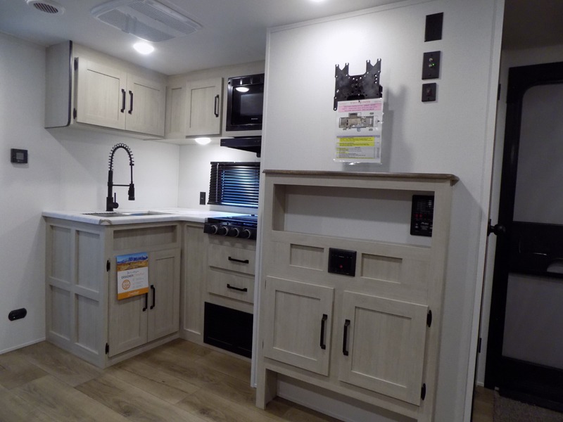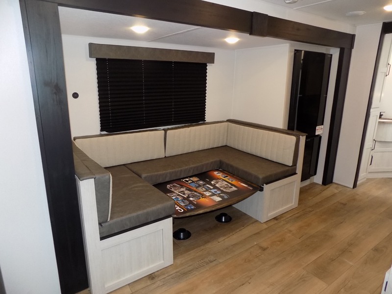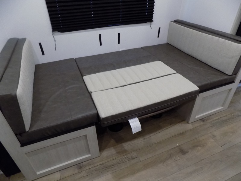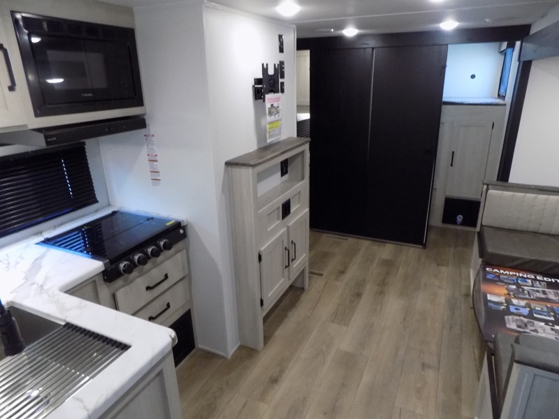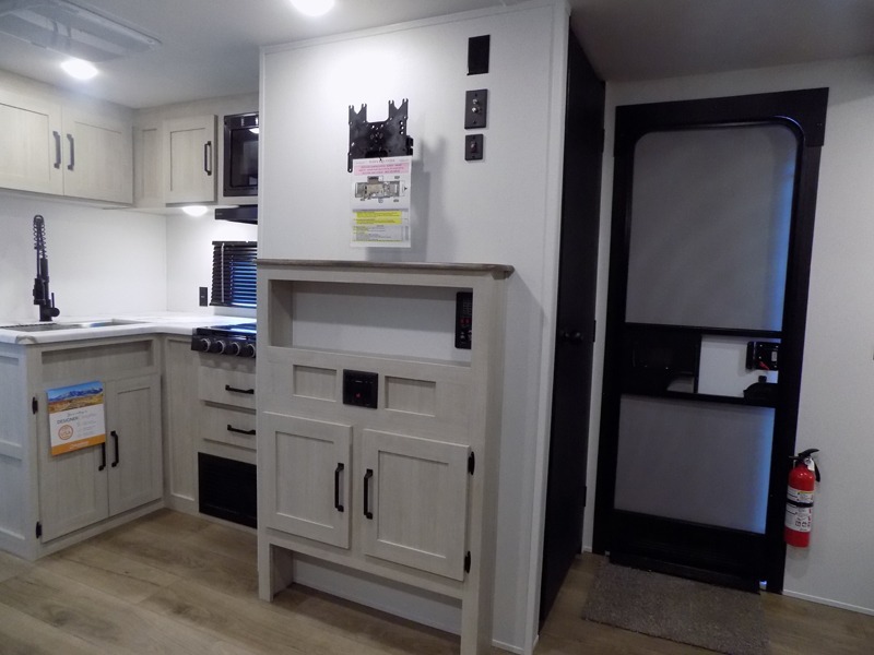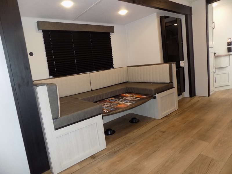 Your whole crew will love camping in this travel trailer since everyone can enjoy their own private space. The rear bunkhouses feature a private lower bunk room plus a private upper bunk room, each with their own door and a linen closet for storage space. The front master bedroom includes an RV queen bed, dual shirt closets, and easy access into the walk-thru bath. Head to the combined kitchen and living area to make dinner in the full kitchen, dine around the U-shaped dinette slide, and enjoy the fireplace! Outside, an optional mini kitchen with a griddle can be added if you choose, and you'll find outside storage compartments to keep all your gear secure!