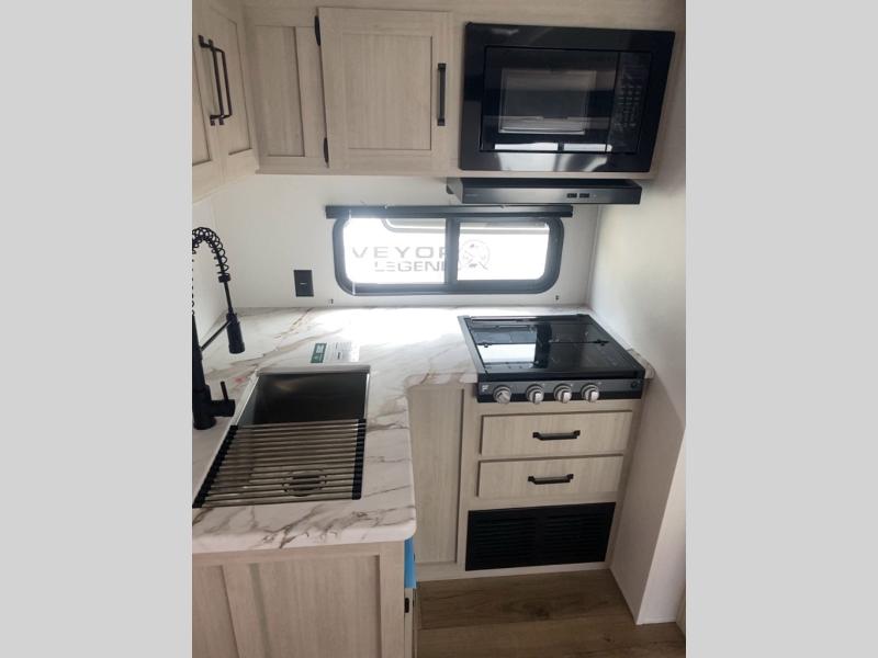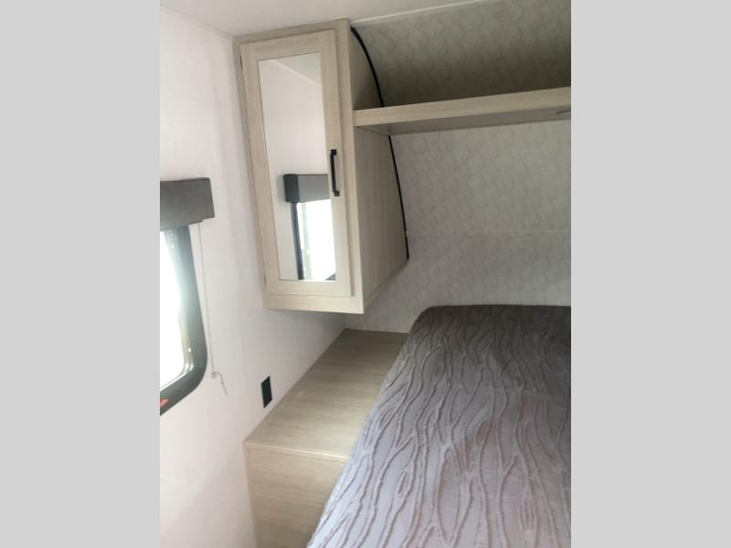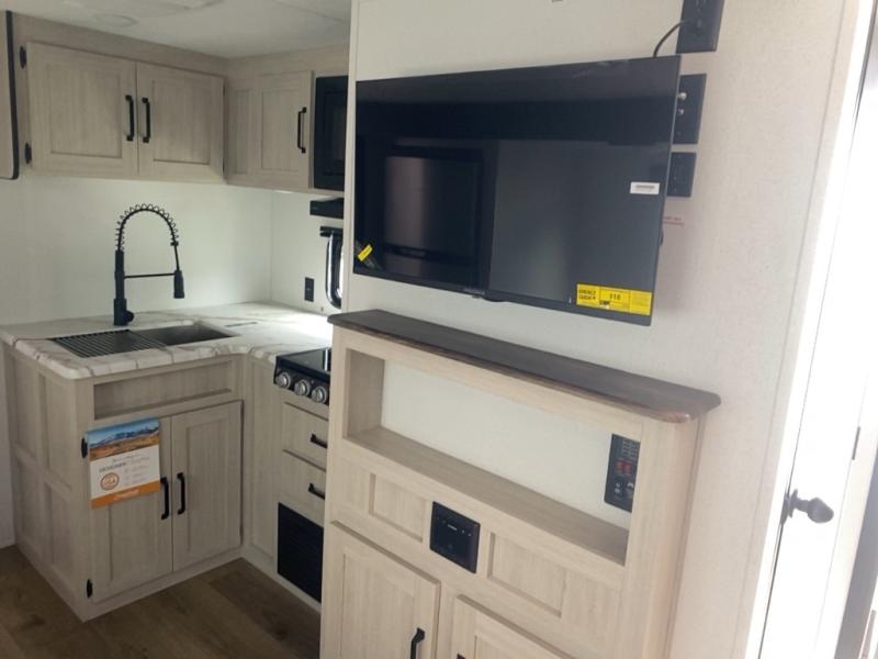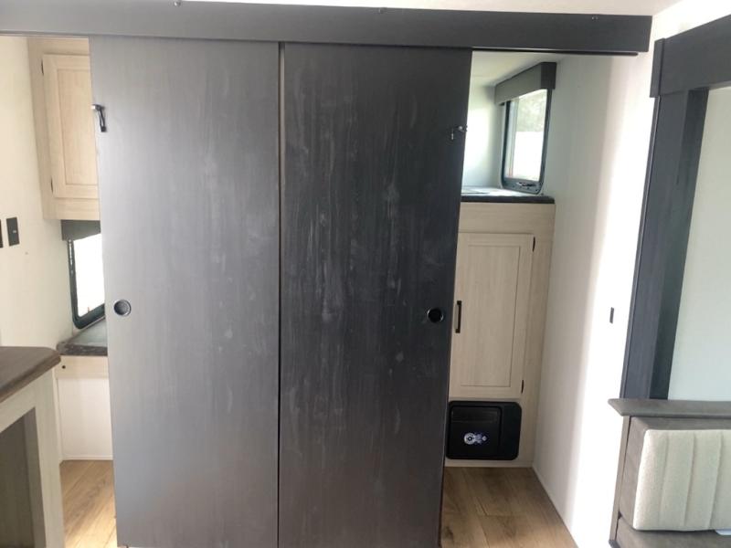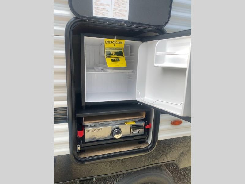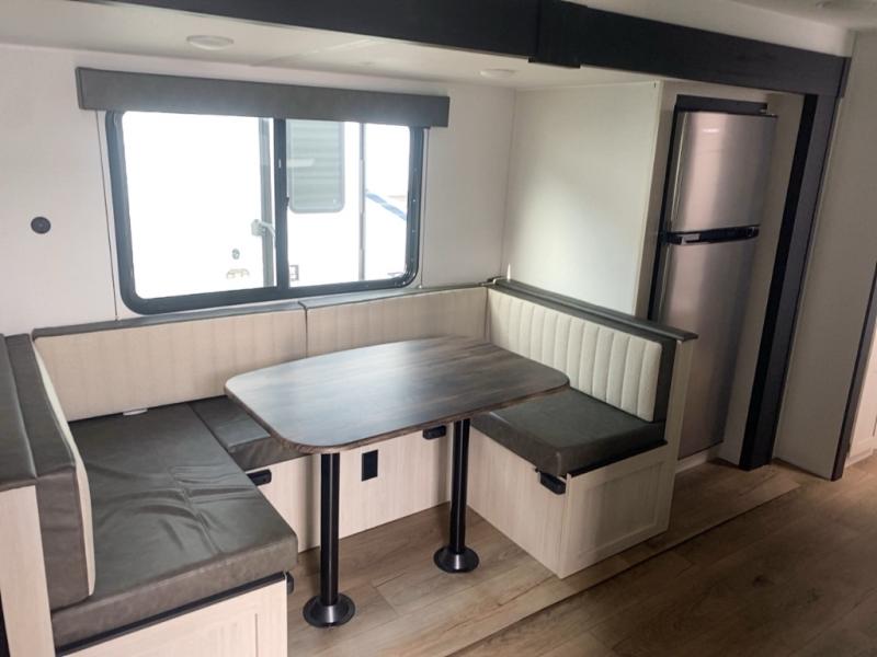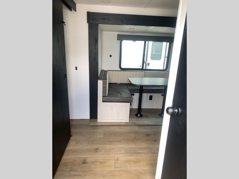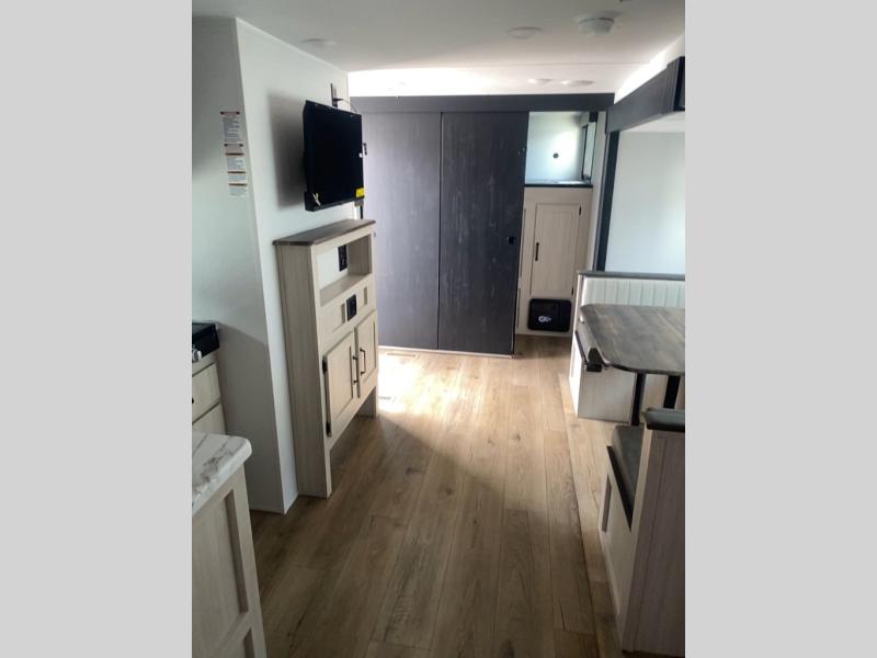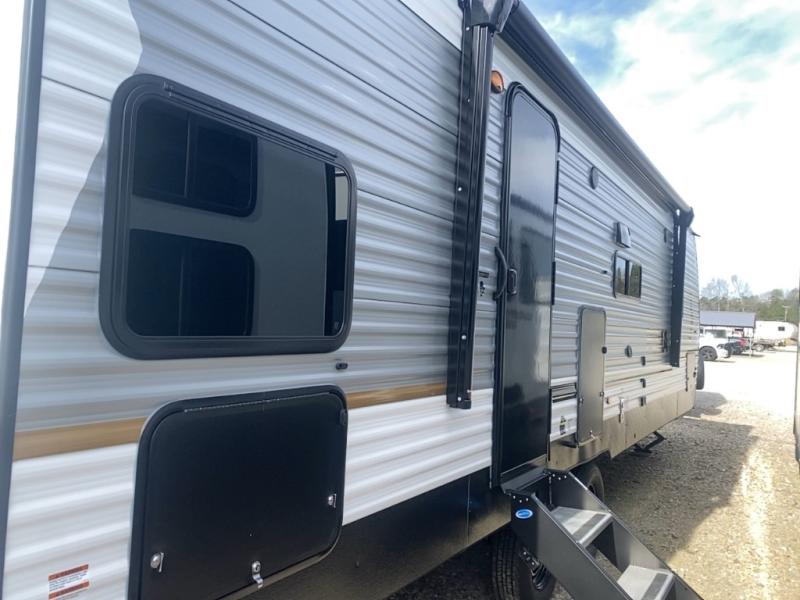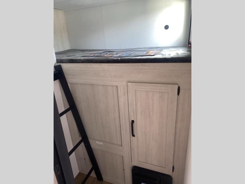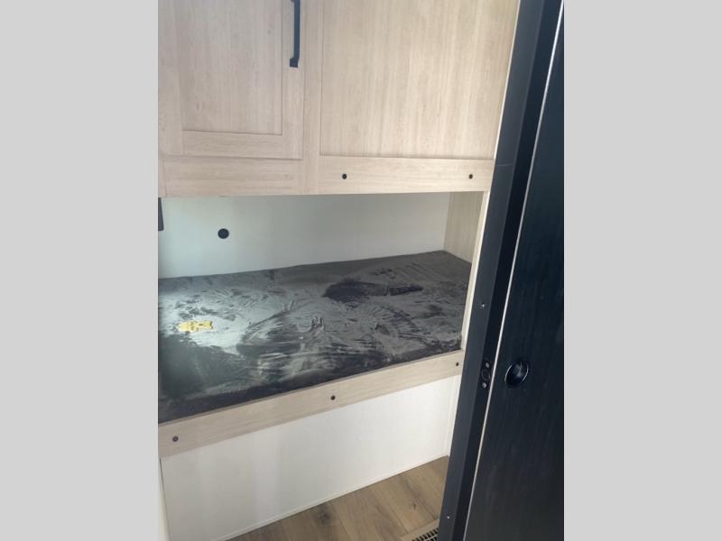 Your whole crew will love camping in this travel trailer since everyone can enjoy their own private space. The rear bunkhouses feature a private lower bunk room plus a private upper bunk room, each with their own door and a linen closet for storage space. The front master bedroom includes an RV queen bed, dual shirt closets, and easy access into the walk-thru bath. Head to the combined kitchen and living area to make dinner in the full kitchen, dine around the U-shaped dinette slide, and enjoy the fireplace! Outside, an optional micro kitchen with a grill can be added if you choose, and you'll find outside storage compartments to keep all your gear secure!