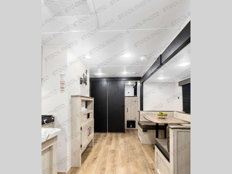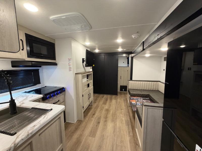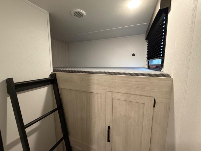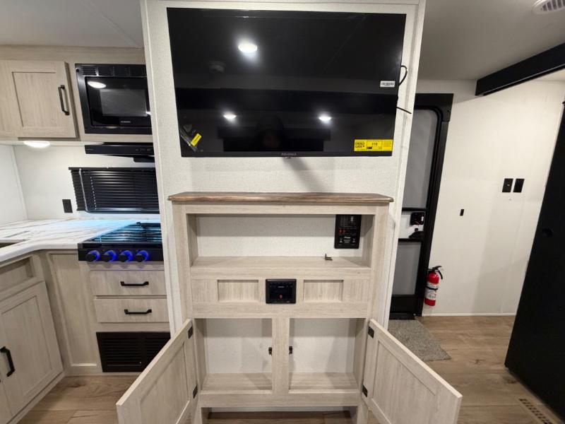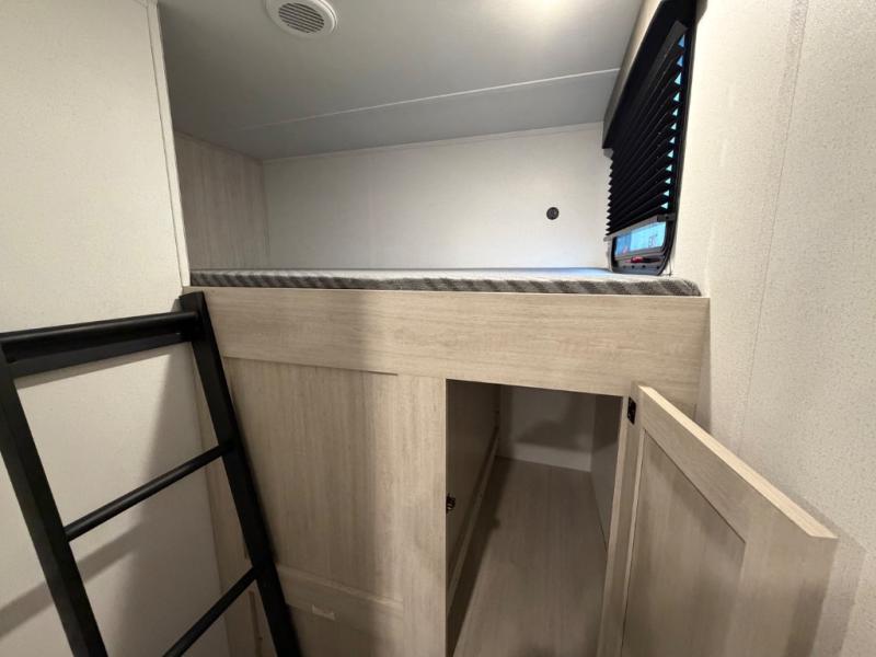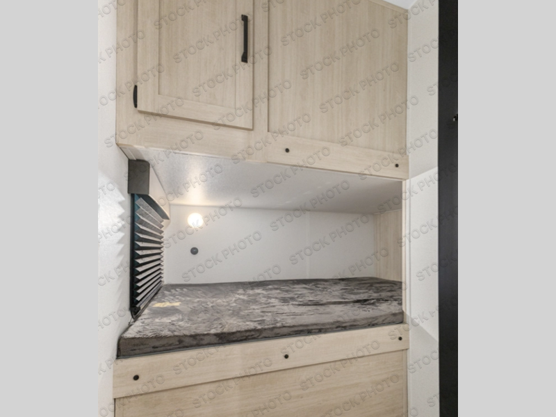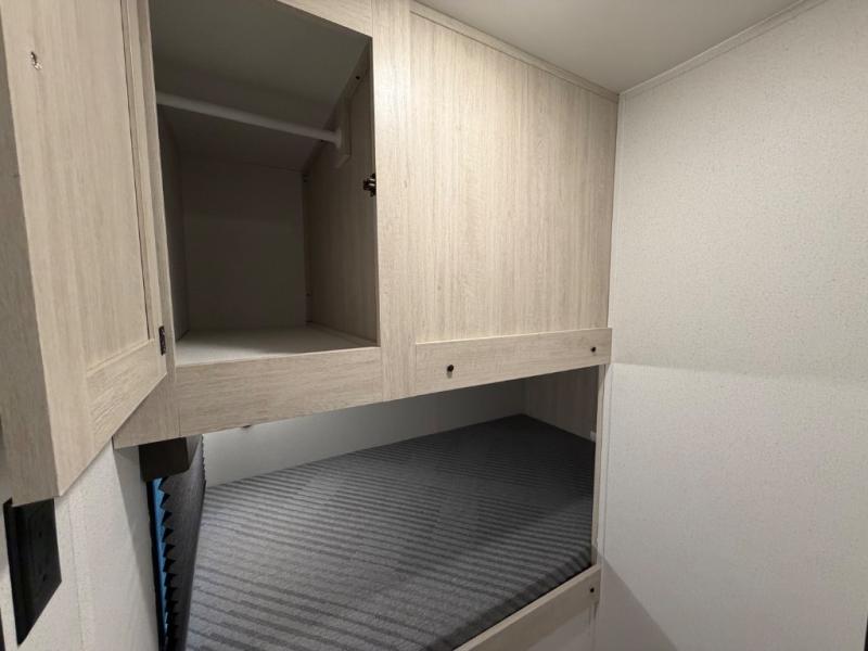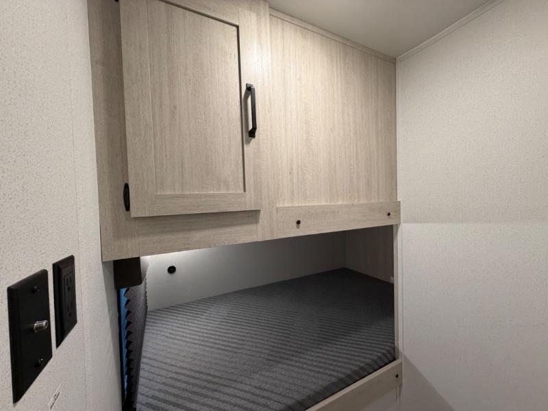 Your whole crew will love camping in this travel trailer since everyone can enjoy their own private space. The rear bunkhouses feature a private lower bunk room plus a private upper bunk room, each with their own door and a linen closet for storage space. The front master bedroom includes an RV queen bed, dual shirt closets, and easy access into the walk-thru bath. Head to the combined kitchen and living area to make dinner in the full kitchen, dine around the U-shaped dinette slide, and enjoy the fireplace! Outside, an optional micro kitchen with a grill can be added if you choose, and you'll find outside storage compartments to keep all your gear secure!