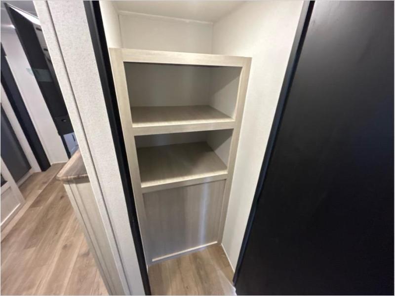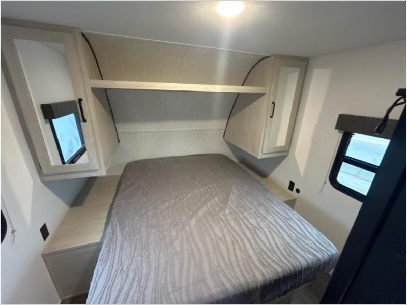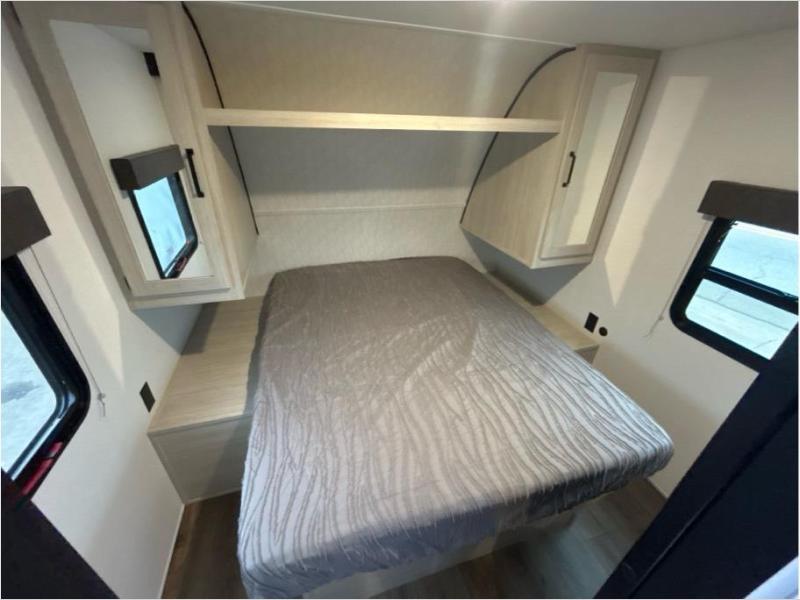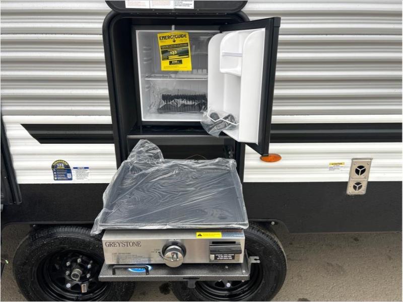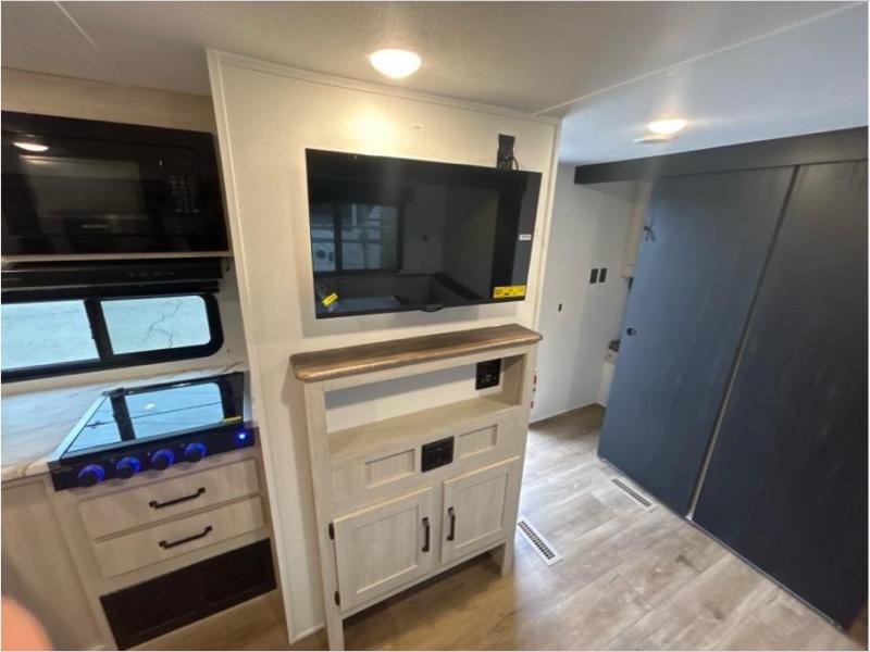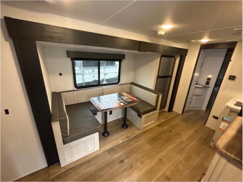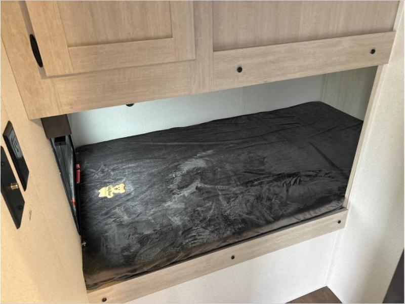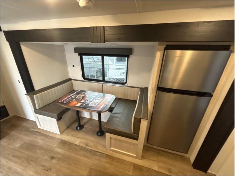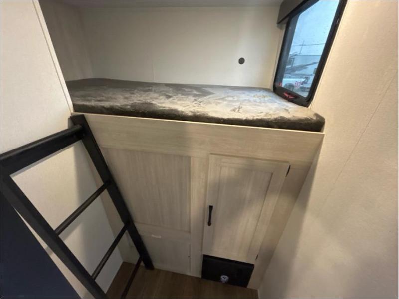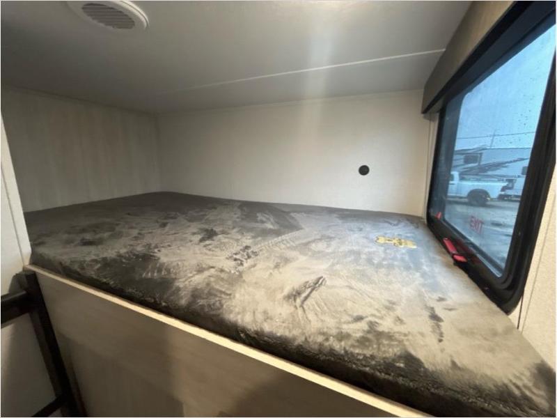 Your whole crew will love camping in this travel trailer since everyone can enjoy their own private space. The rear bunkhouses feature a private lower bunk room plus a private upper bunk room, each with their own door and a linen closet for storage space. The front master bedroom includes an RV queen bed, dual shirt closets, and easy access into the walk-thru bath. Head to the combined kitchen and living area to make dinner in the full kitchen, dine around the U-shaped dinette slide, and enjoy the fireplace! Outside, an optional micro kitchen with a grill can be added if you choose, and you'll find outside storage compartments to keep all your gear secure!