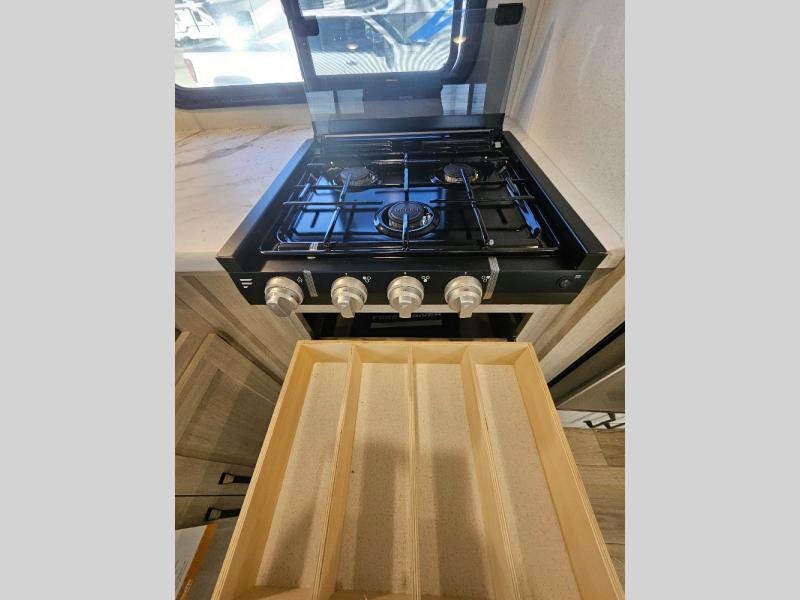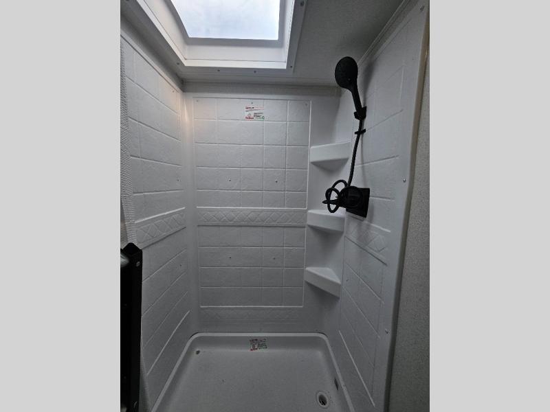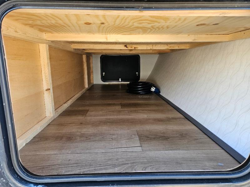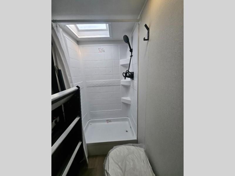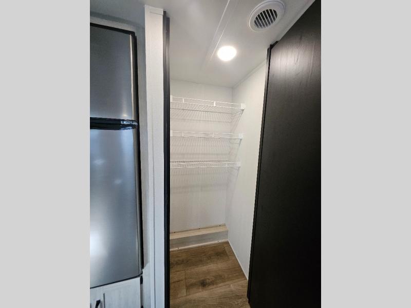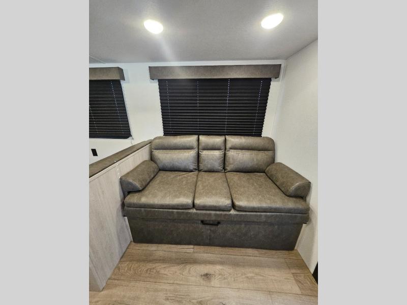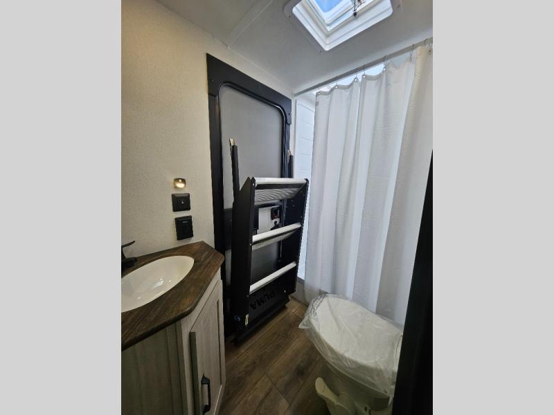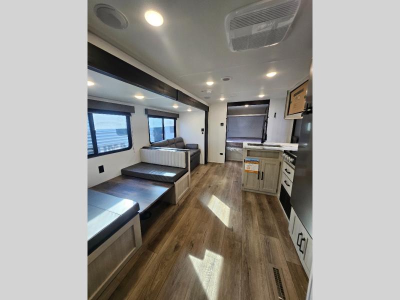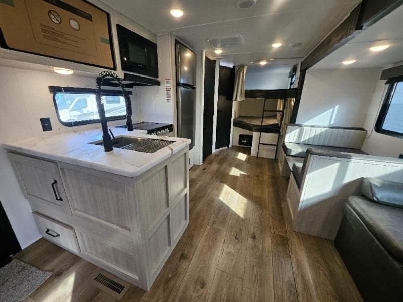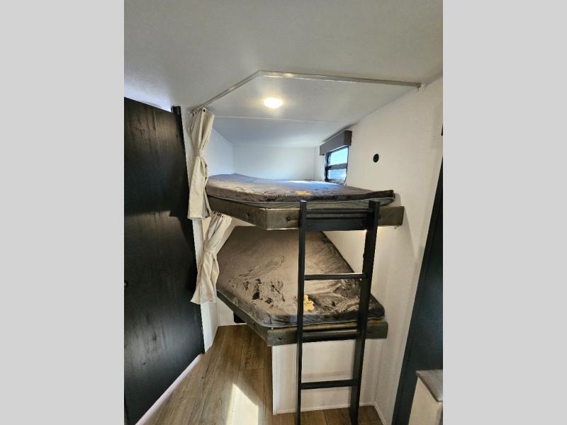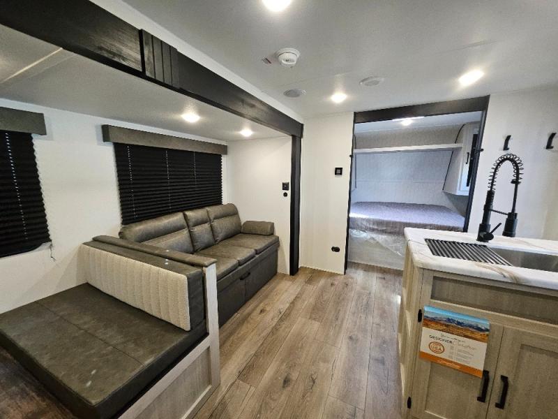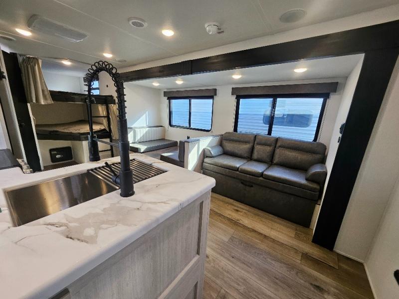 If you're looking for more space, this double axle unit features a large slide so you can walk about freely. Here, you'll find the booth dinette and sofa, which sit across from the optional TV if you want to enjoy movie nights. The full kitchen includes a microwave and three burner cooktop to make meals, plus a pantry and 12V refrigerator for food storage. There is even washer and dryer prep in the pantry if you choose to add these appliances. The kids or your guests will love the double-size bunks, and the full bath right beside the bunks includes one of the dual entry doors so you can easily get back out to the fun!
